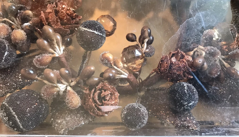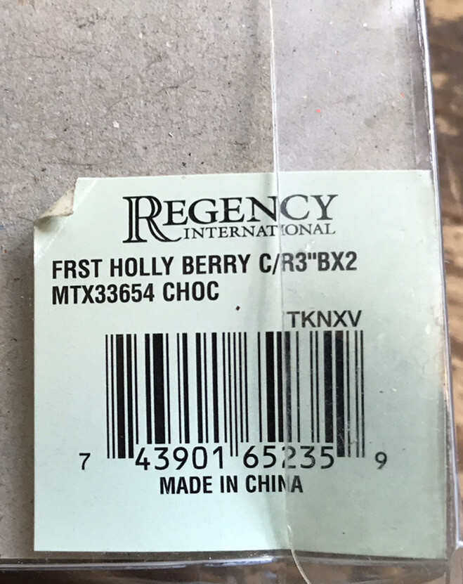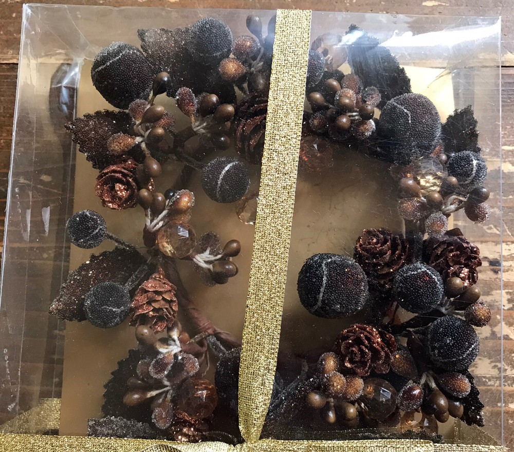 Set of 2 Regency International Frst Holly Berry Chocolate Colored Mini Wreaths. Each Wreath Measures Approximately: 6-1/2” diameter There is some damage to the box and some discoloration on the cardboard insert. Please see photos.