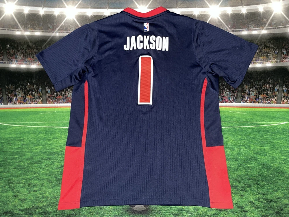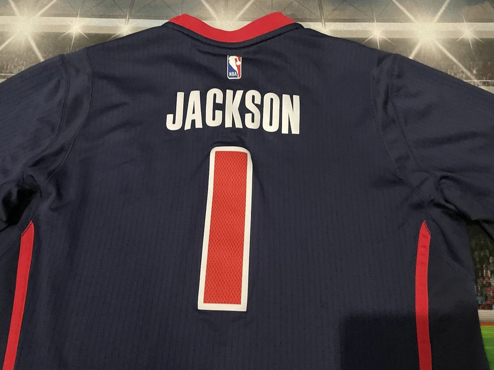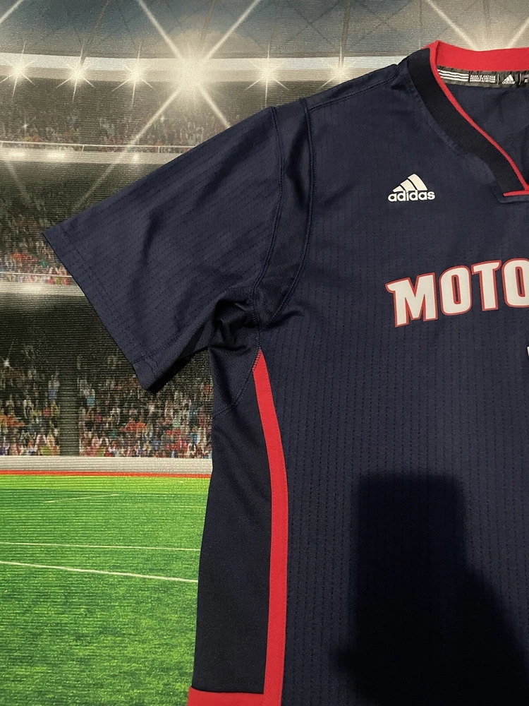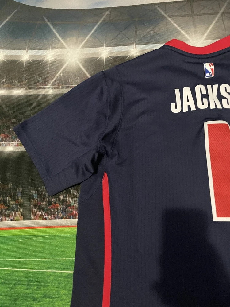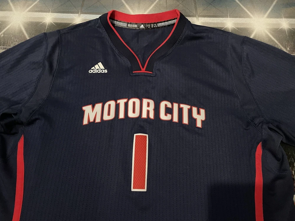 Show your love for the Detroit Pistons with this Reggie Jackson #1 Motor City Adidas Swingman Jersey. Made for basketball fans, this original and authentic jersey is perfect for anyone who wants to support their favorite team. The jersey features the Adidas logo, as well as the Detroit Pistons emblem, making it a must-have for any true fan. This jersey is size XL and has been previously worn, adding character and style to your wardrobe. It's perfect for game day or everyday wear, and is sure to make a statement wherever you go. Get your hands on this unique piece of fan apparel and show your love for the Pistons today!