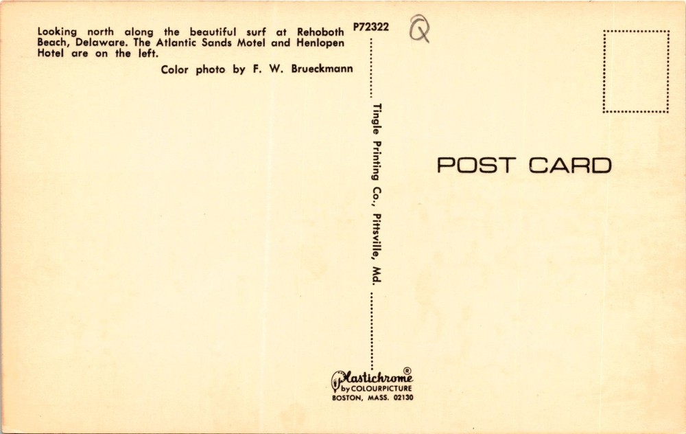 MAKE AN OFFER. THE MORE YOU BUY THE BETTER DEAL I WILL ACCEPT This postcard features a color photo taken by F. W. Brueckmann, showing a view looking north along the surf at Rehoboth Beach, Delaware. The Atlantic Sands Motel and Henlopen Hotel can be seen on the left side of the image. The postcard was printed by Tingle Printing Co.