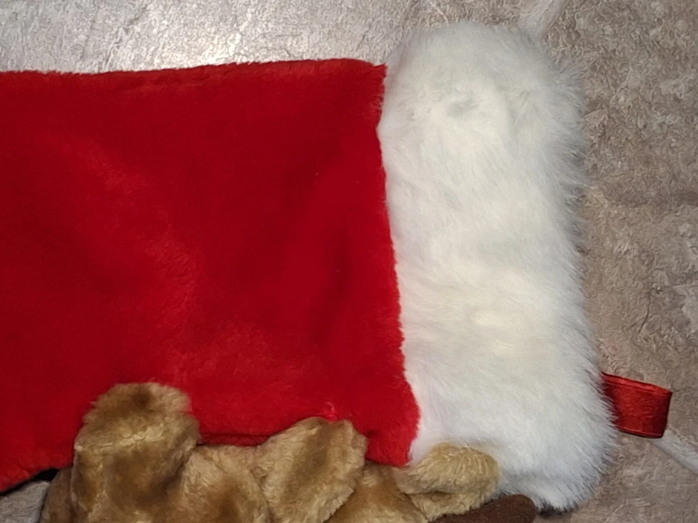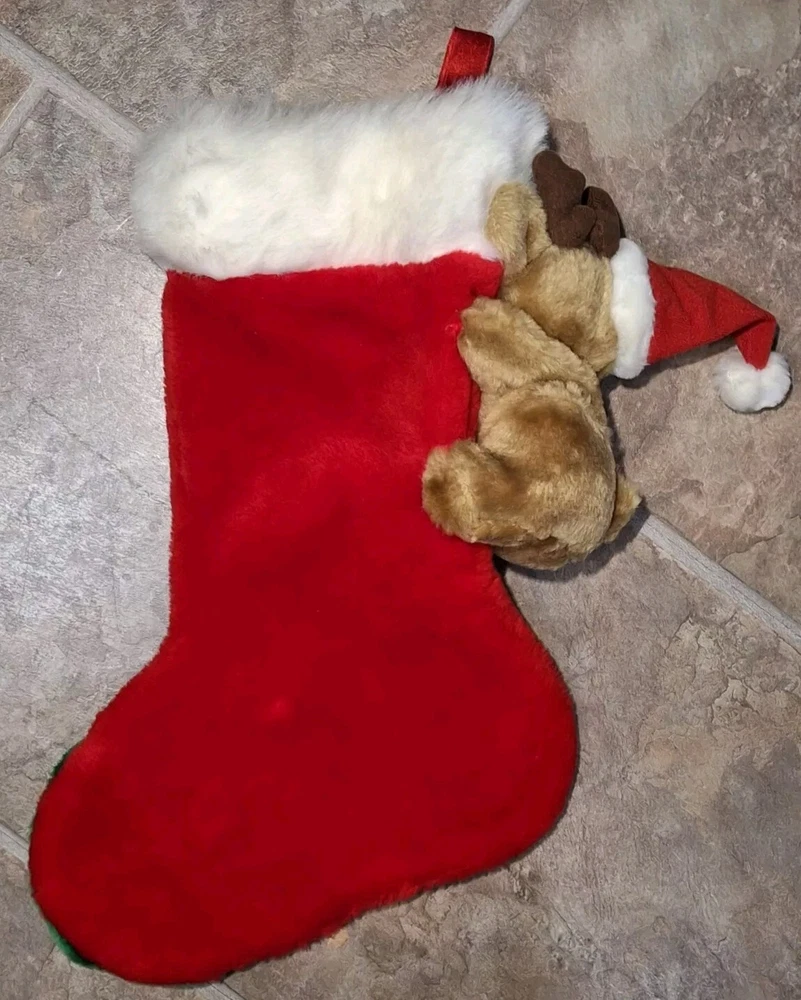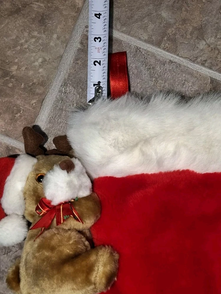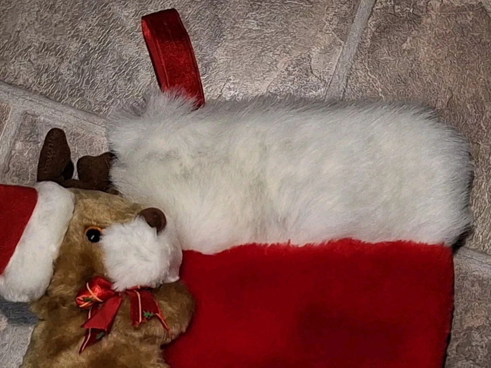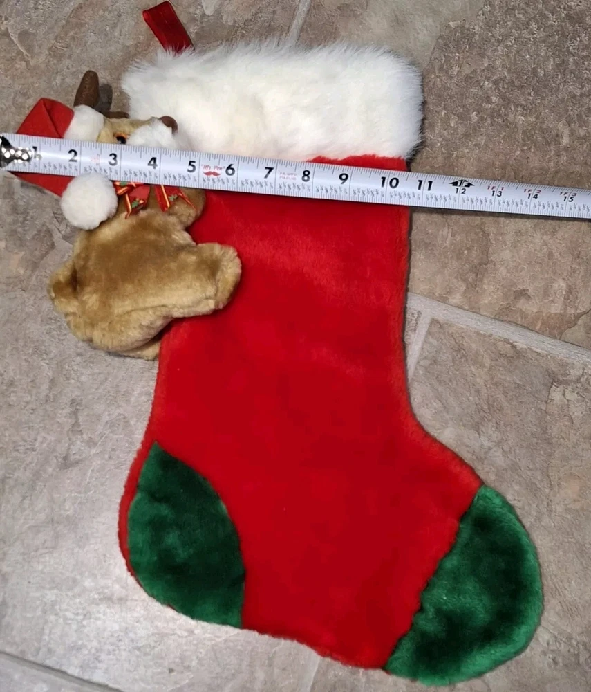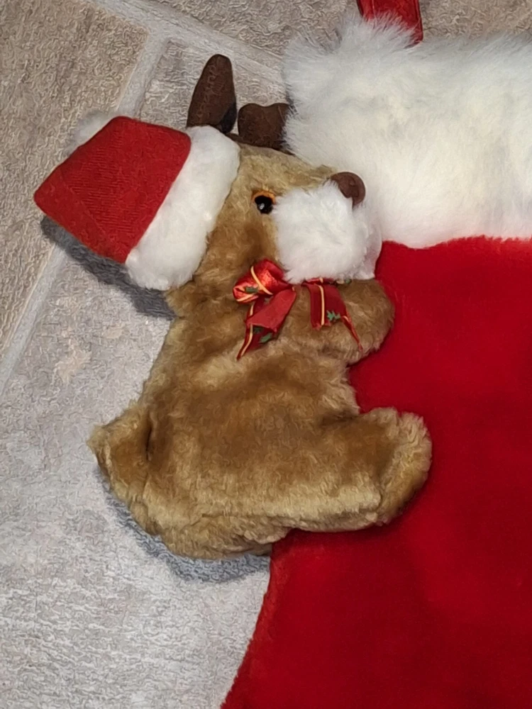 Theme: Christmas Type: Christmas Stocking gtin13: Does not apply Brand: Unbranded Size: Large Subject: Reindeer Character: Reindeer, Rudolph Set Includes: Christmas Stocking, Reindeer plush Vintage: Yes Color: Multicolor Occasion: Christmas Features: Plush Shape: Reindeer Material: Fabric UPC: Does not apply