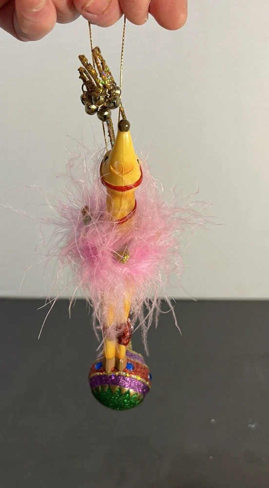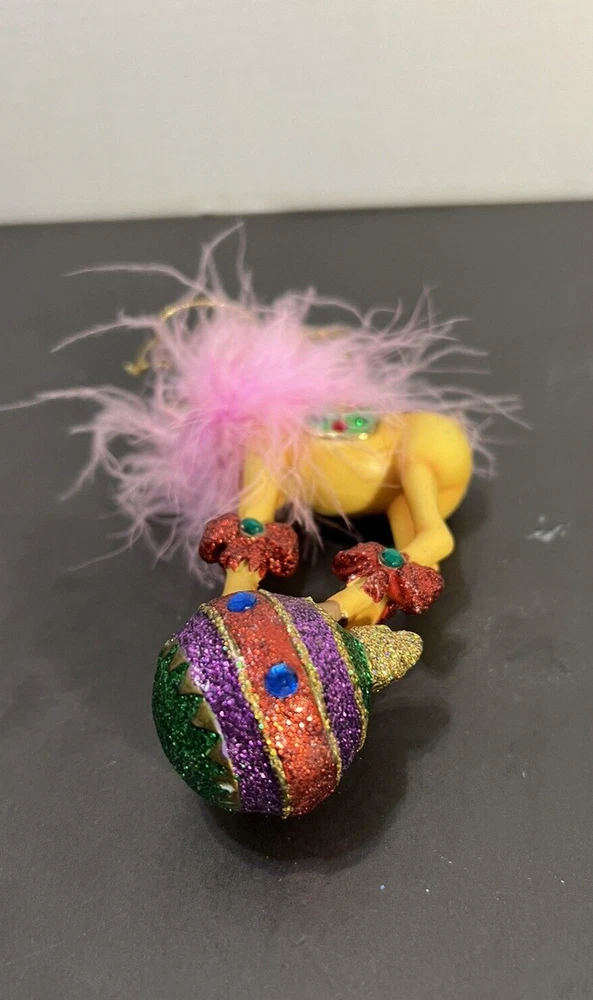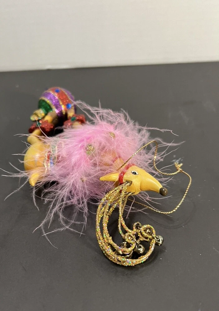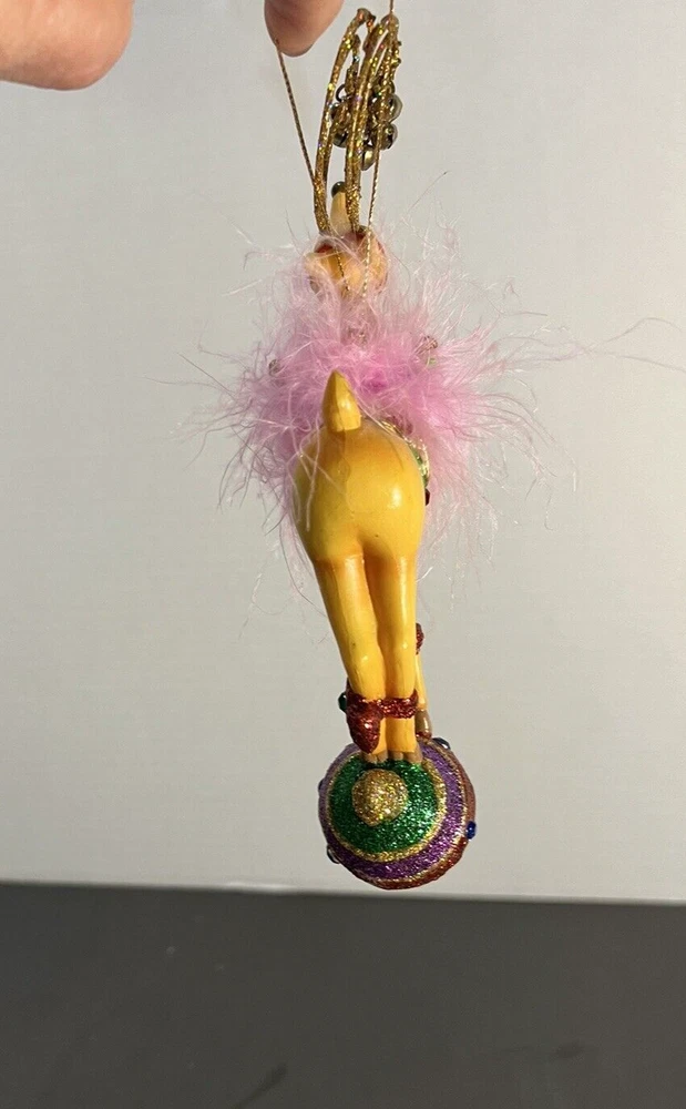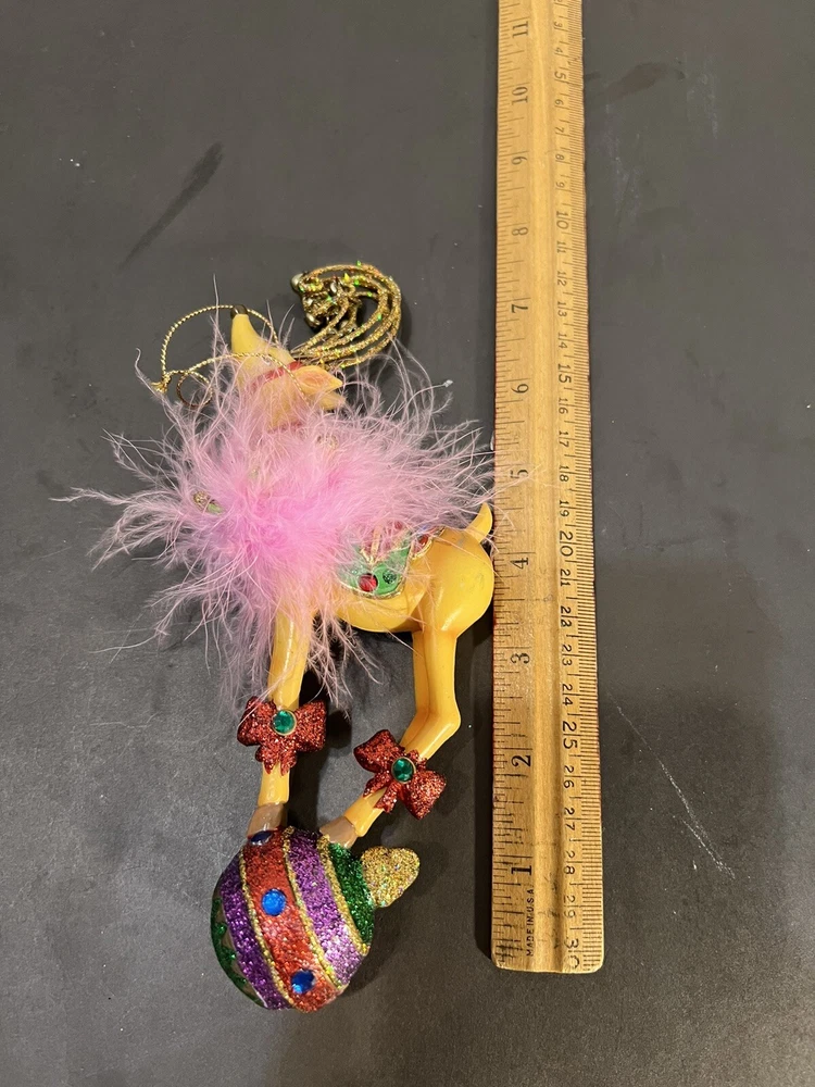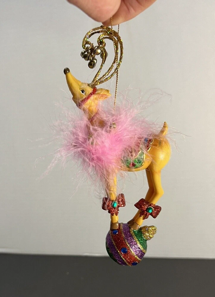 Reindeer On Globe Ornament Pink Feathers Resin Nice pre-owned condition. Please see photos. B16-2