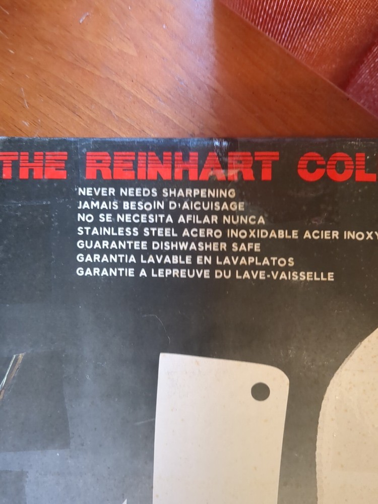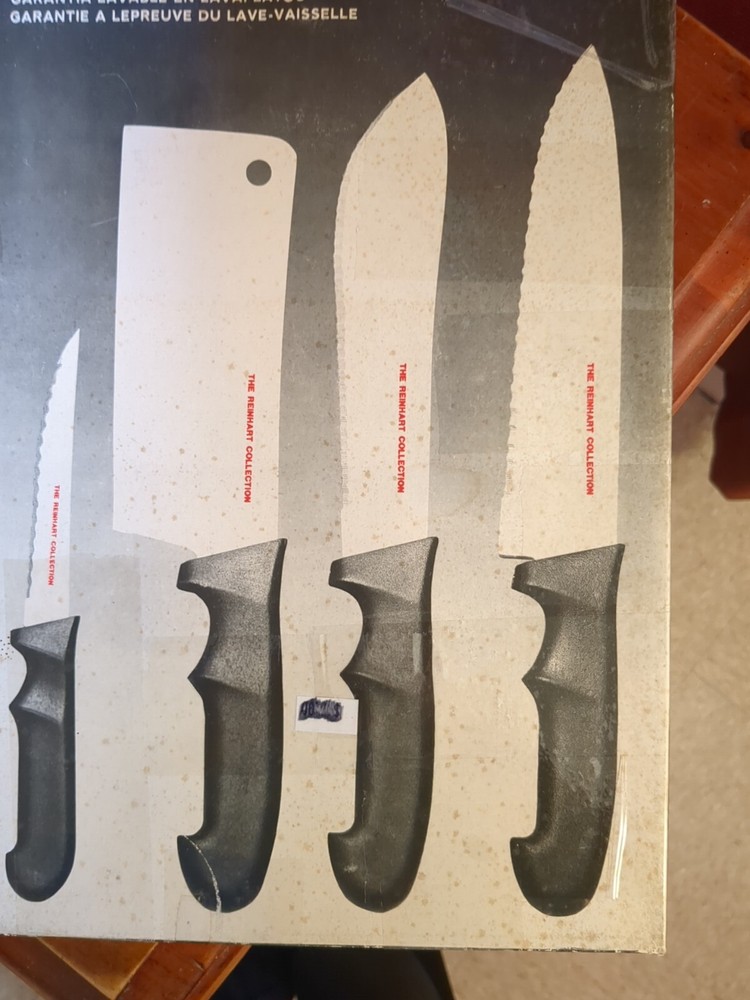 BRAND NEW OPEN BOX SET OF 5 KNIVES NEVER NEEDS SHARPENED SHIPPED WITH CARE The Reinhart Collection Set of 5 knives features stainless steel construction in a sleek black color. These knives are designed to never need sharpening, ensuring lasting sharpness and durability. The set includes a variety of knives for different kitchen tasks, all brand new in box.