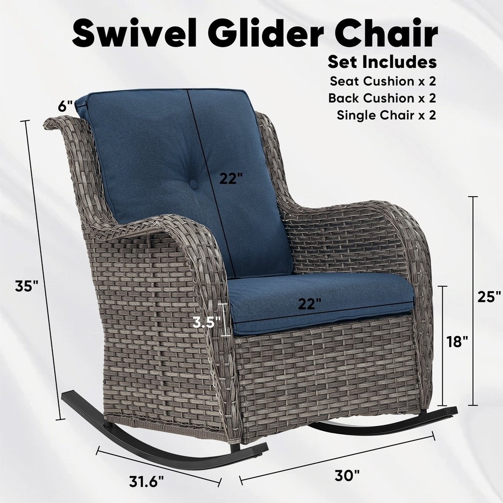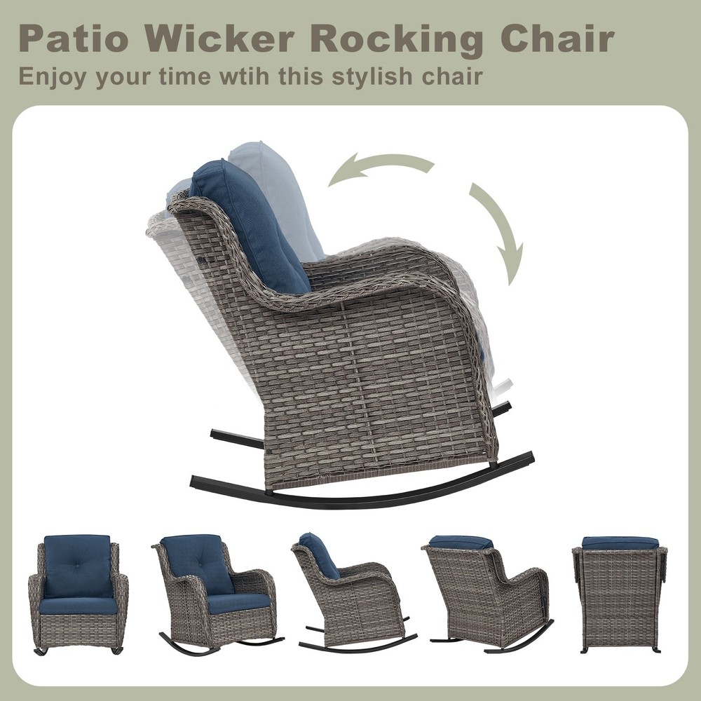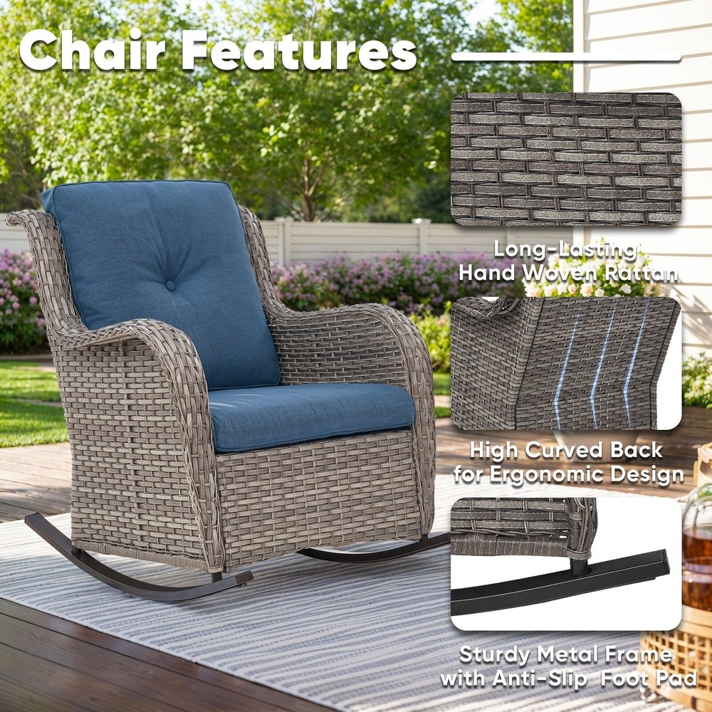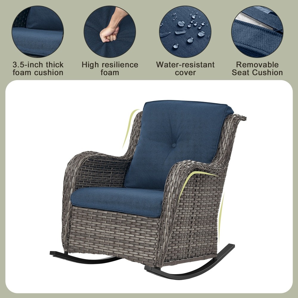 Specification Product TypeRocker Chair Motion TypeRocker Seat Frame Materia!High-Density PE Wicker Cushions IncludedYes Cushion DurabilityWater Resistant; UV Resistant Removable CushionsYes Removable Cushion CoverYes Cushion Cover MaterialPolyester DurabilityUV Resistant; Waterproof; Mold / MildewResistant Weight Capacity300 lb. Cushion Fill MaterialFoam MaterialPowder Coated Steel Chair FeaturesRockingPatio Wicker Rocking Chair Feature Patio wicker rocking chair is designed with two curved & well-polished rocking bars which allow you to rock back and forth smoothly and safely. Rigorously tested and manufactured, the rocking chair is woven by all-weather PE wicker, which is not easy to come off or fade as time goes. The thickened cushions are another perfect addition to Free Shipping Over $49.99* Details Patio Rocking Chair with Comfortable Cushions Product Description: Specification Product TypeRocker Chair Motion TypeRocker Seat Frame Materia!High-Density PE Wicker Cushions IncludedYes Cushion DurabilityWater Resistant; UV Resistant Removable CushionsYes Removable Cushion CoverYes Cushion Cover MaterialPolyester DurabilityUV Resistant; Waterproof; Mold / MildewResistant Weight Capacity300 lb. Cushion Fill MaterialFoam MaterialPowder Coated Steel Chair FeaturesRocking Patio Wicker Rocking Chair Feature Patio wicker rocking chair is designed with two curved & well-polished rocking bars which allow you to rock back and forth smoothly and safely. Rigorously tested and manufactured, the rocking chair is woven by all-weather PE wicker, which is not easy to come off or fade as time goes. The thickened cushions are another perfect addition to the chair which are padded with soft lining and can provide a strong buffer. Sturdy and DurableUV-resistant PE wicker is hand woven around sturdy rust-resistant powder coating frame for increasing strength and durability. Ergonomically Design for ComfortThe rocker chair come with high,curved line backrest perfect for lounging, add thickly breathable soft cushion with zipper for superb comfort. Coffee TableCoffee side table with thick transparent tempered glass is solid and safe, and two layer structure design for more space. About this item HANDMADE RESIN WICKERThe rocking chair is made of high-quality PE wicker, making it all-weather resistant for rain, wind, and hot sun, not easy to fade and lose luster. The metal frame to be solid and rust-resistant for long-time outdoor use. SAFE ROCKING MOTIONThis rattan chair is finished with a gentle rocking design, allowing for unassisted smooth and balanced deep or light rocking without the need for constant pushing. You dont need to worry about falling down from chair while swaying. THICK CUSHIONRocking patio chair with thickened cushions give you better support for your whole body, bottom cushion has removable zipper for easy washing, which is easy to clean and gorgeous and durable for long-lasting. MODERN ATYLEErgonomic backrest and wide armrest providing the comfort desired by rocking chairs, which is a great addition not only for your yard, garden and porch, but also for your indoor area like living room and bedroom. What's in the box? 2* rocking chair with cushion 1* all hardware and manual