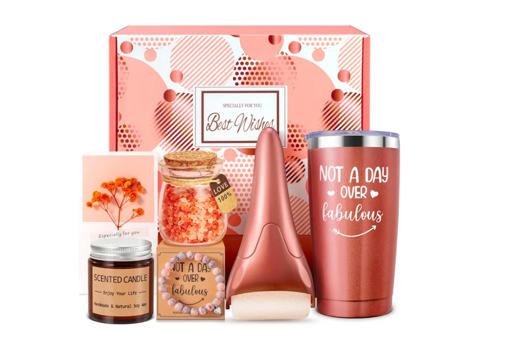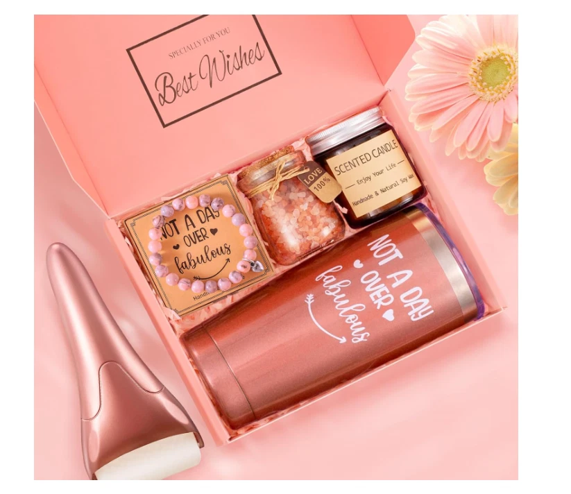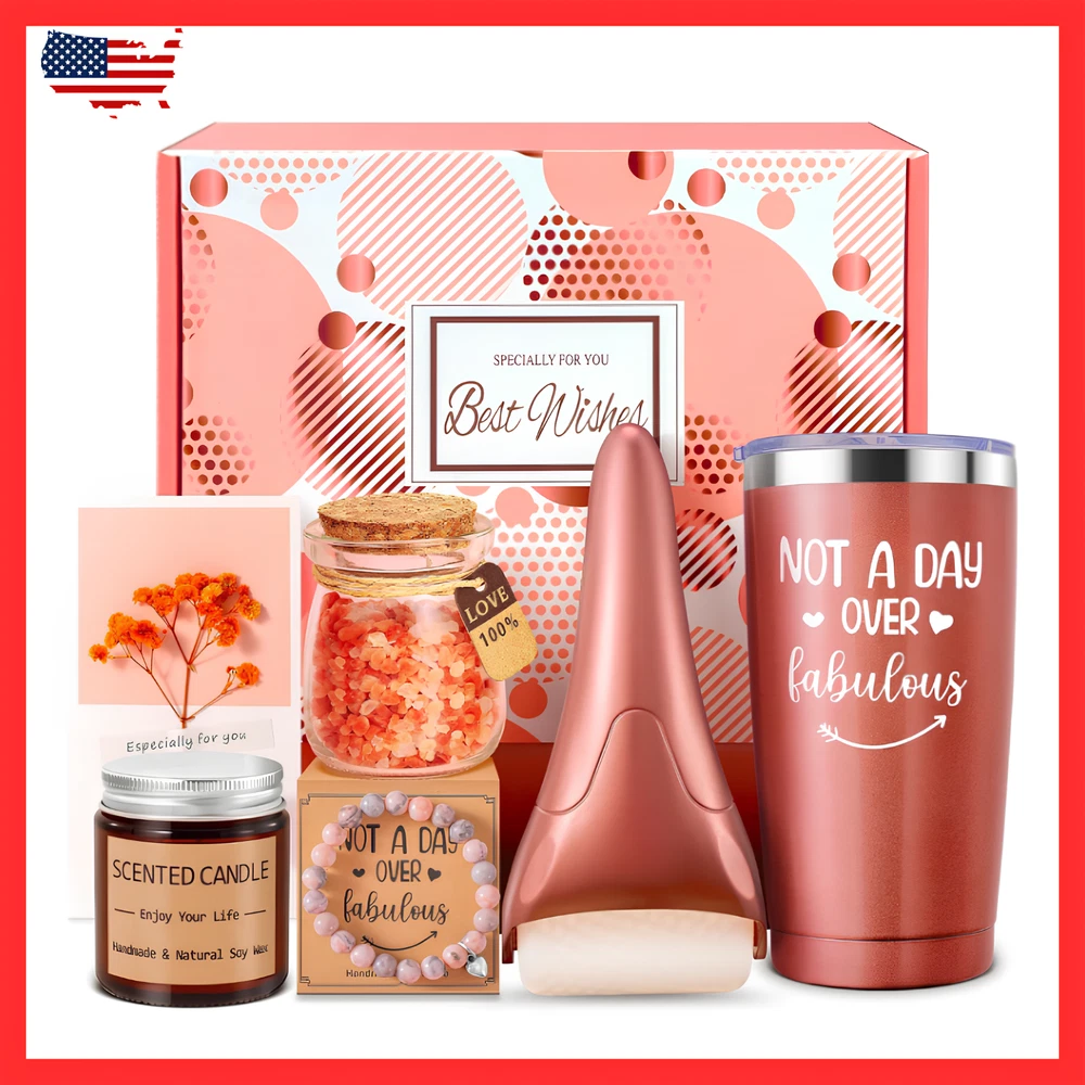 Luxury Gift Baskets for Her | Personalized Gifts | Birthday, Christmas, Mother's Day Discover the perfect gift for any special occasion with our exquisite collection of luxury gift baskets. Curated with love and care, each basket is filled with a delightful assortment of high-quality products, from gourmet treats to pampering essentials. Whether it's a birthday, anniversary, Mother's Day, or just because, our gift baskets are sure to impress. Why Choose Our Gift Baskets? Personalized: Create a truly unique gift by customizing your basket with her favorite items. High-Quality: Our products are sourced from the finest artisans and makers, ensuring the highest quality. Thoughtful: Show her you care with a gift that's both beautiful and functional. Perfect for any occasion: From birthdays and anniversaries to holidays and corporate events. Convenient: Our gift baskets are ready to gift, so you can save time and effort. Perfect for: Mothers Wives Daughters Sisters Friends Grandmothers Coworkers Clients Make her day with a truly special gift. gifts for her, gift baskets, gift ideas, birthday gifts, christmas gifts, mother's day gifts, women's gifts, unique gifts, personalized gifts, luxury, high quality, handmade, custom, personalized, spa, relaxation, pampering, gourmet, gourmet food, gift box, gift hamper, gift set, gift basket for her, gift basket for women, birthday gift basket, christmas gift basket, mother's day gift basket, anniversary gifts, thank you gifts, corporate gifts, gift for her, present for her, gift ideas for women Perfect Birthday Gifts for Women Unique - Every item in our birthday gift set is carefully selected and well wrapped for gift giving. Ideal birthday gifts for women, mom, wife, sister, best friend, girlfriend, coworker, teacher, nurse, her or any special lady in your life! The unique and practical birthday gifts set for women is sure to make her feel surprised, cherished and loved. Perfect birthday gifts for women Great Gift Box for Any Occasion - The luxury gift box for women is suitable for her birthday, Mother's Day, Christmas, Valentine's Day, anniversary, graduation, Thanksgiving, Women's Day and more. The stocking stuffers for women comes with just about everything needed to make a nice, thoughtful, and practical gift for woman for any occasion, but also is a good way to pamper yourself too Personalized CHristmas Gifts for Women - 6 in 1 Women Christmas Gifts set contains 1 x 20oz rose gold stainless steel insulated tumbler written with "Not A Day Over Fabulous", 1 x ice roller, 1x beautiful stone bracelet, 1 x handmade scented candle, 1 x bath salt and a personalized greeting card. The beautiful and luxury gift box will be the best gifts for mom, she will feel surprised and spoiled when unboxing. Ideal Christmas gifts for women who want nothing Ideal Gifts for Women Who Have Everything - Double insulation design tumbler keeps drinks warm or cold on your need. Ice roller helps reduce wrinkles and fine lines. Use gently over eyes, temples, and neck to energize and reduce swelling. Lavender scented candle and bath salt make you feel relaxed and pampered. The gifts for women bring personalized self care and bath spa experience home Happy After-sale Service - Everything practical and pampering all together in one gift box! Whoever will feel surprised and love the gifts for women. Order it without hesitation! Gifts for Women Mom Wife Teacher Grandma Sister Friends Daughter Girlfriend Her | Christmas Gifts, Mothers Day, Birthday, Valentine's Day | Unique Gift Ideas, Gift Basket, Stocking Stuffers for Women