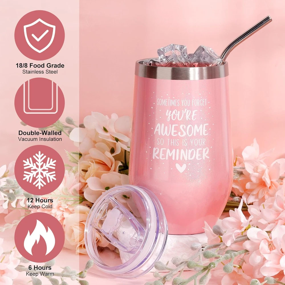 Unique Gifts Baskets for Women - OFKAIS happy birthday gifts for women is a perfect and meaningful birthday gifts for mom, grandmother, sisters, daughters, wife, girlfriend, coworkers, teachers, nurses, etc. She will love this romantic and thoughtful birthday gifts set for women. Also suitable for Christmas, Mother's Day, Teacher's Day, Thanksgiving, Valentine's Day, New Year and other holidays. 6PCS Bath Set Gifts for her - This birthday gift baskets for women includes a 20oz wine tumbler with straw and cleaning brush, an aromatherapy candle, a rose scented bath bomb, a pure handmade diamond soap, a bottle of bath salts, and a handwritable dried flower card. Each of birthday gifts for women are handpicked from a women's point of view and packaged in a heartfelt gifts box. 20oz Insulated Tumbler - Made of 18/8 food-grade sturdy stainless steel with double vacuum insulation, this insulated tumbler with lid will keep your drinks warm for up to 12 hours (cold) and 6 hours (hot), great for all kinds of drinks. The positive quote "SOMETIMES YOU FORGET YOU'RE AWESOME SO THIS IS YOUR REMINDER" printed on the body of the mug can make her happy and capable of seeing it every day, which is perfect for expressing your love and care all the time, and it is a perfect gifts of encouragement for women. Bath & Spa Soothing Gifts - Spa gift baskets for women have rose scented candles are made from pure essential oils and 100% natural soy wax, which is non-toxic and can be smokeless. There are also diamond handmade soaps, bath sea salts, and bath bomb, all releasing a relaxing rose scent, so she can enjoy her drink along with a luxurious and dignified bubble bath to help her soothe and relax. High-end & Luxury gifts box for women - The words "Specially FOR YOU" printed on the outside of the birthday gifts for women and "Hello Gorgeous" printed on the inside of the gifts sets for women will make her feel touched when she receives the gifts box. In addition, there is a handwritten dried flower blessing cardboard inside the gift box, you can write your blessings to her in the cardboard, to convey your most sincere feelings to her! Product Description 20oz Insulated Tumbler The positive quote "SOMETIMES YOU FORGET YOU'RE AWESOME SO THIS IS YOUR REMINDER" printed on the body of the mug can make her happy and capable of seeing it every day, which is perfect for expressing your love and care all the time, and it is a perfect gifts of encouragement for women. Scented Candles Spa gift baskets for women have scented candles are made from pure essential oils and 100% natural soy wax, which is non-toxic and can be smokeless. Bath & Spa Soothing Gifts Sets There are also diamond handmade soaps, bath sea salts, and bath bombs, all releasing a relaxing lavender scent, so she can enjoy her drink along with a luxurious and dignified bubble bath to help her soothe and relax. High-end & Luxury Gifts Box for Women The words "Specially FOR YOU" printed on the outside of the birthday gifts for women and "HELLO Gorgeous" printed on the inside of the gifts sets for women will make her feel touched when she receives the gifts box.