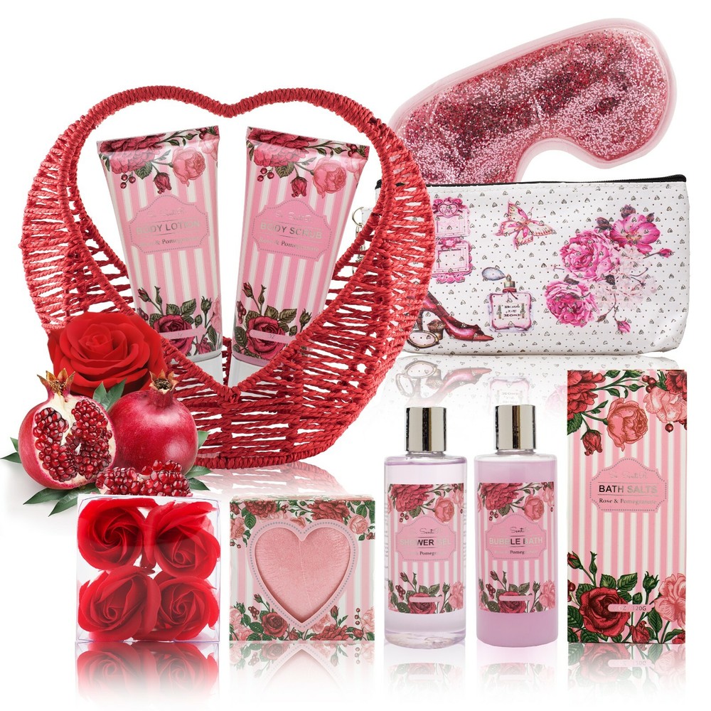 Perfect Mother's Day gifts ideas for your loved one! Premium 14-PC Spa Gift Baskets in Romantic Heart Shape! Se Sentir Relaxing Home bath Set in Rose and Pomegranate Essence Reliable U.S Seller Free Fast Shipping with Tracking SET INCLUDES (FULL SIZE): 1 X Bubble bath (6.8 Oz / 200 ml) 1 X Shower Gel (6.8 Oz / 200 ml) 1 X Body Lotion (3.4 Oz / 100 ml) 1 X Body Scrub (3.4 Oz / 100 ml) 2 X Heart Shaped bath Bomb ( 2 X 1.8 Oz / 2 X 50 g) 1 X Bath Salt (4.0 Oz / 100 g) 1 X Gel Eye Mask 1 X Cosmetic Pouch 4 X Bath Soap Flowers 1 X Heart Shape Basket Description: SPA BATH SET FITS ALL OCCASIONS This luxurious spa gift basket makes a nice present for all gift events including holidays as Christmas, New Year, Easter, Mother’s day, Valentine’s day and Birthday, Anniversary, Graduation, Corporate, housewarming, Just Because, Love & Romance, New home, Retirement, Spring, Thank you, Thinking of you, Cleanup day and Boss’s day to express your Thankfulness or Best Wishes. IDEAL GIFT FOR YOUR LOVED ONES Treat your loved ones with this handmade spa collection gift basket scented with the rejuvenating aroma of Wild Rose and Pomegranate. Whether it is your mother, wife, girlfriend, daughter, sister, partner, teen girl, friend, grandma, or mother in law, sister in law or stepmother, mom, it is always bright to let them know how much you care and love them. !! Put a smile on her face with this elegant spa gift basket!! RELAXATION AT-HOME SPA EXPERIENCE Unwind and pamper for your own indulgent pleasure with this fragrant delightful and fresh scented assortment of at home spa and bath kit. Choosing Bath Salt, or one of the 2 extra-large Bath Bombs, immersing in a real spa-experience flower bath pour, having fun in the tub, soaking your troubles away time and again with the glorious scent of Wild Rose and Pomegranate SOOTHING AROMATHERAPY PRODUCTS Infused with floral essential oils of wild rose and pomegranate, Se SentiR natural spa set is an ideal solution for relieving muscle pain, soothing the mind, invigorating the body, revitalizing the spirit and promoting overall well-being. The featuring nourishing ingredients such as sunflower seed oil and vitamin E refresh the skin and lock in moisture. ULTIMATE BEAUTY ESSENTIALS This luxurious natural at-home spa kit gift basket begins with essential tools for a full day of relaxation including Bath Bomb, Bath Salt, Bubble Bath, Body Lotion, Gel Eye Mask and a bling-bling Cosmetic Pouch and more and more. The delightful wire baskets can be used in many different ways including as a decorative container. Furthermore, Customer satisfaction is always our top priority. “30-day hassle-free return is our guarantee!!”