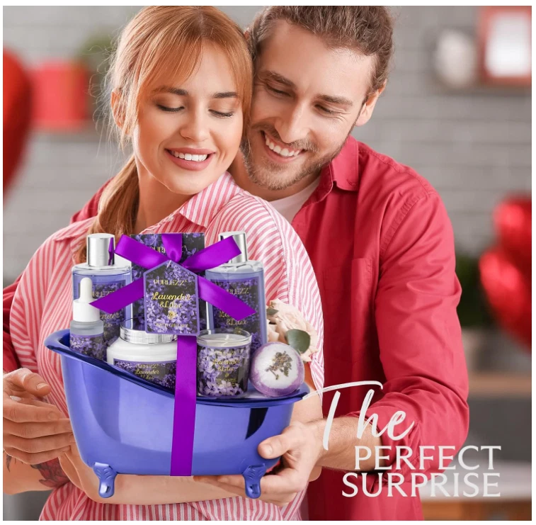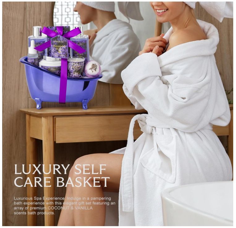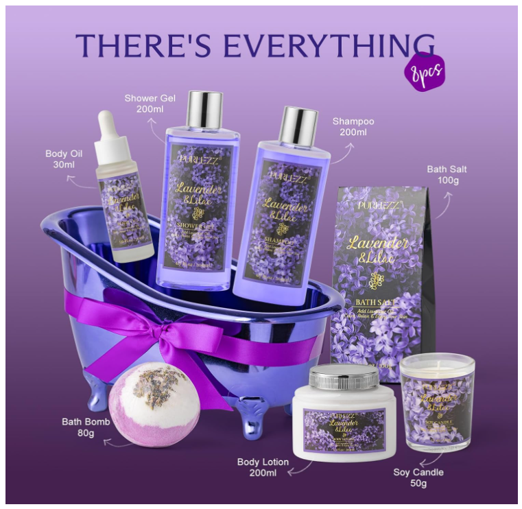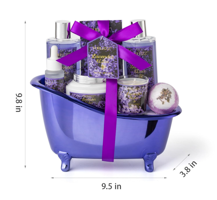 About this item Lavender & Lilac Fragrance: Indulge in the captivating floral aroma of Lanvender and Lilac with this luxurious bath and beauty set. LONG LASTING FRAGRANCE: Our Sweet and beloved lavender scent, also using the principle of fragrance retention by natural essential oils, gently cleanses with a pampering lather to leave your skin moisturized longer after the bath. Pamper yourself with this luxurious collection of Our Spa products Complete Pampering Experience: Includes a shampoo, bath salt, soy candle, and a decorative bathtub holder for a rejuvenating spa day. Gift Set For Women, Our Spa Bath Sets for Women Gift, 8 Pcs Rose Spa Basket Includes Shampoo, Shower Gel, Body Lotion, Soy Candle, Bath and Body Oil, Bath Bomb, Bath Salt, Bath Tub Stoage Box, Birthday Spa Gifts, Mothers Day Gifts for Mom BEST GIFT IDEA FOR ANY OCCASION. Thoughtful Gift: Beautifully presented in a decorative basket, making it an ideal gift for any occasion. A thoughtful and personalized spa gift set for mom, mother, wife, girlfriend, sister, best friend, nurse, coworker or daughter. Whether it's a birthday, Thanksgiving, Christmas, Valentine's Day, or any occasion Luxurious Bath Gift Set: Indulge in a pampering experience with this elegantly packaged bath and body collection. Our Bath and body spa gift for women is the relaxation gift. Indulge in the Refresh scent of lanvender & Lilac , with the Lavender-scented Candle and Handmade Flower Bath Bomb. The Body Lotion is infused with a variety of natural extracts such as shea butter and will leave your skin feeling silky smooth and nourished A gorgeous reusable basket filled with everything you need for a great Bath Spa. Nourishing Shampoo: Gently cleanse and revitalize your hair with the Lavender & Lilac Perfume Scent shampoo. The reusable Bath Tub is also for storing small items, and convenient for cosmetic and vanity mirror storage. Surprise her with a unique and captivating gift basket that people you love will never forget between graduation, wedding, new job, retirement, birthday, Christmas, mother's day, housewarming, Valentine's day and anniversaries