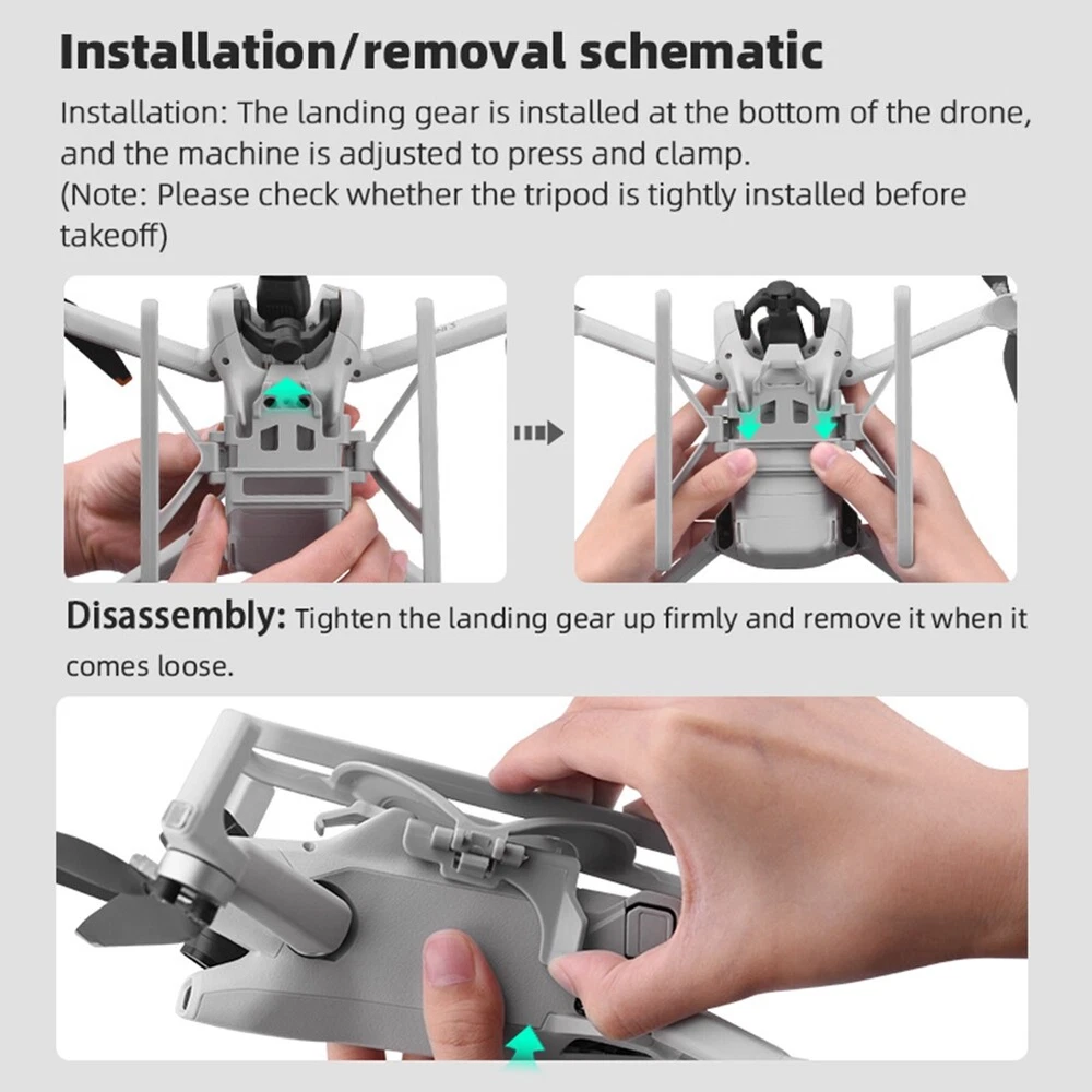 Release Landing Gear for 3 / 3 Pro Leg Height Extender Accessory Z4F39379 1. Effectively increase the height of the drone by 26mm to protect the fuselage and gimbal from damage, 2. It can effectively improve the adaptability of the aircraft to the ground environment during take-off and landing, and avoid the ground debris from contaminating the aircraft or damaging the lens, 3. Install obstacle avoidance and fill lights that do not block the downward vision, and do not affect flight , 4. Foldable landing gear for easy storage and storage. Applicable models: for Mini 3, Mini 3 Pro color:Grey Material:ABS size:13.7 x 12.8 x 6cm Package Contents: 1 x Landing Gear