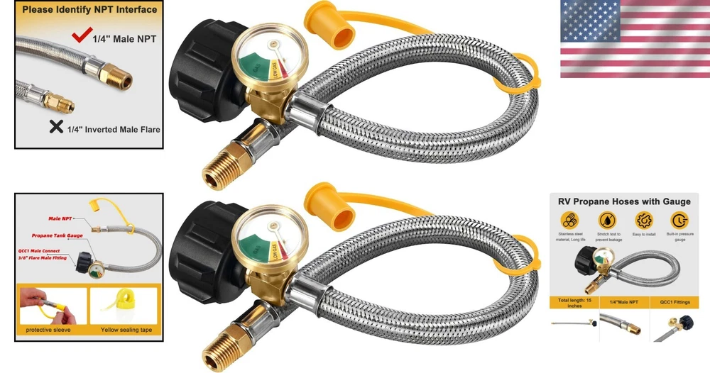Reliable 2-Pack 15-inch RV Propane Hose with Gauge for Safe Outdoor Cooking ‹ › ‹ › ‹ › ‹ › ‹ › ‹ › ‹ › ‹ › Reliable 2-Pack 15-inch RV Propane Hose with Gauge Your trusted companion for safe outdoor cooking adventures! Product Features: Size: 15-inch, 1/4 inch ID, with 1/4 inch outer diameter Stainless steel braided design that ensures durability Quick installation with tool-less attachment to propane tanks and regulators Includes a color-coded dial for easy visibility of propane levels Compatible with a range of tanks from 5lb to 4lb LP gas tanks Solid brass fittings provide a secure and airtight connection Use with BBQ grills, RVs, camping equipment, and outdoor cooking Benefits: Ensures safe and efficient connection for your outdoor cooking needs. Quick and easy setup allows you to focus on enjoying your outdoor experience. Durable materials offer reliable performance with every use. Color-coded gauge allows for quick monitoring of propane levels, eliminating guesswork. Versatile connection options for added convenience and flexibility. Why Choose Our RV Propane Hose? Our Reliable 2-Pack 15-inch RV Propane Hose with Gauge sets the standard for safety and convenience in outdoor cooking. Crafted from durable stainless steel and solid brass, you can trust that these hoses will withstand the rigors of adventure, providing a secure and airtight connection for all your propane needs. With tool-less attachment and a color-coded gauge for easy monitoring, cooking outdoors has never been simpler. Don’t compromise on safety or convenience during your outdoor culinary escapades. Choose our RV Propane Hose for peace of mind and exceptional performance. Order your set today! Shipping Free & Fast Shipping - We offer free shipping to most of the USA with a normal delivery time of 3-7 days. However, due to the current situation, additional delivery time (up to 3 weeks) may be required for some items. Alternative Carriers - We may use alternative carriers (e.g. USPS, FedEx, UPS, etc.) to ensure your package arrives safely and on time. Due to the use of multiple carriers, we are unable to provide a tracking number automatically. Handling Time - Orders are processed and shipped within 1-2 business days of receiving cleared payment. Shipping Restrictions - Shipping to Alaska, Hawaii, Puerto Rico, Guam, and other US territories may incur shipping charges or delivery restrictions. Please contact us before ordering, or your order can be refunded/cancelled. State Restrictions - There may be restrictions based on your state of purchase. For example, certain items may not be shipped to California due to state regulations. Contact for Tracking Updates - If you require tracking updates or have any concerns about the delivery of your order, please feel free to contact us, and we will be happy to assist you. Return 30-Day Hassle-Free Returns - We want you to be completely satisfied with your purchase. If you are not, you can return the item within 30 days of receiving it for a full refund or exchange. Easy Return Process - To start a return, simply contact us and we will provide you with a prepaid return shipping label and detailed instructions. Restocking Fee - There are no restocking fees for returns. However, the buyer is responsible for return shipping costs if the return is not due to a seller's error. Refund Processing Time - Refunds will be processed within 5 business days of receiving the returned item in its original condition. Payment We accept all major credit cards, PayPal, and Apple Pay for your convenience. Your payment information is secure and encrypted to ensure a safe and seamless transaction. Please complete your payment within 3 days of purchase to avoid any delays in shipping. Feedback Your feedback is extremely important to us. We strive to provide the best products and customer service possible. If you are satisfied with your purchase, please take a moment to leave us a positive review. If you have any concerns or issues with your order, please contact us before leaving negative feedback. We are committed to resolving any problems and ensuring your satisfaction. Contact Us If you have any questions or concerns, please feel free to reach out to our customer support team. You can contact us through the eBay messaging system. We are available Monday to Friday, 9:00 am to 5:00 pm EST, and we will do our best to respond to your inquiry within 24 hours. Buy it now and enjoy a pleasant shopping experience! Manufacturer Part Number: RV Propane Hoses UPC: Not Set MPN: RV_Propane_Hoses Unit Quantity: 2 Brand: Unbranded Part Type: Accessories Country/Region of Manufacture: RV Propane Hoses Warranty: Unspecified Length Unit Type: lb