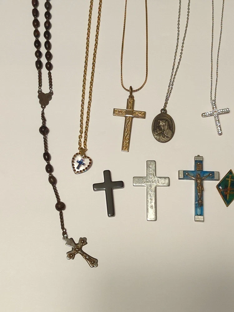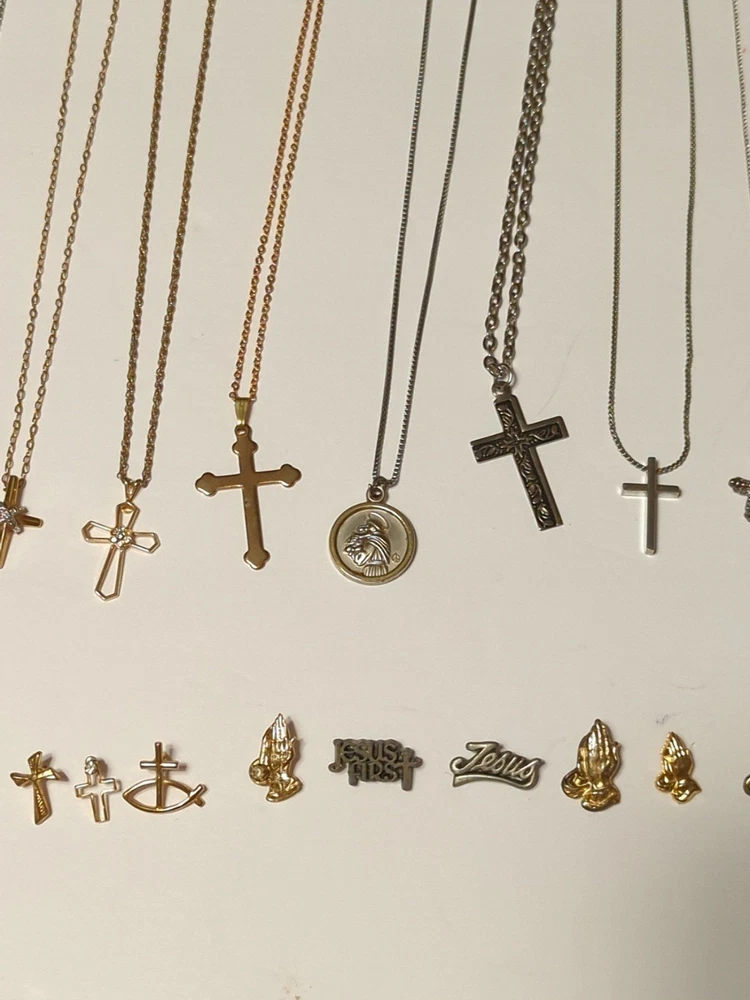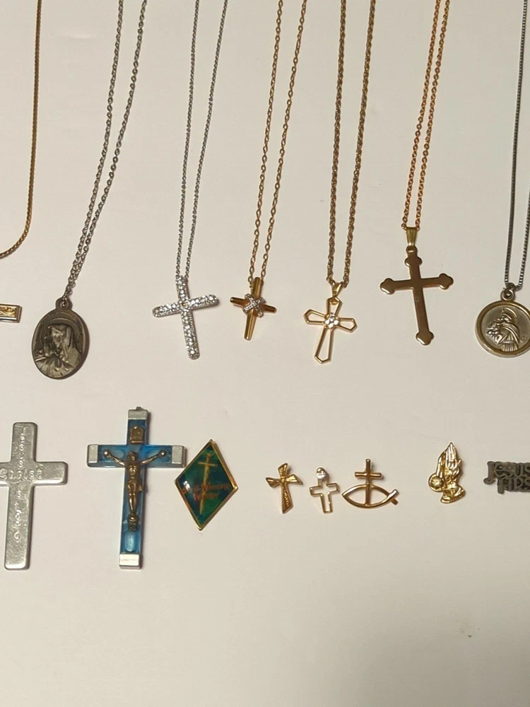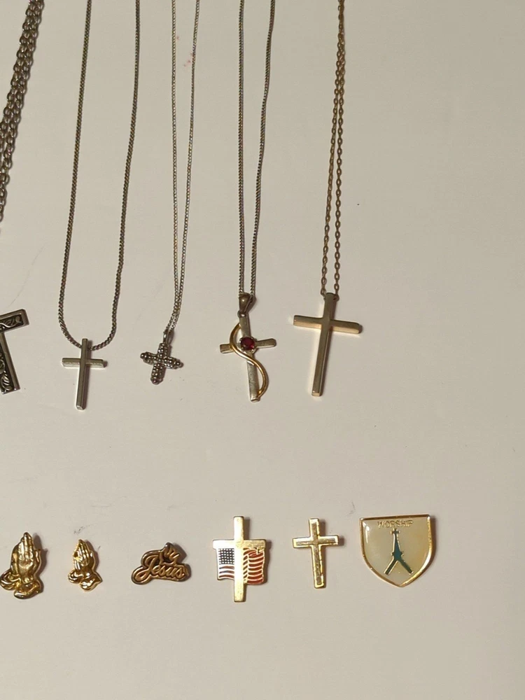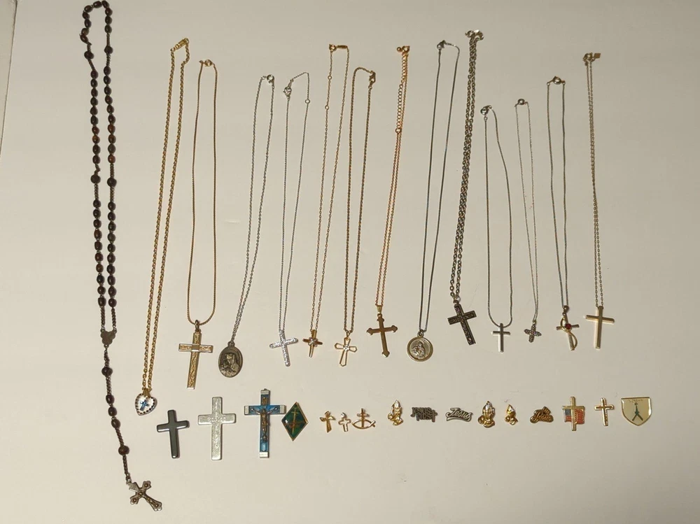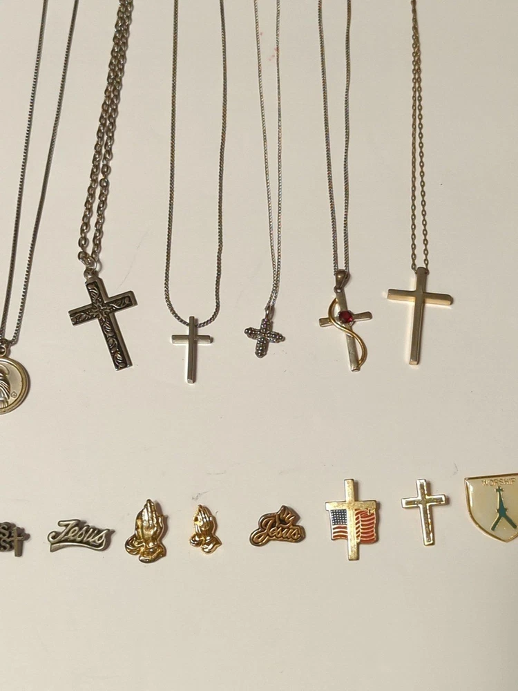 Huge Religious Jewelry lot Includes 13 Necklaces 1 Rosary 3 loose Crosses 13 pins **All pieces are 100% wearable ** Some pieces are 925 sterling