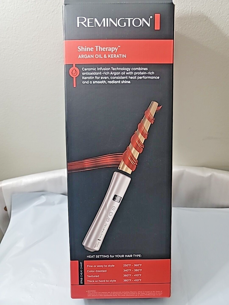 Barrel Size: 1 1/2 in, 1 in, 0.75 in, 1.5 in, 1/2 in, 1.25 in, 0.5 in Material: Ceramic, Plastic, Metal Hair Type: All Hair Types Type: Curling Wand GTIN: 0074590556087 Brand: Remington Size: Travel Size Power Source: Electric Power: 45W, 110W gtin13: 0074590556087 Maximum Temperature: 410 °F Weight: 0.780 lbs UPC: 0074590556087 Heating Plate Material: Ceramic Features: Instant Heat, Indicator Light, Built-In Safety Stand, Ionic Technology, Temperature Display, Adjustable Heat Settings, Digital Display, Attachments Included, Auto Shut-Off, Cool Tip, Stand, Coated, Swivel Cord