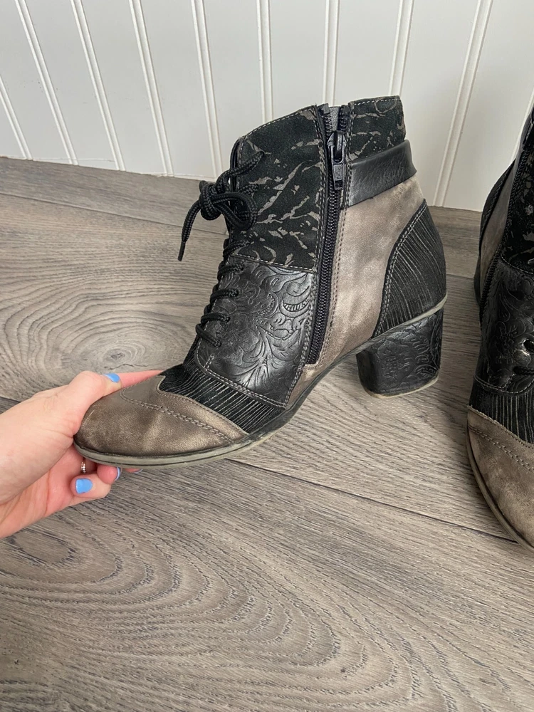 Elevate your equestrian look with these Remonte ankle boots. Crafted from high-quality leather, these boots feature an embossed pattern and lace-up closure for a chic and comfortable fit. The round toe and block heel style provide all-day comfort, while the ankle shaft style adds a touch of sophistication. Available in black and other sizes, these boots are perfect for any fashion-forward woman. These Remonte ankle boots are perfect for any occasion, whether you're headed to the office or out for a night on the town. The boots are designed with a laced closure for a secure fit and a round toe shape for a comfortable stride. Made from high-quality leather, these boots are sure to last for years to come.