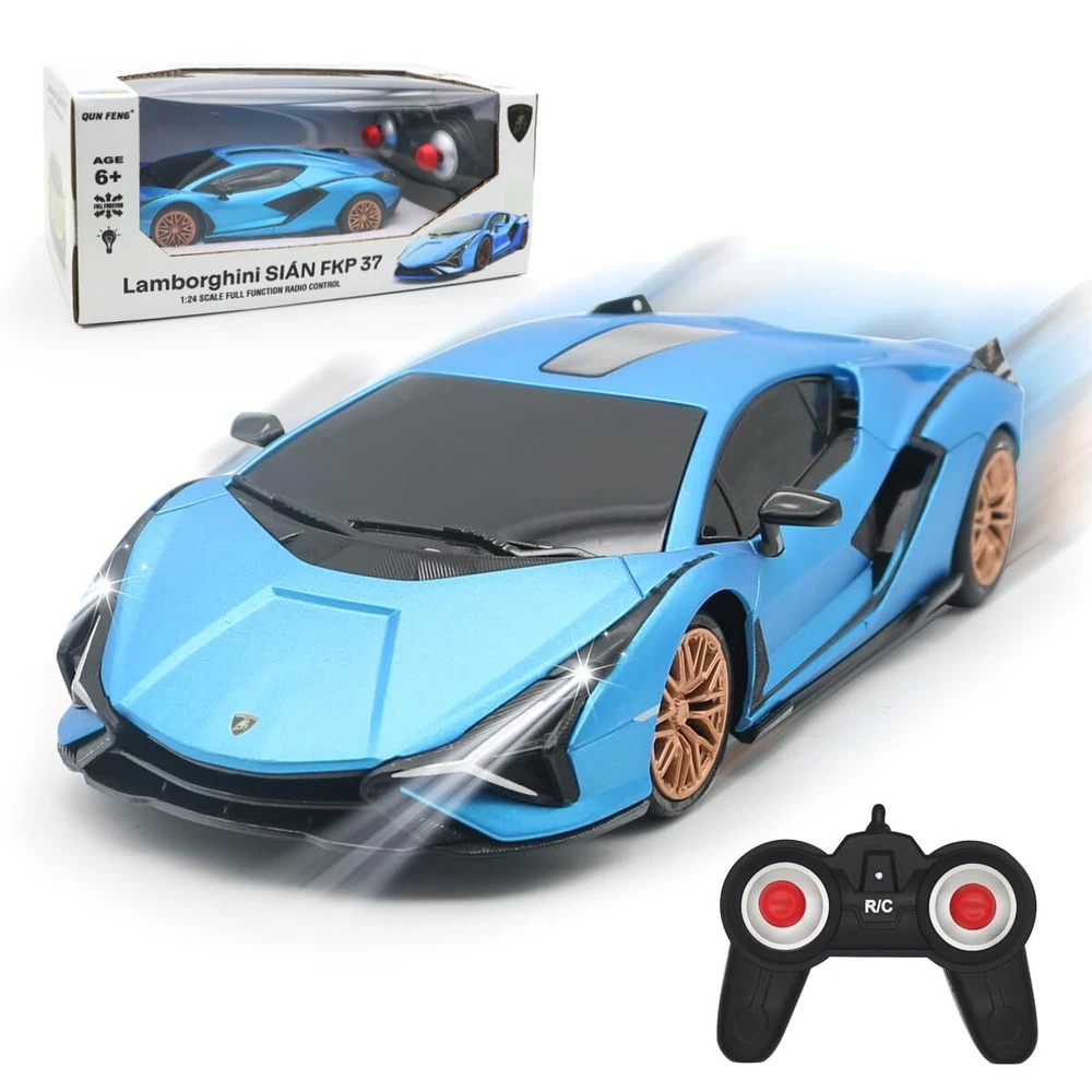 【OFFICIALLY LICENSED】Our remote control cars get officially licensed by, 1:24 true replica of sian. Small size, 8.1 inch long. A cool remote control car for 5,6 year old boy birthday gift. 【FULLY FUNCTIONAL RC CAR】 Boasting a sleek design and a remote controller with functions such as forward, reverse, left, and right turns. The user-friendly dual-grip remote control and a top speed of 4 miles per hour provide endless fun. 【2.4G REMOTE CONTROL CAR】The car built in 2.4G frequency. Two or more cars can run in the same time! Requires 3 * AA Batteries for the car and 2 * AA Batteries for the remote controller (NOT INCLUDED); Package includes 1 * 1/24 remote control car,1 * dual-grip remote-controller. 【High performance material】Our remote control cars has these super cool matte metal-like colors. 3 colors for you to choose. Non-toxic ABS material and odorless spray paint are used to protect the parts inside the car. 【IDEAL RC CAR FOR BOYS/KIDS/ADULTS】The Lamborghini Sian model works well on smooth surfaces, making it suitable for indoor and outdoor play. Not only play with it using the remote control, but also place it as a exhibit on display shelf as a model car. It's an ideal gift for birthdays, remote control car for boys 8-12,stocking fillers, or rewards.