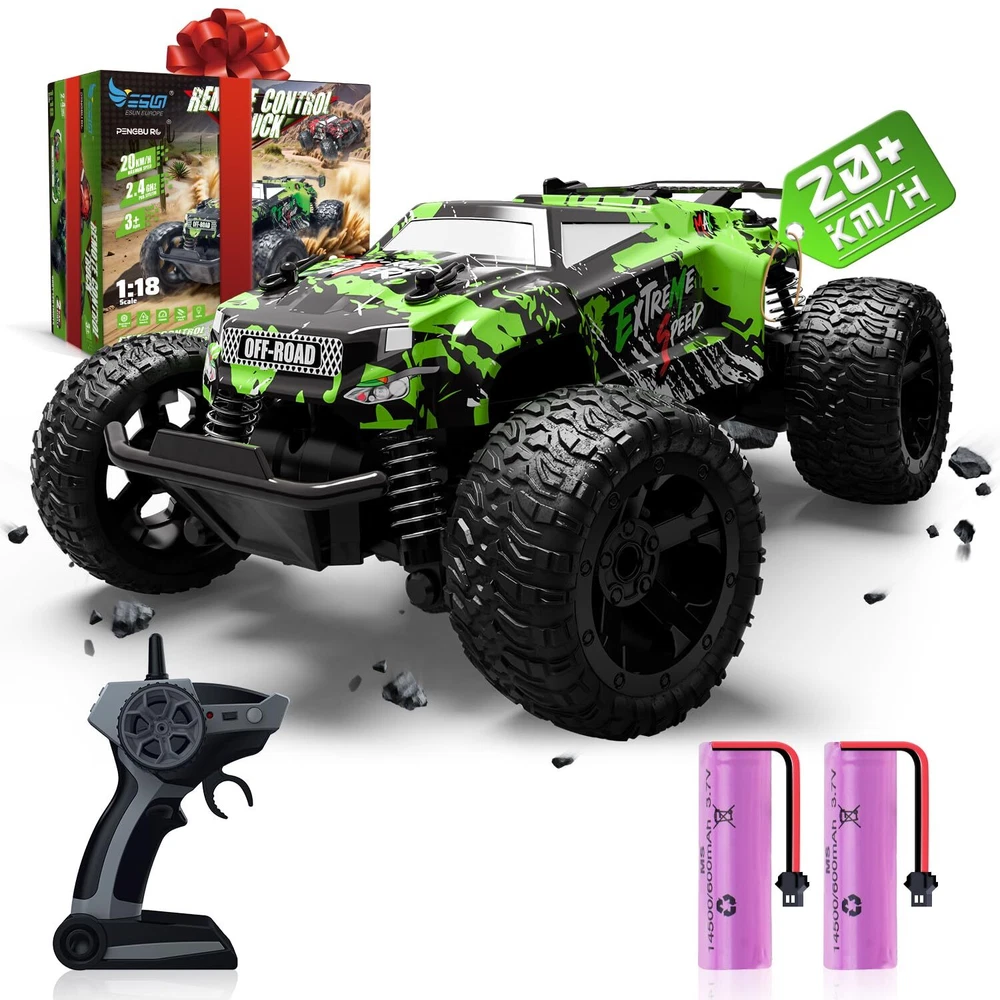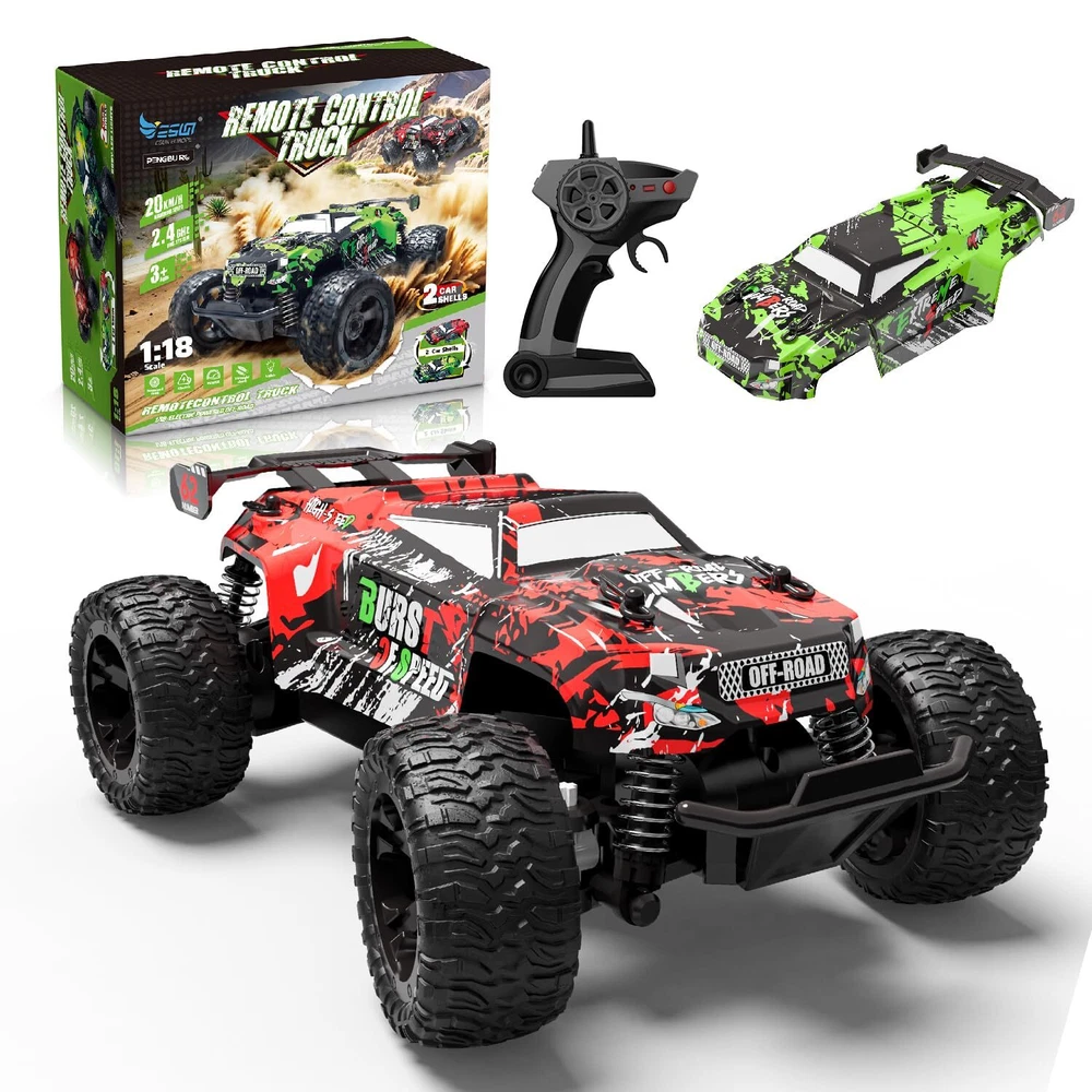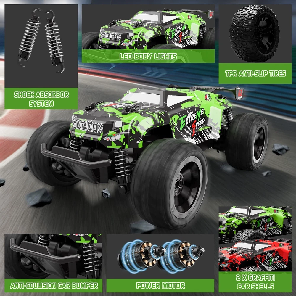 【Remote Control Car is a fantastic choice for beginners】 This 1/18 scale remote control monster trucks is equipped with an upgraded motor, reaching top speeds of up to 20 km/h. It not only has excellent acceleration but also allows for agile cornering, making it an easy-to-operate option for beginners. This remote control car for boys 4-7 8-12, serving as an exciting outdoor and indoor toy truck. Its robust structure and dynamic performance promise thrilling experiences, regardless of where your adventures take you. 【Cool Graffiti Car Shells and LED Car Lights】 We have equipped this remote control car with different color graffiti car shells, so children can choose their favorite color to race. At the same time, we have also fitted the remote control car with cool LED car lights. This allows children to experience the fun of racing even at night. This not only increases visibility for safer night racing but also adds a certain flair to the car's design, making racing even more thrilling and fun. 【Over 40 Minutes of Extended Playtime】 We've equipped our remote control truck with 500mAh high-capacity rechargeable batteries, allowing for approximately 40 minutes of driving pleasure. The set includes a USB charging cable, which can be easily inserted, charged and played! With this feature, the fun never stops. can enjoy long-lasting playtime and have plenty of time to perfect their driving skills. Battery power is no longer a limit but an advantage for our remote control car. 【Safe Materials】Our RC truck has been newly upgraded with sturdy front bumpers and rubber tires. When driving on rugged surfaces, it has a strong resistance to impact. The high-quality rubber tires have shock absorption, strong grip, and anti-slip functions, allowing the remote control car to easily handle extreme road conditions such as grass, sand, and uneven surfaces. We prioritize safety and durability, ensuring that our toys not only bring fun but also stand the test of time, providing a safe and entertaining environment for children. 【Monster Trucks Gift for Boys Girls】 This RC car is durable, speedy, and fun, which is advisable for ' toy gifts. A great gift for birthdays and many other occasions. If you are looking for exciting and cool gift toys for boys & girls & adults, you will love our remote control car.