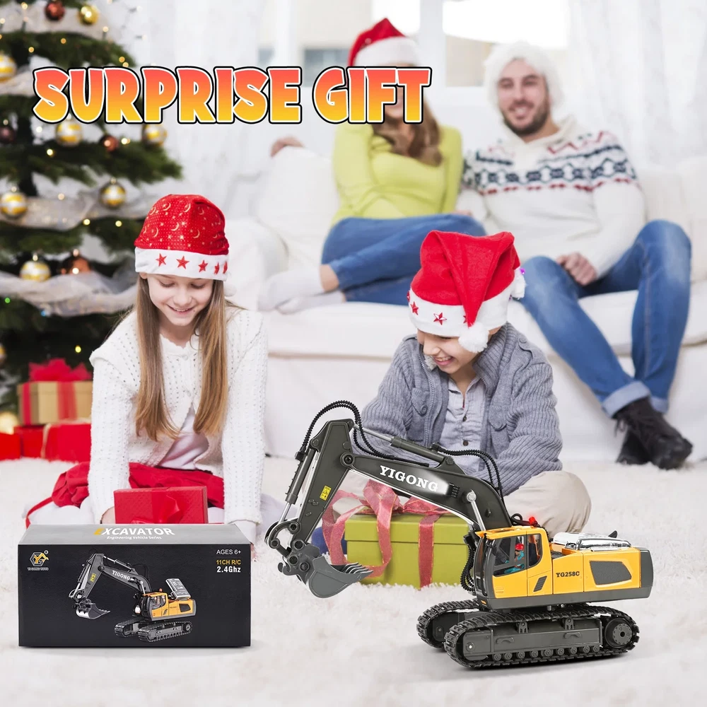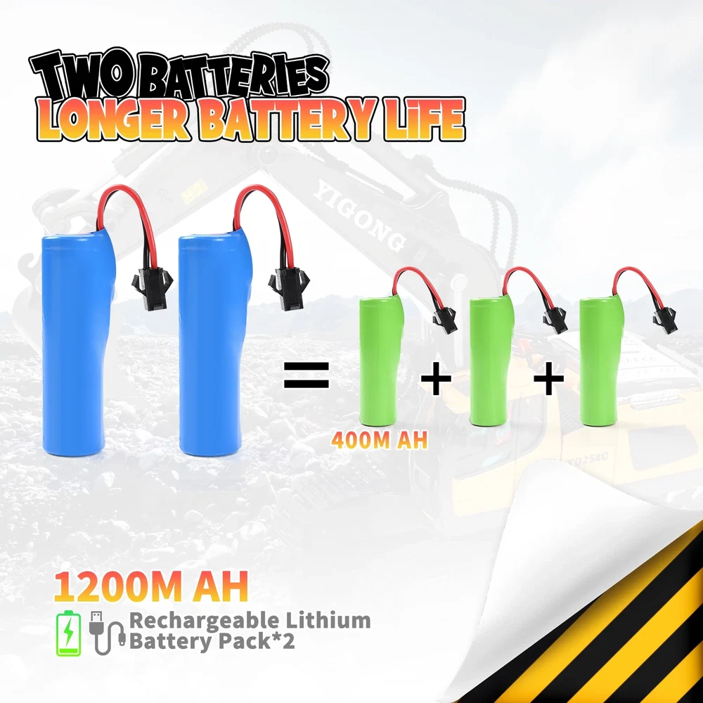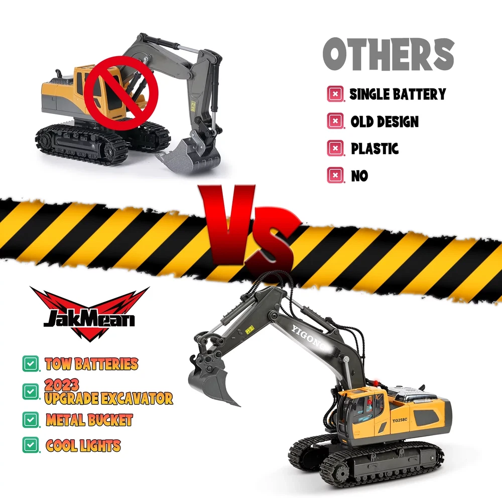 JakMean Half-Metal Remote Control Excavator Toys is the perfect gift for children over 3 years old. This multifunctional remote control toy excavator features a realistic cab that can rotate 680 degrees without any direction restriction. Its alloy bucket and powerful engine make it a high-performing toy that can keep children entertained for hours. Realistic lights and sounds, it provides a fun and immersive experience for kids. Rubber tracks allow our toy excavator can be driven on various terrains such as sand, grass, and mud. The powerful alloy bucket excels when actually digging and lifting a full shovel, allowing children to develop their hands-on and independent thinking skills while having fun. Parents can also rest easy knowing that this Radio Control Vehicle has a safety certificate, ensuring that it is safe for children to use. It is a collectible remote-controlled engineering toy. Whether it's for a birthday or Christmas present, the Remote Control Excavator Toys is an excellent choice for children aged 3-12 who are interested in construction and engineering. Package Included: RC Excavator x1, Remote Controller x1, Rechargeable Battery for Excavator x2, USB Battery Charger x1, User Manual x1 【2 Bigger Capacity Batteries】 Upgrade 1200mAh large battery has as much energy as your lively kids. Giving the remote control excavator the battery installation requires screws to twist open the battery cover in the installation on.or more room to play. Give your child unlimited construction enjoyment. 【Multi-channel joystick will】The toy excavator can be flexibly manipulated for digging, handling, lifting, etc.. Channels can be operated individually or together. Mechanical sounds and flexible mechanical arms are highly featured, which are controlled by real, easy-to-use joysticks. Auto demonstration also help kids better operate. 【 1:20 high simulation Multi-functional remote control excavator】The core components of the excavator are made of metal, giving a heavy and high-quality feel. The vehicle’s overall design is exquisite, highly realistic, and has collectible value. Good quality with alloy bucket, powerful motor, 2.4Ghz multi-channel controller, light and sound. More durable. Even if multiple people play together, they will not interfere with each other. 【Mighty Alloy Bucket】Performs well on real digging and lifting a shovel full. Can coordinate with the unique and realistic cab swiveling within 680 degrees, not limited by any direction. And the excavator moving forward/backward/turn left/turn right. 【Solid Outdoor Play Gifts】This exquisite remote control excavator is suitable for 3 years old holiday gifts, Withstand rough playing on sand, dirt, gravel and other terrains. Well made tracks won't come off or get stuck by sand. Your kids will be thrilled to receive it on their birthday, Thanksgiving, Christmas/X-mas. 【Add to Construction Fleets】Combine with our construction vehicles to enjoy building on the beach/sandbox with friends or family. Links to Dump Truck of the same series: