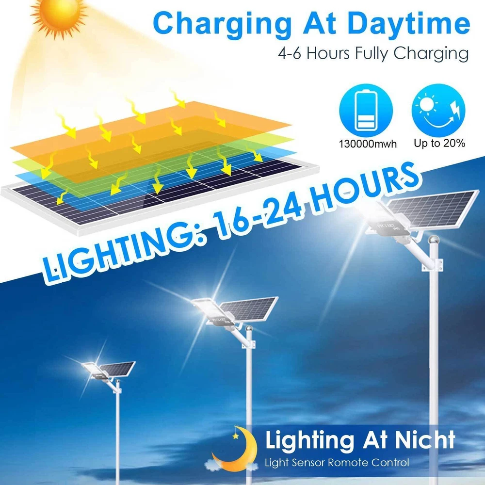 Product Description 9900000LM Solar Street Lights 2000W Watt Solar LED Flood Light Dusk to Dawn Lamp Specifications: ★【Super Bright】 Equipped high quality 2835 SMD LED beads;Provides over 1000w light 100000 Lumens of brightness and reaches 200-300m² illumination range ;No struggle to see in dark places;Built-in 3.2v-13.5Ah large capacity lithium battery with a long life of 50,000+ hours;Working time is up to 20 hours after 4-6 hours fully charged,about 72 hours in dim mode.;Long-lasting and highly efficient solar panels,fast charging and high conversion rate ★【Dusk to Dawn Sensor & Remote Control】 Built-in smart sensor,lights will turn on automatically at dusk, and turn off at dawn. Upgraded Remote Control -ON/OFF Function;Auto Mode- automatically lights up at night,automatically turns off during the day;Timing function-3H,5H,8H ;.Full / Half brightness mode;Brightness increase /decrease mode; ★【Easy to Install】 The kit contains the installation accessories set. You can effortlessly mount them on a tree, pole, balcony, wall, or any desired outdoor spot. These solar powered street lamps can be instantly mounted as long as there is a wall or a pole. ★【Durable&Sturdy&Maintence-free 】 Thickened die-cast aluminum case;IP65 waterproof rating; Dust-proof, rust resistant, corrosion resistant, and bad weather resistant; Designed to withstand any severe weather condition, including snowstorms and hurricanes, ultra reliable;Cost savings;No need to run pesky wires under your lawn, and no batteries that need replacing at the most inconvenient times.Safe-less risks of fires and burns; Environmentally friendly; ★【Widely Used】 Ideal for Plaza, Park, Garden, Courtyard, Street, Walkway, Pathway, Campus, Farm, Perimeter Security etc;Also can be used in Urban roads, industrial areas, residential areas,Elegant design,it will add a nice touch to your outdoor space;an excellent choice for any outdoor Package Content Per Box: 1 x Solar Lamp 1 x Solar Panel 1 x Remote Control 1 x Accessories; Notice: Please allow 1-3cm error due to manual measurement and make sure you do not mind before ordering. Please understand that colors may exist chromatic aberration as the different placement of pictures. About Us Payment Shipping Returns Contact Us Welcome to our store, your support is the biggest driving force for us to move forward. Our main businesses are solar panels, lithium iron phosphate batteries, electric vehicle chargers, solar outdoor/indoor lights, travel solar panels, etc . The product is directly connected with the factory to ensure product quality. Please rest assured to buy, we will provide you with a perfect shopping experience! We accept payment via Paypal only. Payment must be completed within 7 days. If you have any problems about payment, please contact us by ebay message. We only ship to confirmed eBay addresses. Please comfirm that your eBay address is in line with your shipping address. Most of our products are provided with shipping services. Also, the each additional item means exactly the the same color and size. The item shipping from USA. It takes about 5-10 working days to your addresses; Transit time may be a little delayed because of the bad weather. If you do not receive your item within 15 working days since payment finished, please contact us immediately for further assistance. If you have any issue about Item. Please contact us with 7 days since you receive the item and and return to us within 30 days from the delivery date for exchange or refund. If you need return, please contact our customer service representative, let us know the detailed problem and send us some pictures for confirmation. We strive for 100% customer satisfaction! Positive Feedback is very important to us. If you have any questions, please feel free to contact us via "Ask seller a question" . We will reply your email within 24 working hours. About Us Welcome to our store, your support is the biggest driving force for us to move forward. Our main businesses are solar panels, lithium iron phosphate batteries, electric vehicle chargers, solar outdoor/indoor lights, travel solar panels, etc . The product is directly connected with the factory to ensure product quality. Please rest assured to buy, we will provide you with a perfect shopping experience! Payment We accept payment via Paypal only. Payment must be completed within 7 days. If you have any problems about payment, please contact us by ebay message. Shipping We only ship to confirmed eBay addresses. Please comfirm that your eBay address is in line with your shipping address. Most of our products are provided with shipping services. Also, the each additional item means exactly the the same color and size. The item shipping from USA. It takes about 5-10 working days to your addresses; Transit time may be a little delayed because of the bad weather. If you do not receive your item within 15 working days since payment finished, please contact us immediately for further assistance. Returns If you have any issue about Item. Please contact us with 7 days since you receive the item and and return to us within 30 days from the delivery date for exchange or refund. If you need return, please contact our customer service representative, let us know the detailed problem and send us some pictures for confirmation. Contact Us We strive for 100% customer satisfaction! Positive Feedback is very important to us. If you have any questions, please feel free to contact us via "Ask seller a question" . We will reply your email within 24 working hours.