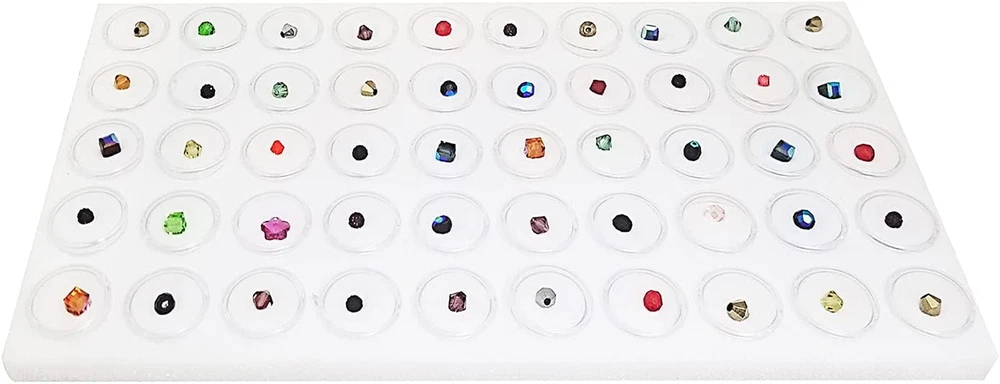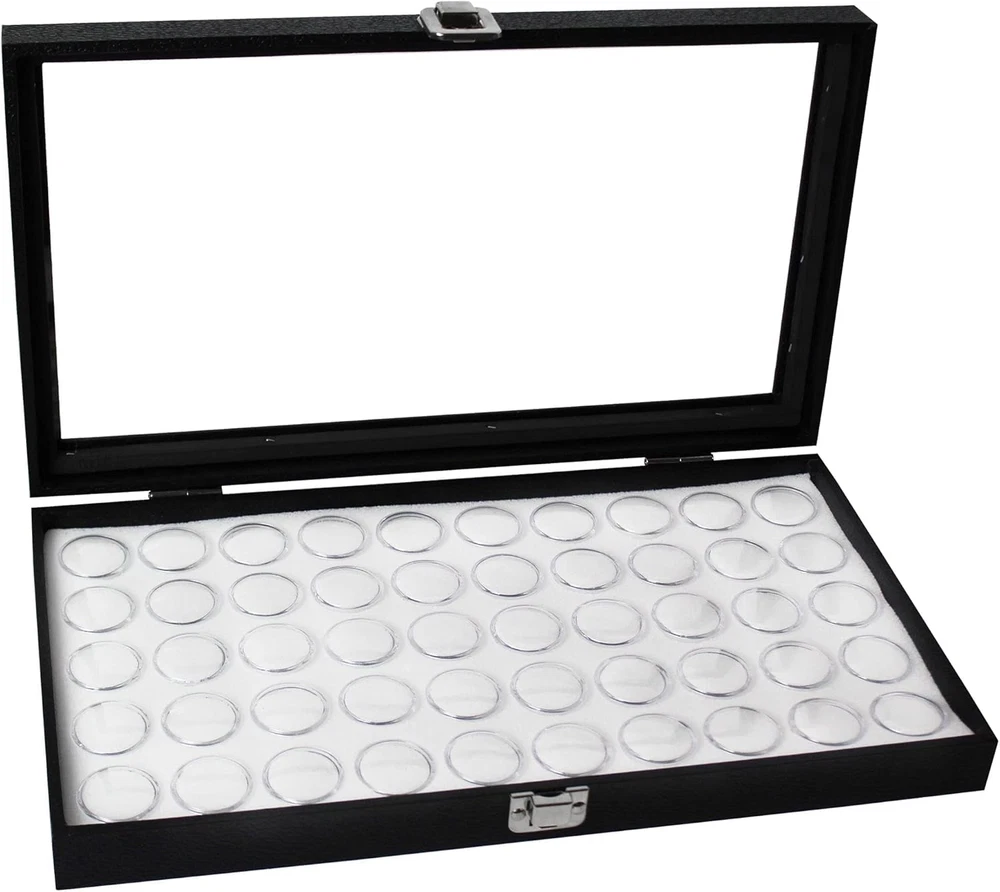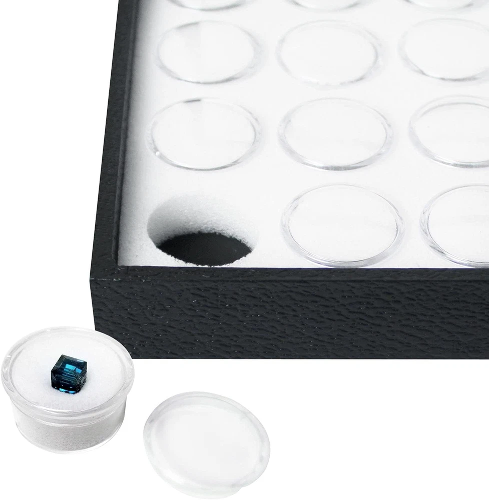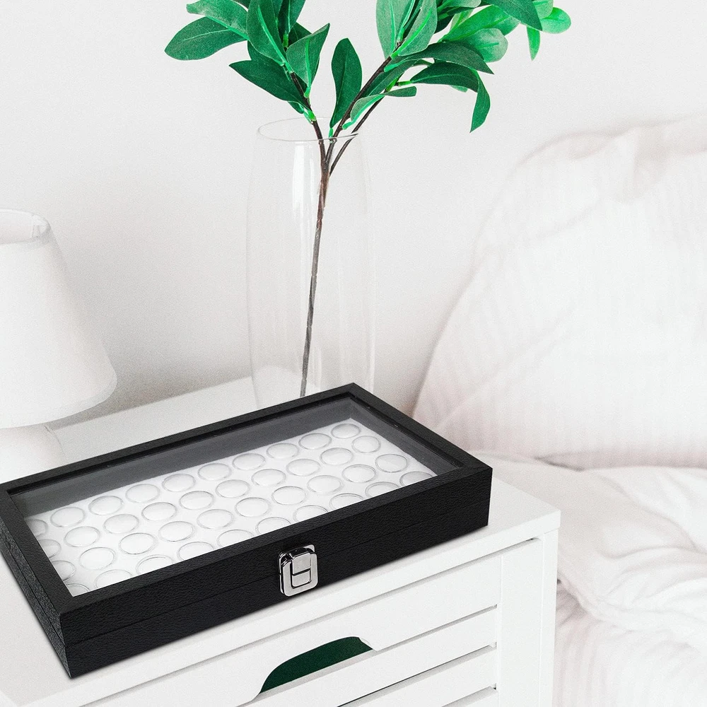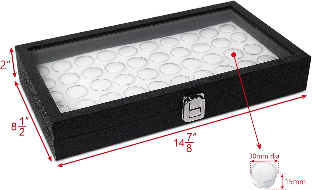 GLASS TOP JEWELRY DISPLAY CASE - Ideal for display your ring, earring, gems painting diamond, gem collection or any of your compact collection. ORGANIZER BOX FOR COLLECTION - Glass top display case with 50 pieces gem jar tray liner. JEWELRY DISPLAY TRAY BOX - Great for trade show or retail store, the case and the latch are sturdy and safe to keep your collection well. The glass top helps you keep your contents from dust and secure while storing them. MATERIAL & SIZE - Leatherette; Overall: 14 7/8"W x 8 1/2"D x 2''H ; The inside diameter of each gem jar measures approximately 30mm dia x 15mm H". Official MOOCA product. Accessories are NOT included. Product Details This display case is made of leatherette-wrapped case with a glass top. It contains 50 pieces of jar topped with white foam. The case is sturdy and the glass is not thin and flimsy, also keep your contents inside dust free and the latch on the lid keep your contents safe. Great for storing your ring, earring, jewelry, gem painting diamond, agates, cufflink, or any collections you want. The case is easily portable while traveling too. FEATURES -The case is made of leatherette-wrapped case with a glass top. -Comes with 50 pieces gem jar tray liner inside. -Box comes with metal clasps in the front to keep your contents safe. -Ideal for storing earring, ring, gemstone, minerals, diamond, cufflink, or any of your collection. -Easily take the inserts and containers out for storing your contents. Size Overall: 14 7/8"W x 8 1/2"D x 2''H"; The inside diameter of each gem jar measures approximately 30mm dia x 15mm H". Accessories are NOT included.