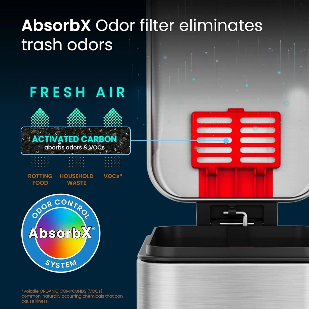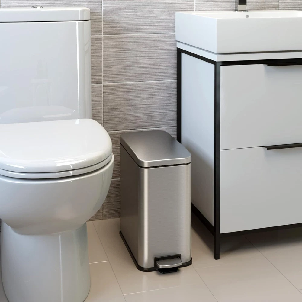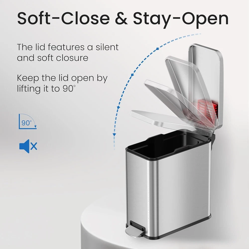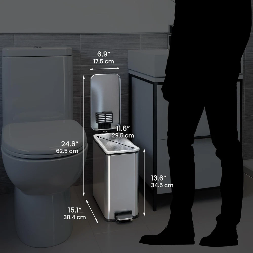 Product Description 3 Gallon SoftStep Bathroom Trash Can with Lid and Odor Filter, Removable Inner Bucket, Stainless Steel Small Wastebasket Slim Garbage Bin for Home Office Bedroom Living Room MOST POPULAR SMALL TRASH BIN WITH ODOR CONTROL - OUR PROMISE TO YOU – Your 100% satisfaction on this small trash can with lid is assured; backed by Full-Service Manufacturer's Warranty and Dedicated Customer Support (see user manual). GENTLE & SILENT LID CLOSE – Durable, ergonomic pedal requires minimal force; easy to replace air damper for years of like-new performance; enhancing the experience of using our bathroom trashcan, office trash can, bedroom trash can, step trash can. STOP TRASH ODORS – 1 AbsorbX Odor Filter is included to absorb and neutralize trash odors, for a fresh and clean smelling home with this small garbage can with lid. Works great as a diaper trash can. SLEEK & MODERN DESIGN – Fingerprint-proof stainless steel construction adds elegance to any space with this small bathroom trash can with lid. We design stylish trash cans for kitchen decors that are modern, classic, sophisticated. BUILT TO LAST – Sturdy, large steel pedal is designed to last over 200,000 steps – that’s more than 20 steps a day for over 25 years! This garbage can bathroom bin is composed of the finest materials. About Us We are a reputable seller with many years of experience selling on eBay. Our goal is to provide high-quality products and excellent customer service. Shipping Items will be shipped within 1-3 business days when we received payment. (Orders are not processed on weekends & holidays) Tracking information will be sent once item is shipped. Delivery time depends on destination and other factors Item is shipped to ebay address. Leaving correct address can minimize delay. For international shipping and shipping to Guam, Hawaii and Alaska, Please contact us before placing the order. International buyers please note: Import duties, taxes and charges are not included in the item price or shipping charges. These charges are buyer’s responsibility. We will try our best to reduce the risk of the custom duties. Local pick-up is unavailable at the moment. Contact Us We reply any email messages within 1 business / working days(off-duty at weekend). If you do not get a response from us, then please check your junk or spam mailbox. Our Business hours: Mon-Fri 9:00-18:00, UTC/GMT +8 hours. Please contact us either by clicking "contact seller" in the "purchase history" section or simply click "ask a question" at the bottom of this page. If you are unsatisfied with our item or service, please contact us before leaving any feedback. We are committed to resolve all issues in a friendly and satisfactory manner.
