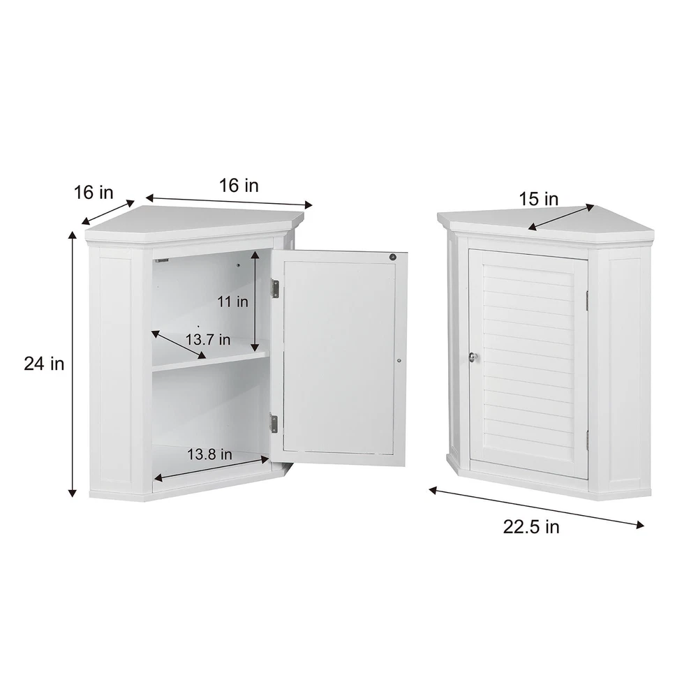 You may also like Aquarium Gravel Mix Mountain Jewels 25lb Natural Surface Healthy Environment New 28.37 USD 29.86 USD Free shipping 5% off Festive Colorful 12-Piece Melamine Dinnerware Set Dishwasher-Safe Plates Bowls 34.32 USD 36.13 USD Free shipping 5% off Slim Stainless Steel Step Trash Can 7.9 Gal Quiet Close Lid Hands-Free Operation 44.84 USD 47.2 USD Free shipping 5% off 1500W Infrared 2 Burner Hot Plate 7.5 In Ceramic Glass Cooktop Portable Stove 43.94 USD 46.25 USD Free shipping 5% off 12-Piece Blue Swirl Lightweight Melamine Dinnerware Set Outdoor Dining New 35.59 USD 37.46 USD Free shipping 5% off 55 Qt High Performance Cooler W/ Wheels Holds Ice 7 Days Polyethylene 2 Grips 165.44 USD 183.83 USD Free shipping 10% off Automobiles Motorcycles Lead Acid Battery Charger High Efficiency 800 MA 4 Step 43.82 USD 46.13 USD Free shipping 5% off Fold-In-Half Foldable Serving Table Rectangular Adjustable Height Dining Room US 42.62 USD 44.86 USD Free shipping 5% off 3 Drawer Wide Weave Tower Storage Organizer White 15 7/8" x 21 7/8" x 24" H New 34.54 USD 36.36 USD Free shipping 5% off Lawn Tractor Blade Set 38" 2pc Mulch Bag Side Discharge Fits Various Brands New 39.76 USD 41.85 USD Free shipping 5% off Clear Wood Sealer 5 Gal WaterSun Protection Mold Mildew Resistant Thompsons New 119.27 USD 132.53 USD Free shipping 10% off Custom Power Pack Range Hood Insert W/ 2-Speed Exhaust Fan Light Stainless Steel 245.77 USD Free shipping Upgrade your home storage while adding classic style with the Elegant Home Fashions Glancy Wooden Removable Corner Wall Cabinet with Shutter Door. This decorative cabinet features a timeless white finish with a crown molded top and skirting, a chrome-finished knob, a louvered door, and shaker-style legs for a beautiful addition to your space. The included interior shelf makes this cabinet perfect for your daily storage needs. Constructed from durable engineered wood, this storage unit is built to provide you with long-lasting organization. Easy, step-by-step instructions and all of the hardware are included for quick assembly. Purchase this stylish corner cabinet alone or with other items from the Glancy collection for a cohesive, updated look. The Elegant Home Fashions Glancy Wooden Corner Removable Wall Cabinet with Shutter Door measures 22.5" x 15" x 24" and fits easily into corners to provide removable storage without taking up too much space in your living area. An affordable extravagance. Elegant Home Fashions has been the nation's foremost manufacturer of bathroom accent furniture and bathroom accessories among the United States. Their customers include some of America's finest and most prestigious retailers, department stores, and discount retail chains. Elegant Home Fashions products have traveled the globe to focus on giving their consumers, the best quality and design for their bathroom decor. This corner wall cabinet with perfect proportion has a single door design with crown molding top and shaker legs that can give you a visual treat. Made from quality MDF construction Single louvered door with one interior shelf. Ample space to safely and conveniently store bathroom essentials. Perfect storage for any living space. Coastal clean white finish frame complemented by a chrome oval-shaped door knob Hardware included; tools not included You may also like 4-Shot Espresso Maker & Frother W/ Glass Carafe Latte Cappuccino W/Frothing Wand 67.76 USD 71.33 USD Free shipping 5% off Silky Satin Gold King Bed Sheet Set 4-Piece Smooth & Hypoallergenic Feel New 41.89 USD 44.09 USD Free shipping 5% off 175ft. Hose Reel Cart UV Resistant Creamy Brown Mobile Garden Organizer Taupe 50.39 USD 53.04 USD Free shipping 5% off Black 7-Piece Comforter Bedding Set Queen Reversible Sheets Shams Polyester New 47.4 USD 49.9 USD Free shipping 5% off Green Floral Outdoor Seat Cushions 18x19" 2 Pack UV-Treated Polyester Fill New 50.89 USD 53.57 USD Free shipping 5% off 15 Piece All-in-One Kitchen Tool & Gadget Set W/ Nylon Handles Cobalt Blue New 76.88 USD 80.93 USD Free shipping 5% off Retro Renegade Melamine Dinnerware Set by Miranda Lambert 12-Piece Kit New 27.94 USD 29.41 USD Free shipping 5% off Turkey & Coconut Cat Lickable Puree Lil' Shakes Topper Poultry-Loving Cats New 26.27 USD Free shipping Blue Stripe Reversible 7-Piece King Comforter Set Sheets Shams Pillowcases New 51.25 USD 53.95 USD Free shipping 5% off 12-Piece Blue Swirl Lightweight Melamine Dinnerware Set Outdoor Dining New 35.59 USD 37.46 USD Free shipping 5% off Kids Weed Trimmer Toy Real Yard Tool Lights & Sound Extendable Arm Ages 3 New 26.92 USD 28.34 USD Free shipping 5% off Wedding Gnome Bride & Groom Statue Hand-Painted Indoor/Outdoor Decor 8"H New 51.27 USD 53.97 USD Free shipping 5% off