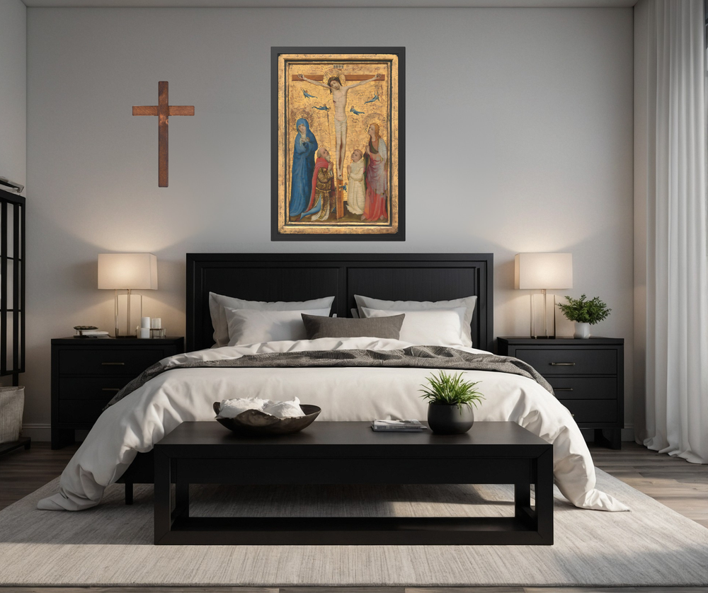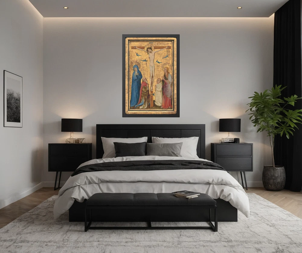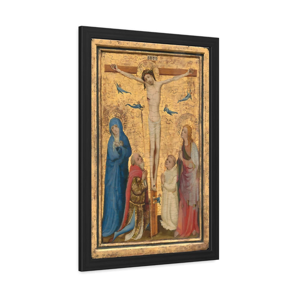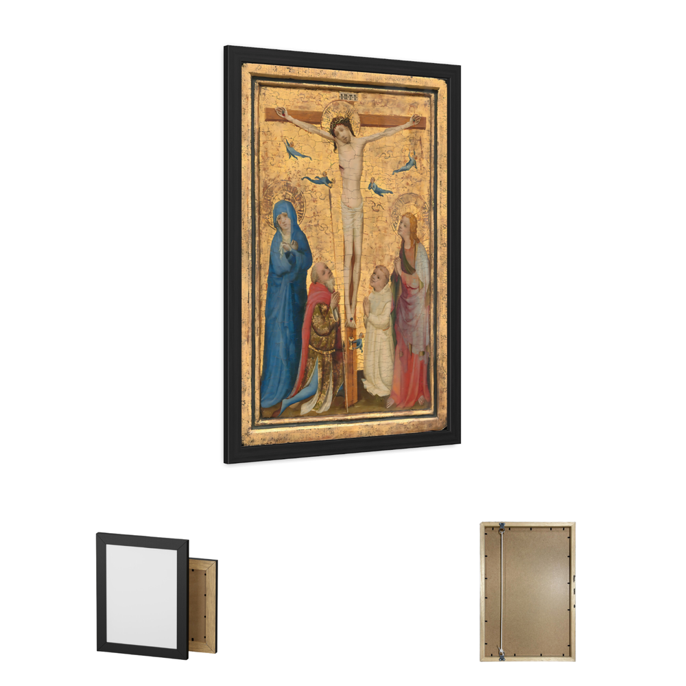 "The Crucifixion" – Renaissance Reproduction Product Description: Step back in time to the profound artistry of the 15th century with " The Crucifixion " by the Master of Saint Veronica. This Renaissance masterpiece captures the emotional depth of Christ nailed to the cross, surrounded by four figures at its base. The symbolic vertical composition reflects themes of Christianity and divine sacrifice, making it a timeless piece for art enthusiasts and those seeking inspiration through biblical artistry. Hypnotik Creations has meticulously reproduced this public domain artwork, ensuring that every detail of the original is preserved with exceptional clarity. Printed in HDR on premium 200 gsm semi-gloss photo paper , this reproduction showcases vivid colors and fine textures that bring the masterpiece to life. The state-of-the-art Mimaki UV Inks provide unparalleled brightness and durability, ensuring the print retains its brilliance for years. Encased in a hand-crafted black wooden frame , the design features a semi-wide, smooth finish that enhances the artwork's elegance while providing sturdy support. The clear Perspex (Plexiglas) insert cover is scratch- and shatterproof, offering superior protection without compromising visual clarity. Made in the USA from eco-friendly materials , including globally sourced and recycled components, this framed print reflects a commitment to sustainability. Delivered ready to hang , the framed artwork includes an enclosed back and a hanging kit for effortless installation. Each piece is custom-made after purchase, guaranteeing the newest condition for your display. Whether for a sacred space, study, or living area, " The Crucifixion " invites reflection and awe into any environment. Key Features: Timeless Renaissance Art: Features Christ on the cross surrounded by four symbolic figures, a profound biblical and symbolic depiction from the early 15th century. HDR Printing: Vivid, crisp colors printed on 200 gsm semi-gloss photo paper with advanced Mimaki UV Inks for a professional finish and lasting quality. Premium Frame: Hand-crafted black wooden frame with a semi-wide, smooth finish, paired with a scratch- and shatterproof Perspex (Plexiglas) cover. Eco-Friendly Materials: Made in the USA using globally sourced and recycled components, reflecting sustainable craftsmanship. Ready to Hang: Includes an enclosed back and a hanging kit, ensuring easy installation right out of the box. Durable and Easy to Maintain: Dust off gently with a clean, dry cloth to keep the artwork pristine. Made to Order: Custom-printed and framed after purchase, guaranteeing the newest condition for your display. Perfect For: Adding a touch of Renaissance elegance to sacred spaces, living rooms, or offices. Art collectors seeking meaningful biblical-themed masterpieces. Gifting to those who appreciate the beauty and symbolism of Christian art. Enhance your home or sacred space with the timeless beauty of " The Crucifixion " . Order now and bring the profound artistry of the Renaissance into your world with this expertly crafted reproduction! 4o