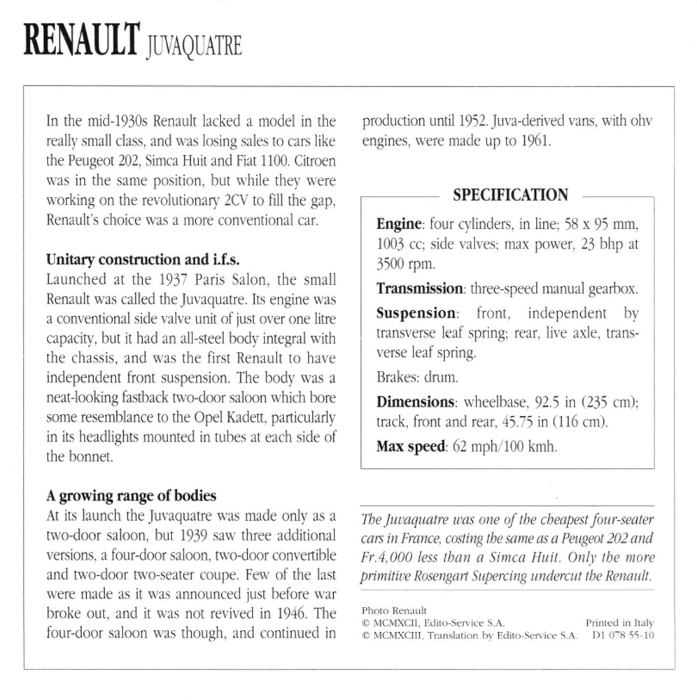 Collectors Club Classic Cars card. Renault Juvaquatre 1937-1952 Popular category. Each card provides information and specifications of the featured car. Excellent condition. Any scanning defects on the images, such as vertical lines, are not present on the actual card. Postage can be combined for multiple purchases. Cards will be protected, and sent in stiff cardboard envelopes.