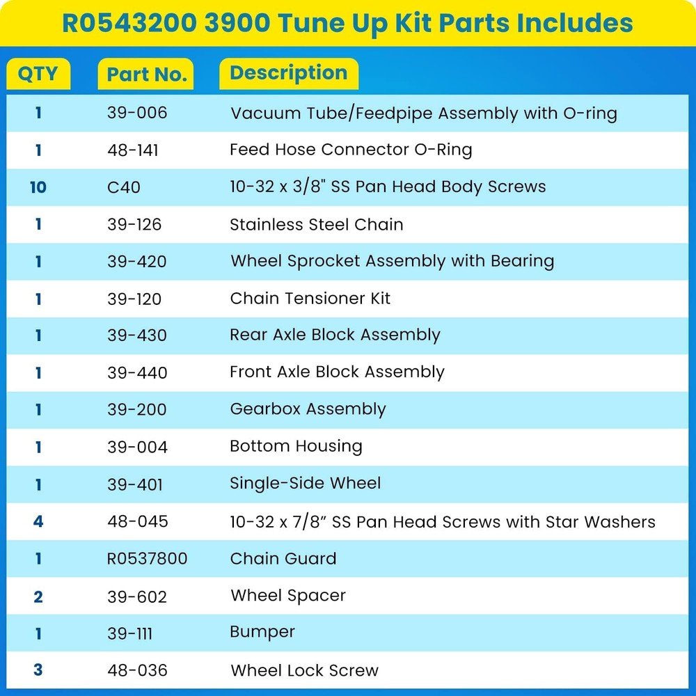 Replace Polaris 3900 Sport F6 Pool Cleaner Factory Tune Up Rebuild Kit R0543200 Great Compatibility: Perfectly fits for All Zodiac Polaris 3900 Sport Pool Cleaners and Polaris P39 Pool Cleaners. Each part is manufactured to meets or exceeds OEM specifications, precision-engineered and tested to provide reliable replacement for Polaris R0543200. Perfect Design: Upgraded single-side wheel design provides 140% increased strength over the previous model for superior operation. New base assembly made of wear-resistant material reduces wear, keeps a clean appearance, makes it look new for a long service life, makes your pool more inviting and easier to maintain. Special Features: This kit comes pre-assembled and replaces every moving part in the cleaner head. It is very easy to install, about eleven screws and your done. Upgraded Tensioner Pulley & Spring, Chain Guard and Gearbox provides optimal performance, long-lasting reliability and high energy saving. Superior Quality: Premium grade CNC machined injection molded reinforced PVC, with stainless steel chain, strength and durability, anti-impact and anti-deformation, anti-corrosion and aging resistance for all-weather performance and long-lasting reliability. Satisfaction Guarantee: If you're not satisfied with the tool, simply return it for a full refund in 60 days.If you have any questions, please feel free to contact us and we will reply you as soon as we can. 1. Payment methods accepted: Payoneer. Our payoneer account allows you to pay by credit card, debit card and your paypal balance. 1. We ship items to Your ebay address.Please make sure your ebay address is correct before you pay, cause it cannot be changed once the order shipped out. 2. All of our items are shipped from our Warehouse in USA. 3. Please feel free to contact us by ebay "Contact member" if you cannot get your order on time. 1. Return to us within 60 days from the delivery date for exchange or refund. Refund will be given as Money back or item exchange (buyer's choice). 2. Return shipping fee is the responsibility of buyer unless the return is a result of our mistake. And all NON-seller mistake returns for refund are subject to 20% re-stocking fee. 3. If you need return, please contact our customer service representative, let us know the detailed problem and send us some pictures for confirmation. 1.Please contact us via ebay using"Contact member". We will respond within 24hours or less.Thank you for your understanding. 2. We maintain high standards of excellence 5-stars and strive for 100% customer satisfaction! Positive Feedback is very important to us. 3. Pls contact us first before you leave Neutral or Negative feedback. We will do our best to solve the problem, thanks!
