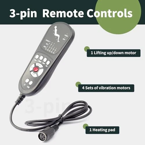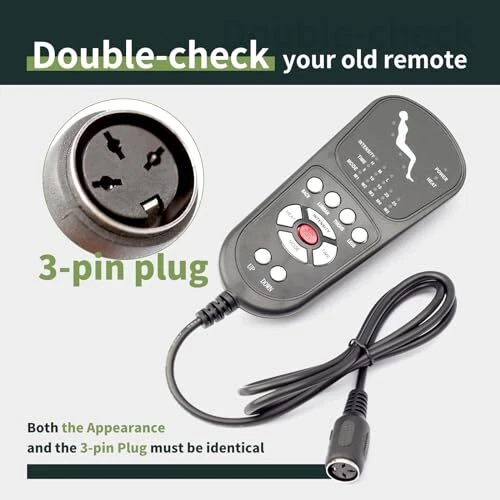 Return Policy Fast Delivery Trusted seller 3 Pin Replacement Massage Function Remote Handset Controller for Recliner Lift Chair, Controls 1 Lifting Up/Down Motor 4 Sets of Vibration Motors 1 Heating Pad Product Description Double-check: Please carefully inspect and compare your old parts with our product images ensuring that both the appearance and the 3-pinPlug are identical, Before making a purchase. Functions: The 3-pin Replacement Massage Function Remote Handset Controller for Recliner Lift Chair Controls 1 lifting up/down motor, 4 sets of vibration motors, 1 heating pad. Features: The 3-pin Replacement Massage Function Remote Handset Controller have 5 Vibration modes, 3 Vibrational Intensities, 5/10/15/20/25 min 5 time options. Quality Materials: The 3 Pin Replacement Massage Function Remote Handset Controller is crafted from stable materials, reliable and steady, with a long lifespan and excellent user experience. Simple Setup: The massage remote controller 3 Pin version connects to the junction box, it uses the chair's 29V power supply Shipping Returns Payment Shipping Shipping is FREE to all addresses other than APO/PO boxes in the lower 48 states. All our stock ships from US-based warehouses. Shipped via USPS or UPS (depending on location and package weight) Unless stated otherwise, all orders will ship within 24-72 hours of your payment being processed. Check our feedback to see the great reviews of FAST shipping we offer. Returns Seller does not accept returns Payment We currently accept payment via eBay managed payments only. Once payment is cleared, we will dispatch your shipment within 1-3 business days. Please refer to the "Shipping" tab for more information regarding shipping speed to your destination.