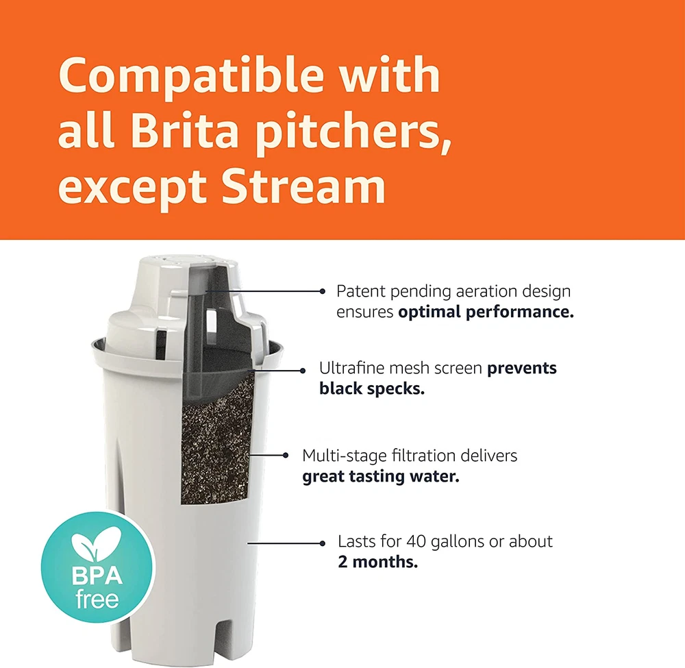 Key Features: Universal Compatibility: Fits Amazon Basics and all Brita pitchers and dispensers, excluding Brita Stream. Great-Tasting Water: Multi-stage filtration technology removes chlorine taste, odors, and impurities, providing fresh water for 40 gallons or about 2 months. Certified Quality: WQA certified to NSF/ANSI 42, 53, and 372 standards, effectively reducing contaminants like copper, mercury, and benzene. Eco-Friendly Choice: Each filter replaces 300 single-use plastic bottles, helping reduce waste and save money. Made in Europe: Quality craftsmanship, lead-free and BPA-free, ensuring reliable, clean water with no pre-soaking needed. Product Description: Upgrade your hydration routine with Amazon Basics water filters, compatible with Brita and Amazon Basics pitchers. NSF/ANSI certified to reduce contaminants and made in Europe, each filter provides clean, refreshing water for up to two months. Save money, reduce plastic waste, and enjoy crisp water without black bits or pre-soaking requirements.