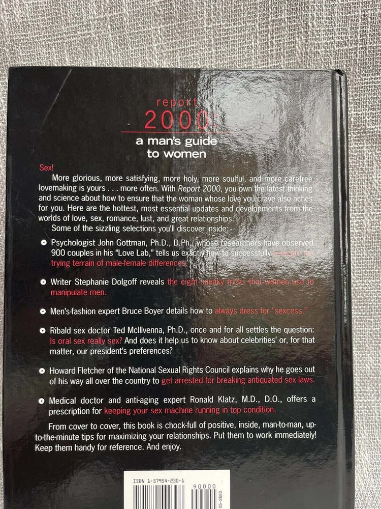Language:EnglishAuthor:Larry KellerPublisher:ManningNarrative Type:NonfictionPublication Year:2000Topic:WomenBook Title:Report 2000 A Man’s Guide To Women