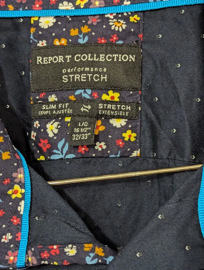 Closure: Button Department: Men Seller Notes: “Pre-Owned” Features: Stretch Type: Button-Up Sleeve Length: Long Sleeve Size: L Size Type: Regular Color: Blue Brand: Report Collection