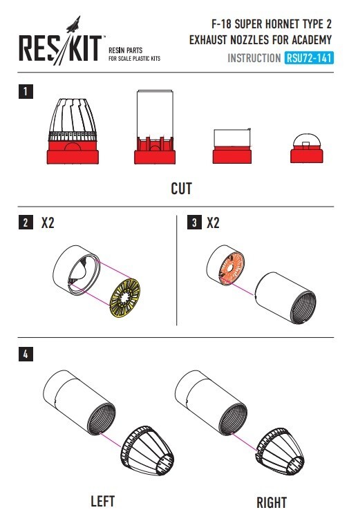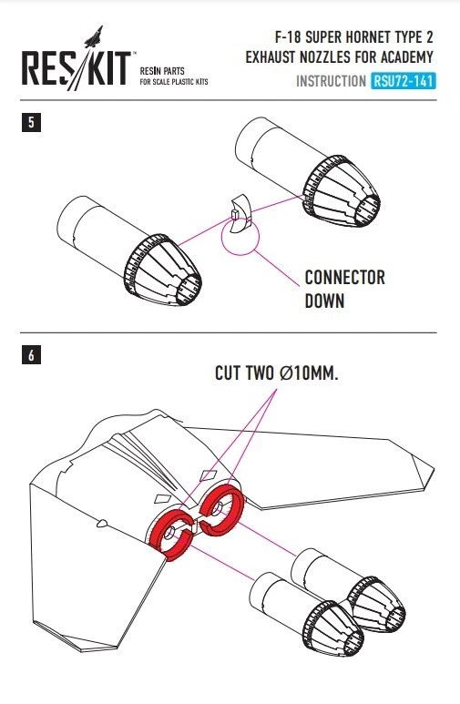 Modified Item: No UPC: 4824595201415 Kit description: Plastic model kit, unpainted, unassembled Unit of Sale: Single Unit Country/Region of Manufacture: Ukraine Assembly Status: Unassembled Kit Item Weight: other Character: Upgrade set for scale model Age Level: 12+ Gender: Boys & Girls gtin13: 4824595201415 Scale: 1:72 Theme: Aerial Material: Resin Vintage: No Set Includes: Aircraft details Item Width: other Color: Multicolor Features: Kit, Unpainted, Unassembled Type: Aircraft Kit Franchise: other Customized: No Brand: RESKIT Subject: F/A-18 "Super Hornet" type 2 exhaust nozzles for Academy kit Character Family: Upgrade set for scale model Item Length: other Item Height: other