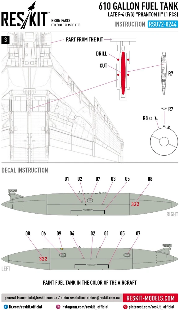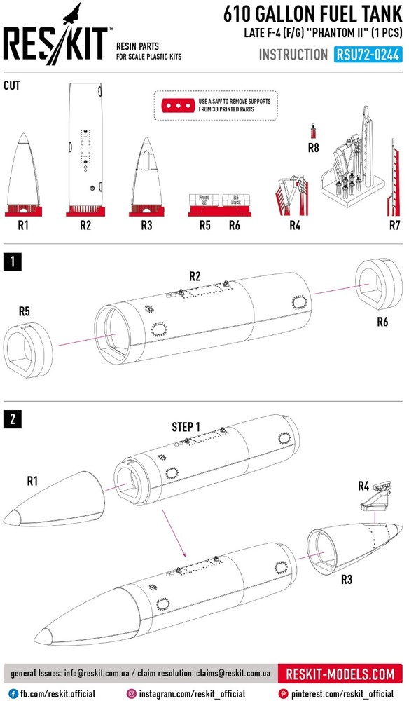 ResKit RSU72-0244 Scale 1:72 610 gallon fuel tank late F-4 (F, G) "Phantom II" (3D Printing) - for Plastic Model Kit ---------------------------- If you have a desire to procure a GREATER NUMBER OF ITEMS THAN WHAT IS CURRENTLY DISPLAYED, kindly let us know, and we will happily modify our offerings to suit YOUR EXACT QUANTITY NEEDS. ---------------------------- Scale: 1/72 Manufacturer: RESKIT (Accessories for Scale Plastic Kits) Country/Region of Manufacture : Ukraine Features: Kit Condition : New in Box Type of equipment : Aircraft Type of product: FUEL TANKS Recommended kit: Any Resin fuel tanks set ---------------------------- Reskit: The Ultimate Upgrade for Your Scale Models Reskit is the leading provider of upgrade sets for scale models, offering a wide range of products to enhance the realism and detail of your models. Our sets include everything from engines and interiors to exterior accessories and weapons. Whether you're a beginner or a seasoned modeler, Reskit has the upgrade sets you need to take your models to the next level. Here are just a few of the benefits of using Reskit upgrade sets: Increased realism and detail: Our sets are made with high-quality materials and components that will add a touch of authenticity to your models. Improved performance: Our sets can help improve the performance of your models, making them more realistic and engaging. Reskit upgrade sets are the perfect way to add realism, detail, and performance to your scale models. With our wide range of products, you can find the perfect upgrade set to transform your models into showpieces.