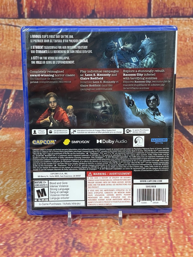 This product is a brand new, factory sealed copy of Resident Evil 2 for the PlayStation 5. Released in 2017, this action/adventure game is part of the popular Resident Evil series known for its zombie theme. Published by Capcom, this M-rated game offers a thrilling experience for fans of the franchise. The NTSC-U/C (US/Canada) region code ensures compatibility with consoles in that region, making it a must-have for collectors and gamers alike.