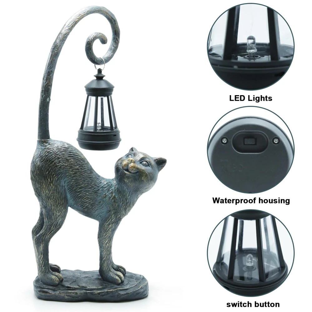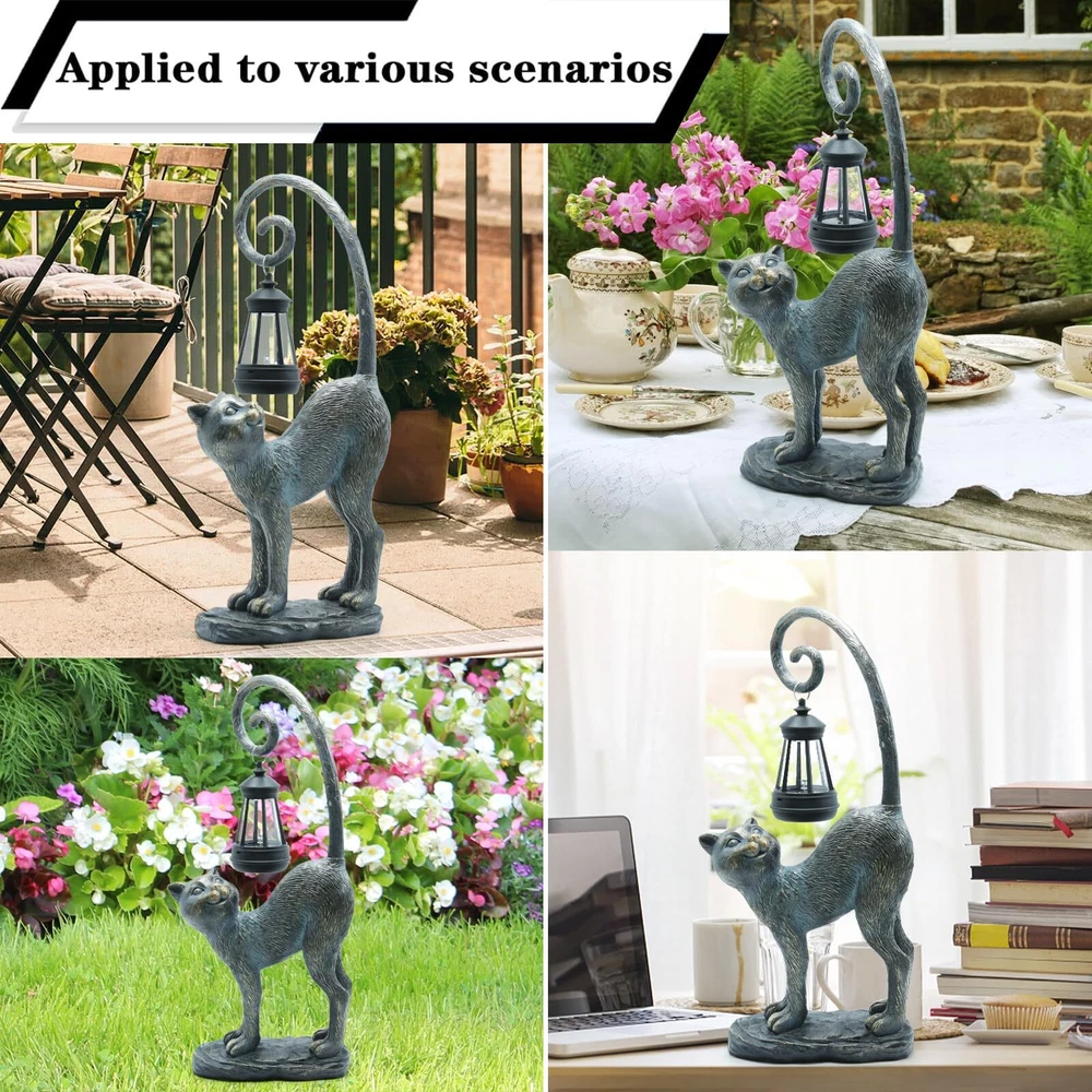 Compact Size: Please note that this Solar cat statue is not a large sculpture. Its compact size is perfect for accentuating your space without overwhelming it. (15.3" x 7.3" x 3.5“ ) Safe and Non-Toxic: Crafted with your safety in mind, this garden sculptures & statues is made from high-quality resin materials that are safe and non-toxic for both indoor and outdoor use. And the garden statues is built to withstand the elements, ensuring long-lasting beauty for your space. Charming Handcrafted Design: This cat statue captures the essence of a playful cat, complete with a lifelike expression and an intricately designed tail that holds a beautifully crafted solar lantern. Solar-Powered Lantern: The solar lantern automatically charges during the day and emits a warm, inviting glow in the evening, creating a magical ambiance in your chosen location.No wiring or electricity is required. Simply place the statue in a sunny spot, and it will light up your area after dark. Versatile Placement: Suitable for a variety of indoor and outdoor scenes, this cat outdoor decoration can be a charming addition to your garden, patio, living room, or any space you choose. Perfect Gift: This solar cat statue makes a thoughtful gift for cat lovers, garden enthusiasts, or anyone who appreciates unique and charming decor.