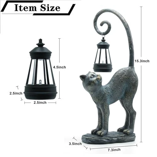 30 Days Return Policy Fast Delivery Trusted seller Resin Cat Statue with Solar Lantern, Eye-catching Garden Sculpture Decor,15.3" Height Outdoor Figurine for Garden Yard Patio Decorations,Birthday Gifts Product Description Compact Size: Please note that this Solar cat statue is not a large sculpture. Its compact size is perfect for accentuating your space without overwhelming it. (15.3" x 7.3" x 3.5“ ) Safe and Non-Toxic: Crafted with your safety in mind, this garden sculptures & statues is made from high-quality resin materials that are safe and non-toxic for both indoor and outdoor use. And the garden statues is built to withstand the elements, ensuring long-lasting beauty for your space. Charming Handcrafted Design: This cat statue captures the essence of a playful cat, complete with a lifelike expression and an intricately designed tail that holds a beautifully crafted solar lantern. Solar-Powered Lantern: The solar lantern automatically charges during the day and emits a warm, inviting glow in the evening, creating a magical ambiance in your chosen location.No wiring or electricity is required. Simply place the statue in a sunny spot, and it will light up your area after dark. Versatile Placement: Suitable for a variety of indoor and outdoor scenes, this cat outdoor decoration can be a charming addition to your garden, patio, living room, or any space you choose. Perfect Gift: This solar cat statue makes a thoughtful gift for cat lovers, garden enthusiasts, or anyone who appreciates unique and charming decor. Shipping Returns Payment Shipping Shipping is FREE to all addresses other than APO/PO boxes in the lower 48 states. All our stock ships from US-based warehouses. Shipped via USPS or UPS (depending on location and package weight) Unless stated otherwise, all orders will ship within 24-72 hours of your payment being processed. Check our feedback to see the great reviews of FAST shipping we offer. Returns As our valued customer, we will do our best to make sure the product you receive arrives to you on time and as expected. If you are not satisfied with your purchase, please contact us within 30 days of receiving your order to process a return. Payment We currently accept payment via eBay managed payments only. Once payment is cleared, we will dispatch your shipment within 1-3 business days. Please refer to the "Shipping" tab for more information regarding shipping speed to your destination.