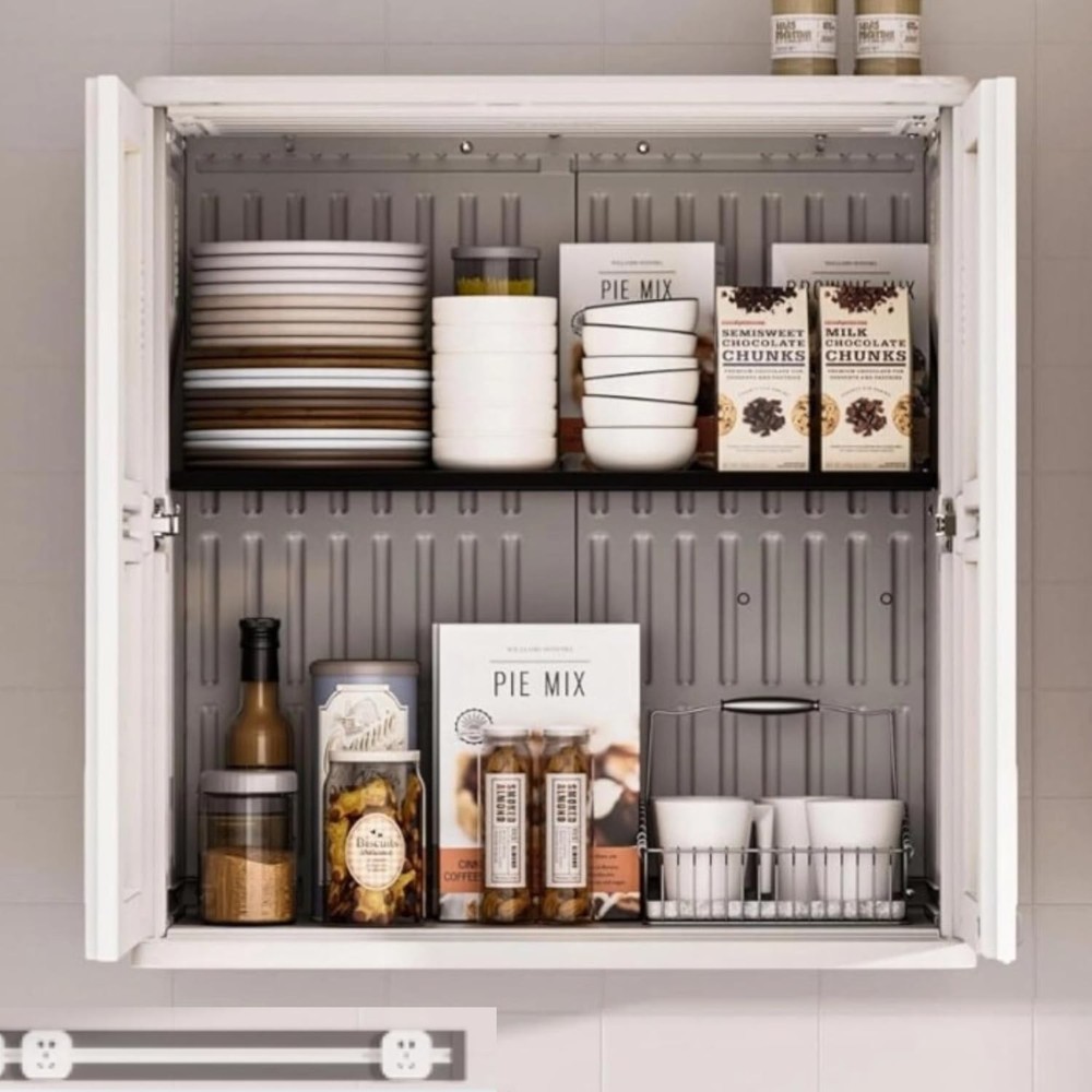 Kitchen cabinet with sliding doors and adjustable shelves for versatile storage