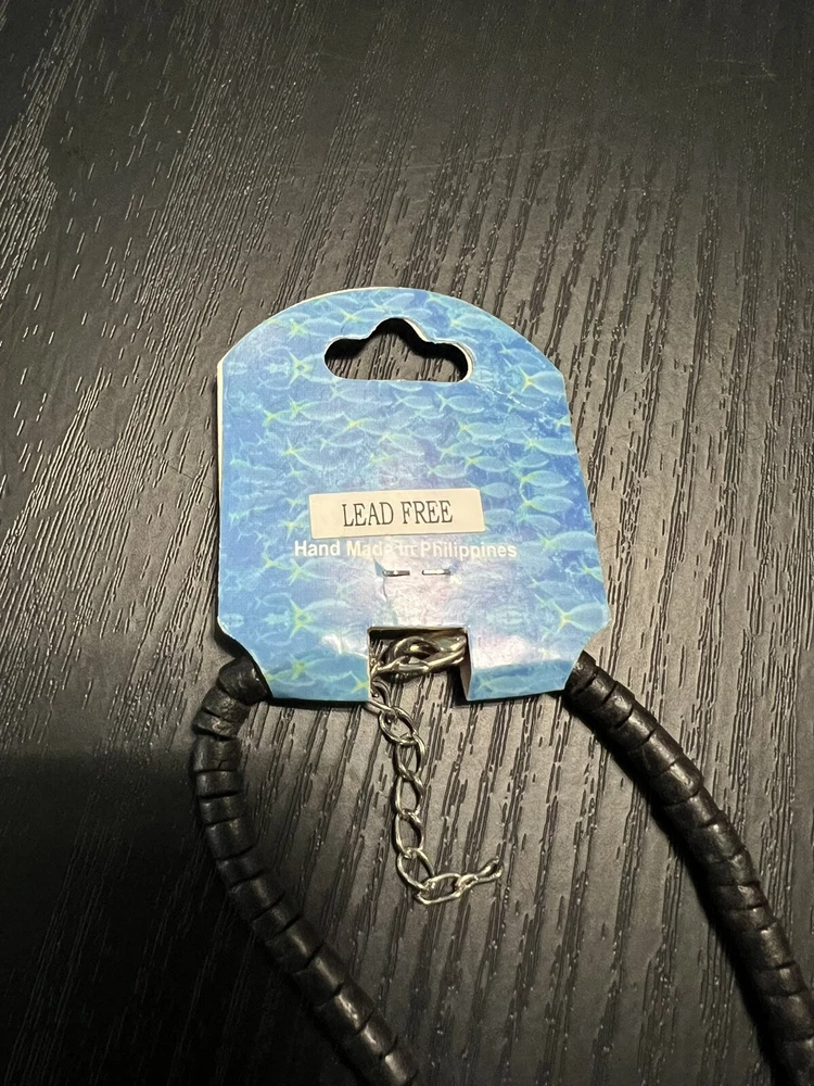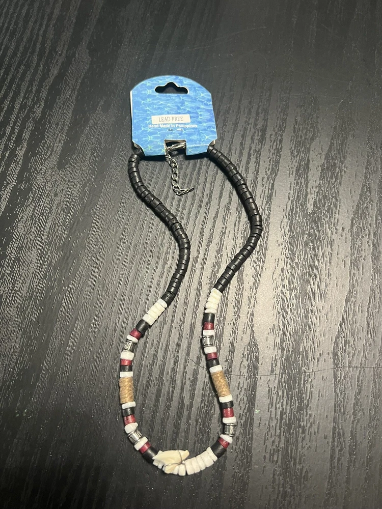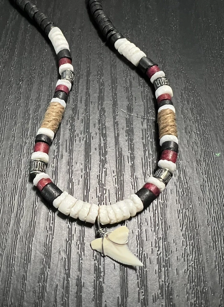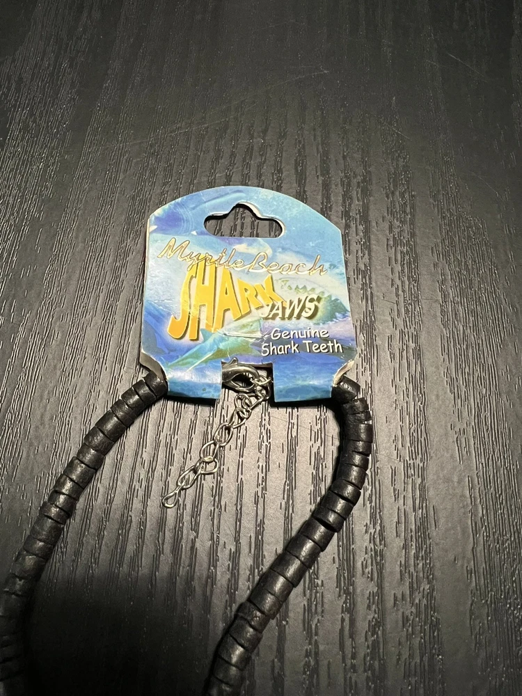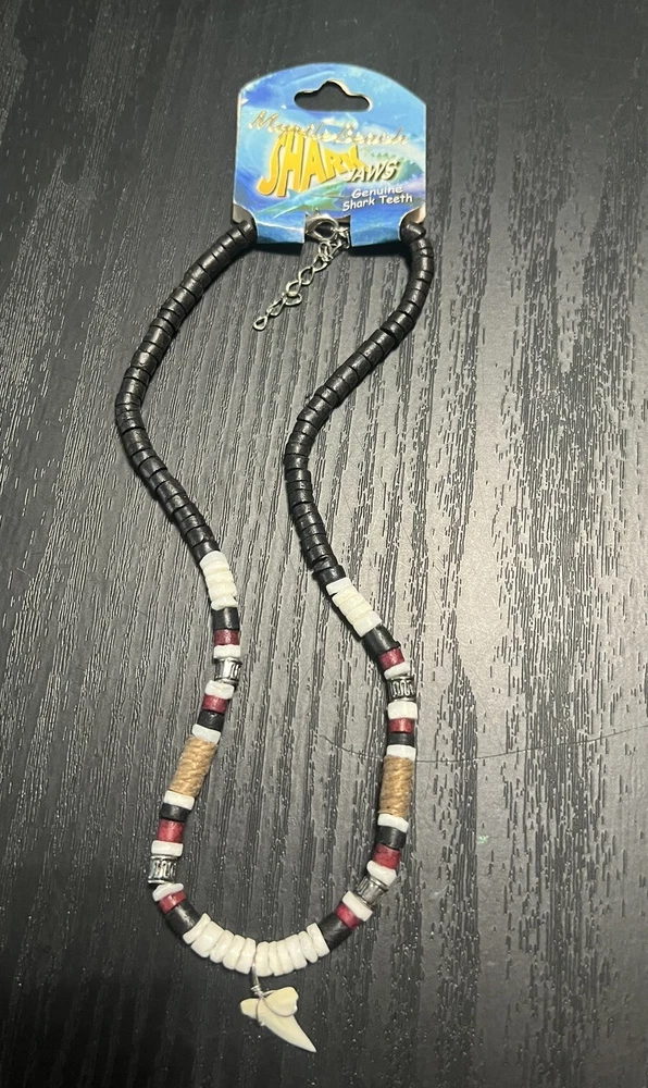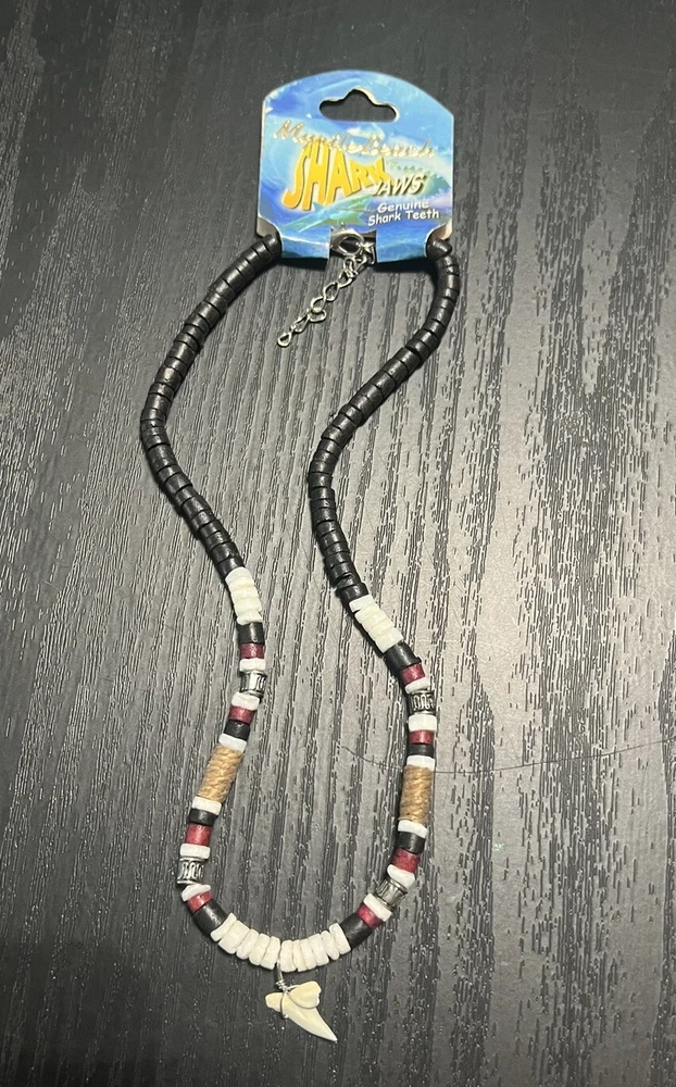 From Myrtle Beach, this unique necklace features a beautiful pendant made of resin with a shark tooth design. The beads add a touch of style to this piece, making it perfect for beach lovers and those who appreciate sea life. The necklace comes with a tag that guarantees its authenticity and quality. It is perfect for anyone who loves surfer-style accessories or wants to add a unique touch to their wardrobe. The necklace is versatile enough to be worn with any outfit and is sure to make a statement.