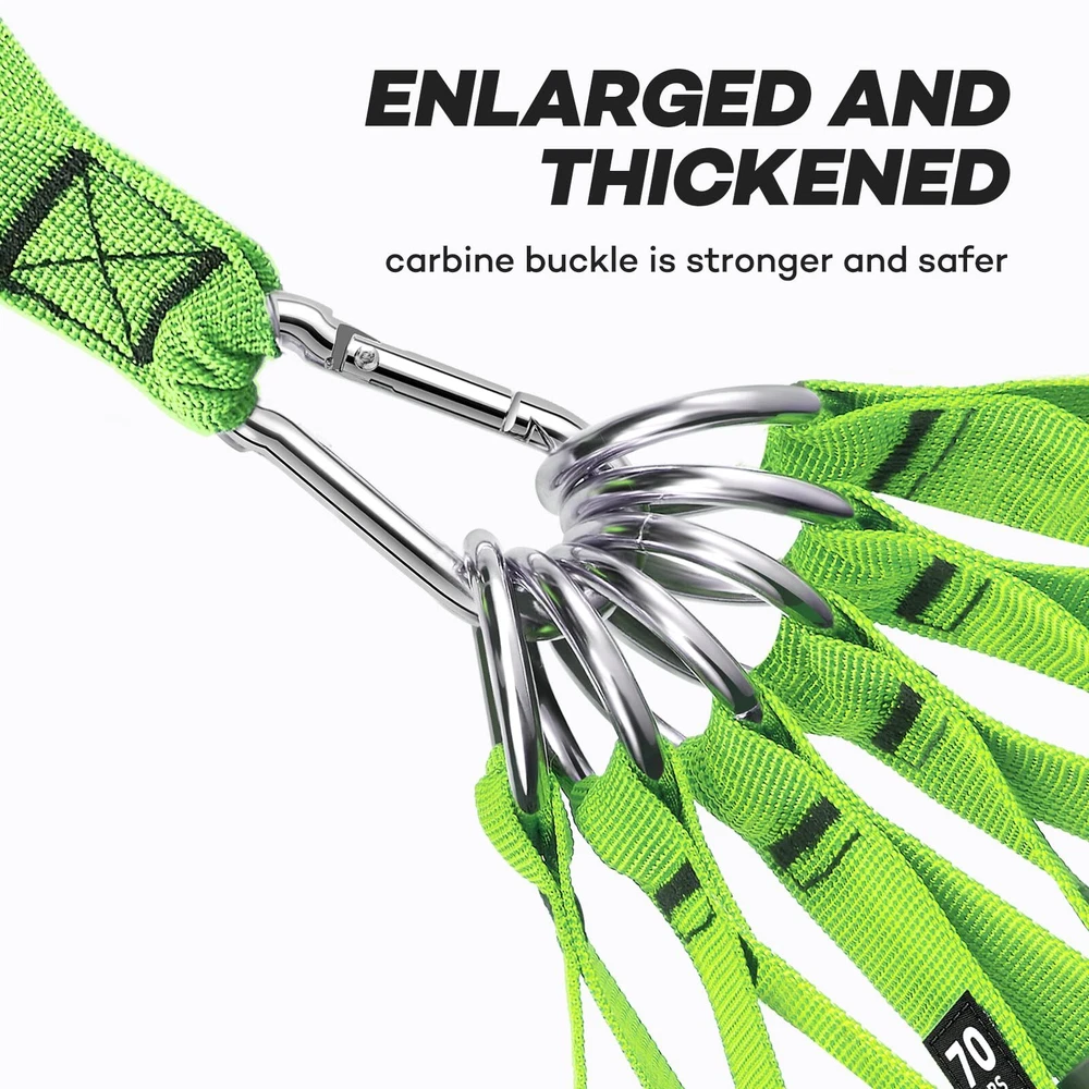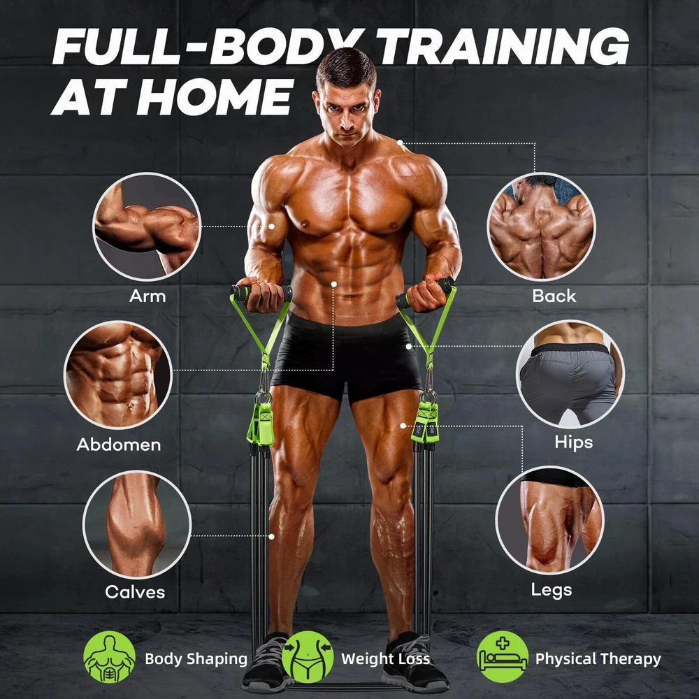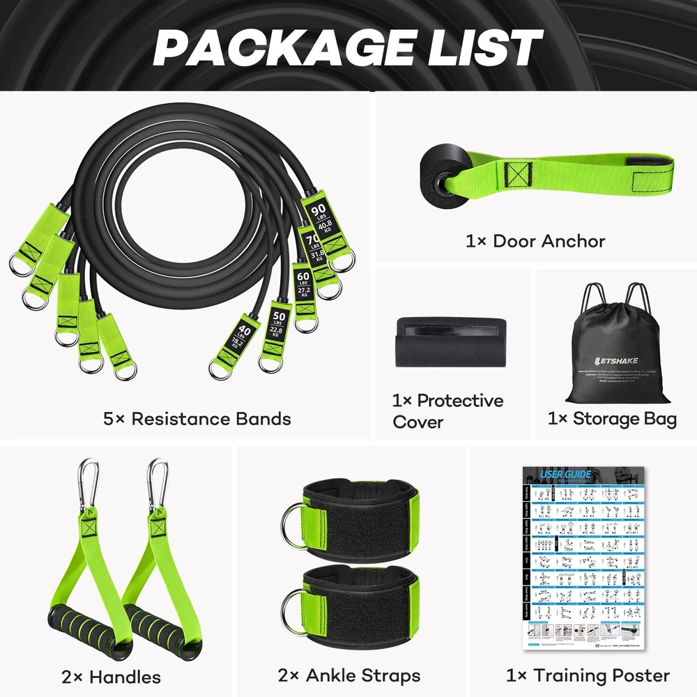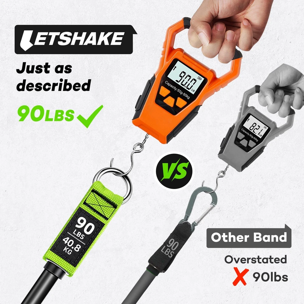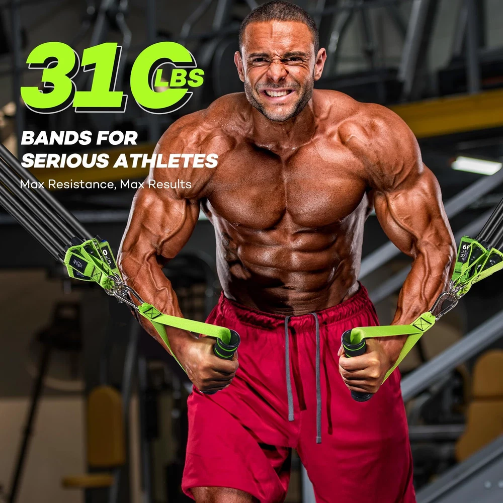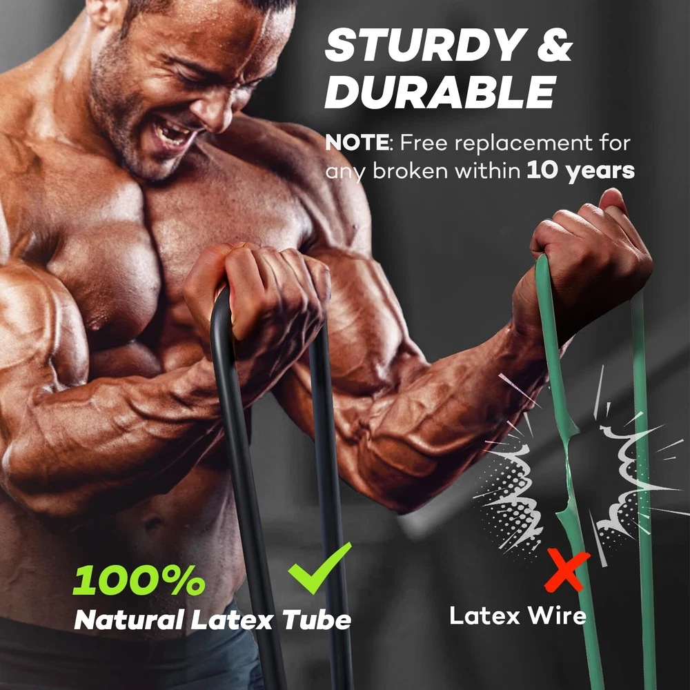Powerful Performance: These heavy duty resistance bands can handle workouts up to 310 pounds with multiple tension levels (with the number of progressively larger bands from 40 to 90 lbs, you can go from a light workout to unbelievably tough) for all fitness abilities Versatile Workouts: Loop the bands around doors, poles, or yourself to perform hundreds of exercises like rows, chest presses, squats, lunges, bicep curls and more anywhere comfortably Sturdy Consruction: Made of heavy duty latex (has a nice consistent stretch to it), these bands can withstand extended use and maintain their shape stretch for long lasting quality workout after workout Comfortable Handles: The handles are larger than the traditional handles and are very comfortable Carry Anywhere: These resistance bands (lightweight and compact) comes in a very useful bag for storage and can be taken for traveling or portability when storage space is scarce Smooth and Comfortable: The latex material contours comfortably to the body without pulling or pinching skin during intense resistance workouts