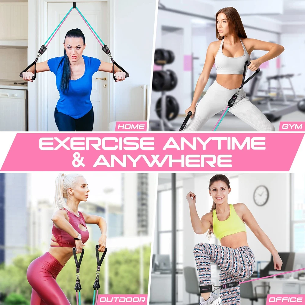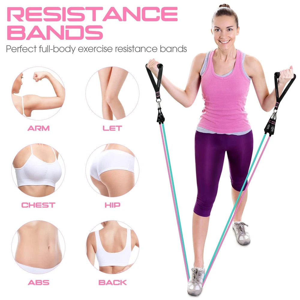 made of the highest quality natural latex, which is extremely durable, provide consistent resistance for every movement and give you enough flexibility to do hundreds of different exercises from beginner level through advanced. Key Features: Workout Anytime, Enjoy a morning workout in your hotel room or on your patio at home. Made of the highest quality natural latex, each tube band are double layered. You can choose a resistance band alone, or multiple resistance bands in combination to meet the different requirements. More Range of motion, suited for yoga, pilates, stretching. Exercises in multiple planes of movements, engages core and stabilization muscles. Suitable for all age groups, fit for all levels of fitness, as effective as dumbbells. Usage Tips: The first step after you buy the resistance band is to store them somewhere inside the home or your gym. The fact that resistance bands are soft and flexible, so they do need proper storage to ensure prolonged life and prevent sudden failures. Don’t Overstretch the bands more than 2.5 times the original length. Some people, in order to increase resistance from the same resistance band color, either double folds the band or shortens the length which leads to the issue of overstretching. So, it is advisable to instead go for a thicker resistance band for matching your improving stamina instead of overstretching the existing color bands. Adjustable Resistance Bands Set: 5 resistance levels, Pink 10 lbs, Medium pink 20 lbs, Blue 30 lbs, Grey 40 lbs, Black 50 lbs. Stackable exercise bands, both in 51", maximum resistance is 150 lbs Quality Materials and Workmanship: stretch bands made of high quality rubber, good elasticity. strong metal buckle connection to stop breakage. non-slip Handles, Strong wear resistance Multiple Workout Cenario: The resistance bands with handles can be great with any popular workout like Pilates. Yoga and Boxing more. Or use them for general exercise, stretching, strength training, Physical Therapy, Shape Body programs Portable and Easy To Store: The resistance work out bands suit is easy to carry and comes with a waterproof bag for you. whether at home, in the gym or when traveling, you can all use it to exercise at any time. whether it's for your own use or as a surprise, it's your best choice Complete Workout Band: You will get 5 resistance bands, 1 door anchor, 2 ankle straps, 2 handles, 1 massage ball, 1 instruction manual and 1 portable storage bag. Multiple and complete accessories allow you to switch up your workout for even more