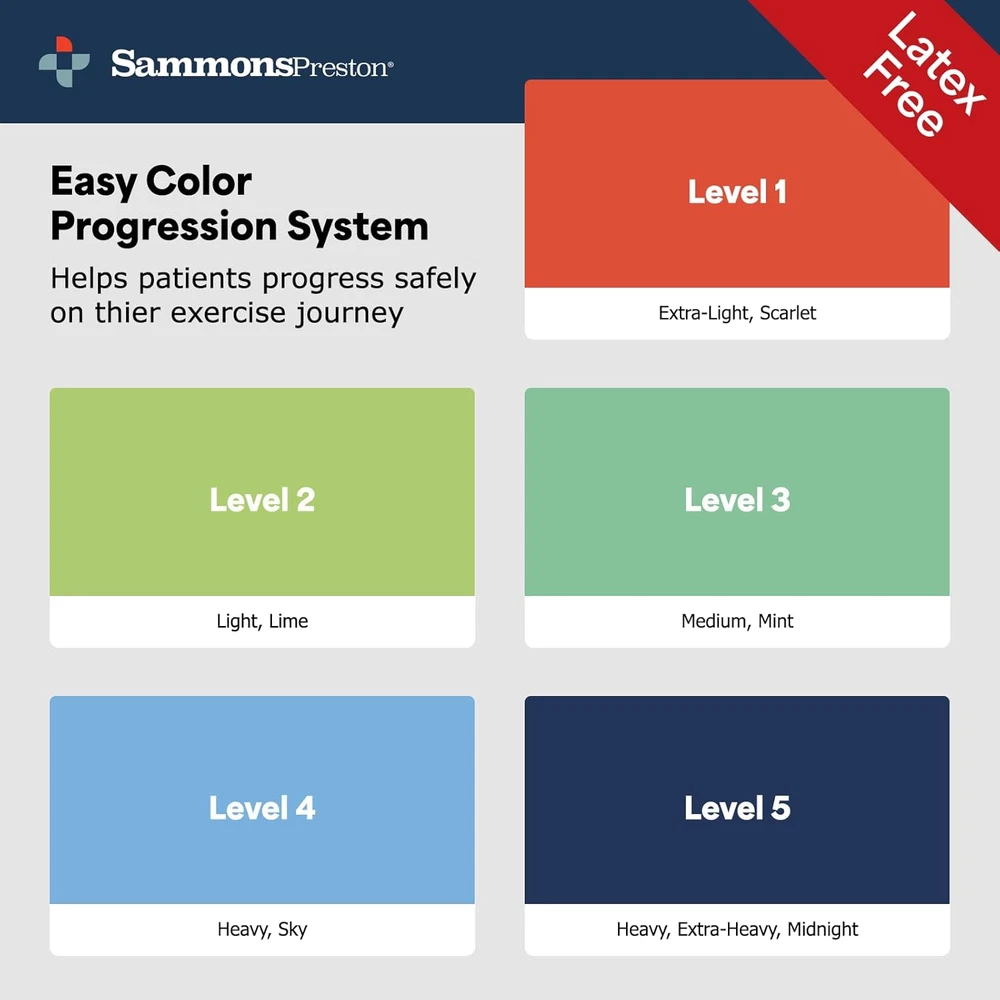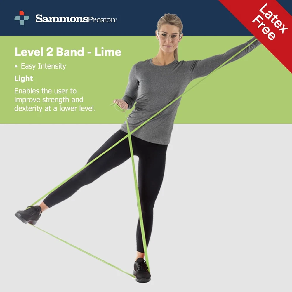 Store New Arrivals Add to Favorite View Feedback Contact Fast deliveries to the customer's home Quality customer service John Make the customers happy! Resistance Bands for Working Out, Non-Latex Exercise Bands, Resistance Bands for Physical Therapy, Improve Strength & Flexibility, Stretch & Tone Major Muscles, 5Pk Description Latex-free and powder-free formulation is designed to enable safe and effective exercises without the potential for causing a latex allergy reaction. Each band is 5' long x 4" wide and includes all five bands from level-1 extra light, level-2 light, level-3 medium, level-4 heavy, and level 5-extra heavy. The value priced pack in five increasing resistance levels, supports progressive exercise and advancement to the next level when you are ready. Stretches, tones & conditions all major muscles groups for a simple, effective, full body workout that can be performed anywhere. For over 50 years, Sammons Preston has been the premier brand in aids to daily living and homecare devices. Sammons Preston products are adaptive living aids that help people cope with their environment. Whether you are a therapist or patient, someone with special needs, or just have a need to make life easier and more accessible, Sammons Preston products can help you. Occupational therapists, physical therapists, nurses, and other healthcare professionals rely on Sammons Preston adaptive utensils, adaptive plates and silverware, nosey cups, reachers and grabbers, grab bars, sock pullers, shoe horns, dressing sticks, hip kits, leg lifters, back scrubbers, gait belts, wheelchair belts, trays, and wheelchair accessories. These are the same high quality professional products used in hospitals, clinics, and nursing homes. Item model number 15430 Color Multi-Color Material Synthetic Rubber Country of Origin Taiwan Item Weight 11.2 ounces Department unisex-adult Sport Stretching Package Dimensions 5.12 x 4.53 x 1.81 inches; 11.2 ounces ABOUT US We offer the best prices around on high quality products. Our E-store includes media such as books, movies, music and games while offering electronics, toys, sporting apparel, clothing, tools, general home, garden items and more. SHIPPING We are always working hard to ensure your package arrives as soon as possible. Please understand that some factors like weather, high postal traffic, and the performance of shipping companies are outside of our control. We offer free shipping to the lower 48 states and ship within 2 business days of payment, usually sooner. We do not accept P.O. Boxes. Please provide a physical address. For shipping outside of the continental USA, we only use eBay's Global Shipping Program. The item is shipped to KY and then sent to the rest of the world. International customers are responsible for all duties and taxes. Continue to 'check out' to calculate costs for shipping the item to your country. Messages regarding eBay's Global Shipping Program MUST be directed at eBay EXCLUSIVELY. RETURNS We offer a 30-Day Return Policy on items in which you are not completely satisfied with. You have the option of a full-refund or an exchange of the item. No returns are available on items shipped outside of the USA PAYMENT We accept PayPal. CONTACT US This page content is yet to come Please ad us to your favorite seller and visit again later Thank You CUSTOMER SATISFACTION We try our very best to make sure every customer is completely satisfied. If there's a problem, message us! We're happy to help. WE ACCEPT