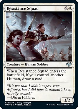 Game:Magic: The GatheringAdditional Description:Resistance SquadAttribute/MTG:Color:WhiteCard Type:Creaturebrand:Wizards of the CoastCreature/Monster Type:Human, SoldierManufacturer:Wizards of the CoastCard Name:Resistance SquadRarity:UncommonIllustrator:Joshua RaphaelCard Number:32Defense/Toughness:2Cost:2 WLanguage:EnglishSet:Innistrad: Crimson VowFinish:RegularAttack/Power:3Card Text:When Resistance Squad enters the battlefield, if you control another Human, draw a card.