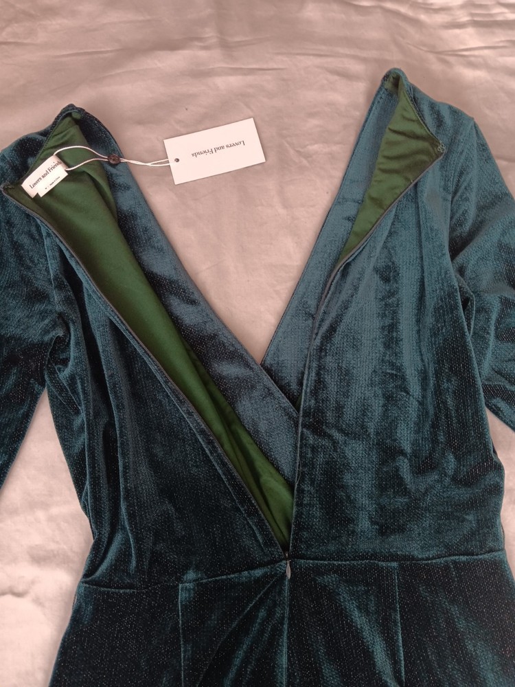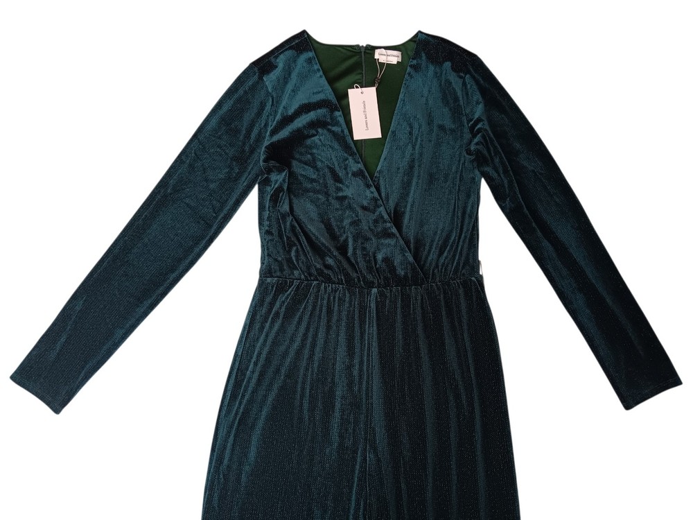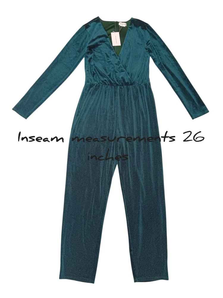 NWT Resloves Lovers and Friends Hart Jumpsuit Deep Emerald Green Size M Event . It does not come with the belt. Otherwise, it is in excellent condition. Please see the photos attached for details. The measurements are in the photos.