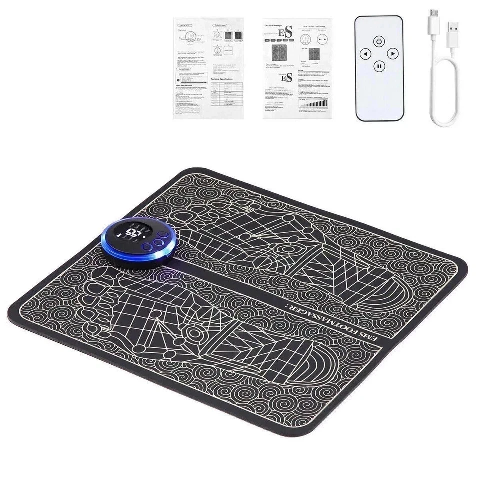 Relax and relieve tired feet with this EMS Foot Massager Pad . Designed with TENS pulse technology , it stimulates muscles and improves circulation, helping reduce foot fatigue after long days of standing or walking. This lightweight and foldable massager is easy to carry and store, making it perfect for home, office, or travel use. The USB-powered design allows convenient charging from power banks, laptops, or adapters. Features EMS / TENS pulse technology for effective muscle stimulation Helps relax feet and improve blood circulation Heated function for additional comfort Foldable and lightweight design for portability Soft PU leather and foam material for comfortable use Easy USB power supply Specifications Condition: Brand New Body Area: Foot Color: Black Material: PU Leather & Foam Massage Function: TENS Machine Power: USB Length: 29.5 cm Width: 32.5 cm Weight: 100 g Package Includes 1 × EMS Foot Massager Pad 1 × USB Cable 1 × Controller