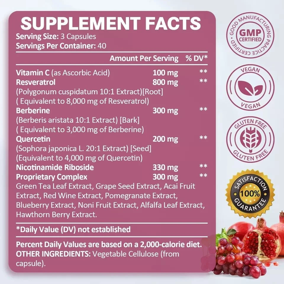 Resveratrol 8000mg Extra Strength with Berberine Quercetin Green Tea Extract ... SOURCE OF ANTIOXIDANT- Our product takes Berberine Powder Extract and Resveratrol Nutritional Supplements and combines them with a Quercetin Supplement,Nicotinamide Ribosideand Grapeseed Extract and the results are amazing. In addition,we added Vitamin C,Acai Fruit Extract, Red Wine Extract,Pomegranate Extract,Blueberry Extract,Noni Fruit Extract,Alfalfa Leaf Extract,Hawthorn Berry Extract. This powerful formula supports immune function and cardiovascular health,Rejuvenate you and radiate your energy HIGHLY BIOAVAILABLE FORMULA-Our ingredients come from sources rich in polyphenols -- equivalent of 8000mg Resveratrol from the PolygonumCuspidatum Root Extract,equivalent of 4000mg Quercetin flavonoids from organic Sophora Japonica, equivalent of 3000mg Berberine from Berberis aristata Bark Extract.And,Green Tea Leaf Extract,Grape sed Extract,Acai Fruit Extract,Vitamin C full of potent polyphenols, In one complex.which helps with anti-aging,overall health and immune system. CONCENTRATED TRANS-RESVERATROL-Revitalize your health with Trans-Resveratrol complex, your daily dose of heart health and longevity. A powerful antioxidant that protects your cells, supports cardiovascular health, and promotes a longer, healthier life. Perfect for those looking to enhance their well-being naturally, this supplement helps combat oxidative stress and maintain vital functions. Embrace the path to a vibrant future with our potent, heart-friendly formula. HIGH-QUALITY :Totaria Resveratrol complex Plus is formulated with high-quality all-natural ingredients with no fillers or binders of any kind. It is vegan-friendly and non-GMO and contains no artificial colors, no artificial flavors, gluten, soy, or dairy items. Complete care has been taken to ensure optimal nutrient retention. SUGGESTED DOSE:Take 3 veggie capsules daily, preferably in the morning, suitable for adult men and women. Our capsules are easy to swallow and digest. Do not exceed the recommended dose and consult with a physician before consuming. Do not consume if you are allergic to any of the ingredients. Contact us We can be contacted at any time through eBay messages if you have any questions, comments or product requests. We will respond to you within 24 hours and do our best to help you out! We encourage our customers to contact us with any questions or concerns! We'd like to be sure you are completely satisfied with your purchase.