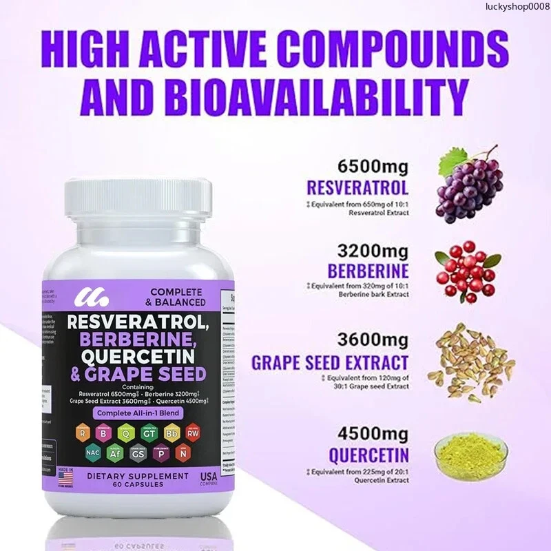 The powerful sources of antioxidants - resveratrol (an effective antioxidant known for its anti-aging properties), quercetin, a flavonoid compound rich in antioxidants, and berberine - provide a complete approach to promoting youthful vitality and overall health. High dose synergistic ingredients - using our strongest resveratrol nutritional supplement to release vitality, help fight against free radicals, support immunity, and promote NAD cell regeneration. Each serving contains 6500 milligrams of resveratrol, which is higher than other products. Choose this healthy antioxidant supplement over sugary resveratrol gummies for better health benefits. Exclusive complete polyphenol mixture - including Nori fruit extract, rich in vitamins and antioxidants; Red wine fruit extract, which contains resveratrol and other beneficial compounds, contributes to overall health; Pomegranate extract provides additional antioxidants, while alfalfa leaf extract is a source of vitamins, minerals, and chlorophyll, supporting overall nutrition