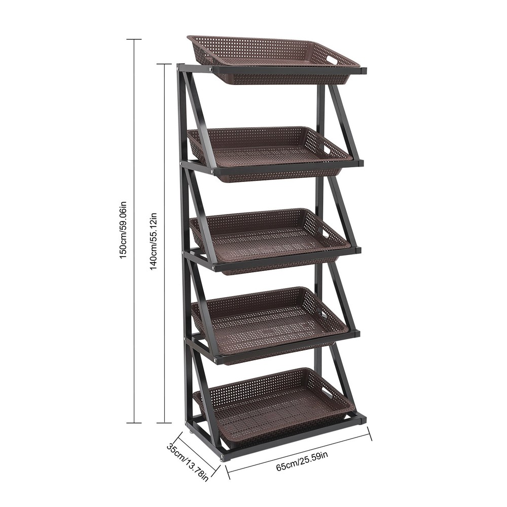 Retail Display Rack, Market Shelf, Fruit Vegetable Snack Basket Description Featuring a five-tier basket design, this retail display rack combines practicality and simplicity. It has ample storage space for a variety of vegetables, fruits, and other sale items, keeping your space neat and organized. The modern and stylish design adds a touch of decor to the space while providing a practical storage solution. It is great for helping to organize storage! Application It is suitable for the display of fresh fruits and vegetables in supermarkets, snacks in stores and convenience stores, as well as vegetable storage in household kitchens. Package Included 1* Rack 5* Baskets Retail Display Rack Market Shelf Fruit Vegetable Snack Basket With Five Baskets Retail Display Rack, Market Shelf, Fruit Vegetable Snack Basket Description Featuring a five-tier basket design, this retail display rack combines practicality and simplicity. It has ample storage space for a variety of vegetables, fruits, and other sale items, keeping your space neat and organized. The modern and stylish design adds a touch of decor to the space while providing a practical storage solution. It is great for helping to organize storage! Key Features Ample Storage Space: The product comes with 5 large storage baskets, you can easily categorize fruits, vegetables, toys, books, snacks, etc., making your space more neatly organized and pleasing to the eyes of your customers. High Load-bearing Capacity: Triangular stabilized structure, reinforced frame, and high-quality materials allow you to withstand a heavy load without collapsing, giving you a piece of mind. Eye-catching Appearance: Attractive coffee baskets and the minimalist black frame collide together to add a touch of decor to your space and make the customer's mood more pleasant. Thoughtful Design: The open design with slanted baskets allows customers to see products at a glance, making them easy to select and pick up. Good Breathability: Hollowed-out baskets design and elevated layer spacing increase the permeability of vegetables and fruits, etc., keeping them fresh and healthy. Effortless Cleaning: The smooth surface and removable baskets make cleaning easy. You just need to simply wipe it with a damp towel when it gets dirty. Assembly in a Breeze: Without complicated installation steps, a simple structure allows you to install it in a short time. Quality Service: We stand behind all our guests and look forward to assisting you with your purchase. It is our pleasure to answer your confusion and questions. The end of the story between us is not "we sell and you buy". Details Convenient Handles: Each basket has handles on both sides for better removal. Protective Cover: The end cutouts of the frame are equipped with a protective cover to prevent cuts and scrapes. Application It is suitable for the display of fresh fruits and vegetables in supermarkets, snacks in stores and convenience stores, as well as vegetable storage in household kitchens. Specifications Color: Coffee+Black Style: Modern Shape: Rectangular Mounting Type: Floor Mount Assembly Required: Yes Number of Baskets: 5 Overall Product Size: 65*35*150cm/25.6*13.8*59in Rack Height: 1.4m/4.6ft GY8HI6-000400 (Baskets) Gross Weight: 4kg/8.8lbs Net Weight: 3kg/6.6lbs Package Size: 57*37*15cm/22.4*14.6*5.9in GY8HI6-000700 (Rack) Gross Weight: 4kg/8.8lbs Net Weight: 3kg/6.6lbs Package Size: 130*35*9cm/51.2*13.8*3.5in Package Included 1* Rack 5* Baskets Notes Please note that his product does not include the vegetables and fruits shown in the picture. We send the rack and baskets separately to protect the product from damage during transportation. Please wait patiently for all parts to arrive. Please allow the slight color difference caused by the shooting light and 1-3cm error due to manual measurement, and make sure you do not mind before you order. Welcome to the goforbigsales! We are committed to providing customers with better and more favorable products ! If you have any questions, please feel free to contact us ! Thank you for your support! Payment Delivery details Terms of sales About us Contact us Payment We accept ebay payment 。 Fees such as import duties, taxes are not included in the item price or shipping costs. These charges are the buyer's responsibility. Delivery details Shipping: 2-9 working days to: USA Terms of sales We maintain high standards of excellence and strive for hundred percent customer satisfaction. Feedback is very important to us. We hope that you contact us immediately before you give neutral or negative feedback, so that we can address your concerns. It is impossible to address issues if we do not know about them! About us Your satis faction is our ultimate goal. We work hard to earn your trust and future business. Our certified technicians have tested each item before shipping. The unit comes with 1 year limited warranty on all manufacturing defects. a) If you receive a defective item, you may return it or ask for a discount. Please contact us within 14 days after you receive the package. b) What you returned must be intact and in its original packaging as re? u. Customer is responsible for shipping costs of the returned item. c) We will cover the cost of shipping back t with the shipping rate indicated in the registration page. We will send you a new unit or refund the full payment you paid. Thank you. Contact us Business Hour Business Hour: Monday To Friday: 8:30 AM to 5:00 PM (Beijing China time) Due to time zones, our reply to your questions may not be immediately. But within above working time, we will reply your email within 24 hours. If it's non-workdays, please kindly be patient and wait till Monday. Please contact us with ebay message. Please feel free to contact us if you have any questions. Monday To Friday: 8:30 AM to 5:00 PM (Beijing China time) Due to time zones, our reply to your questions may not be immediately. But within above working time, we will reply your email wi