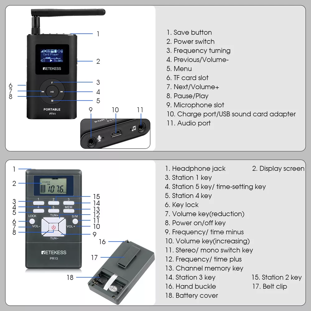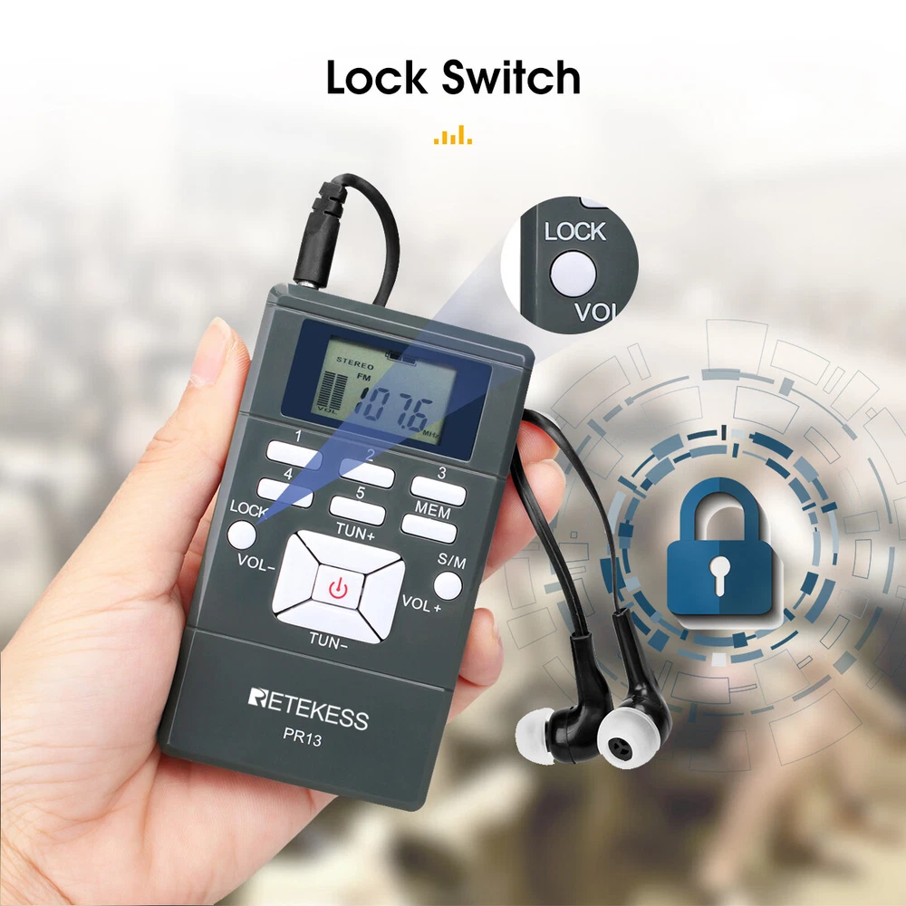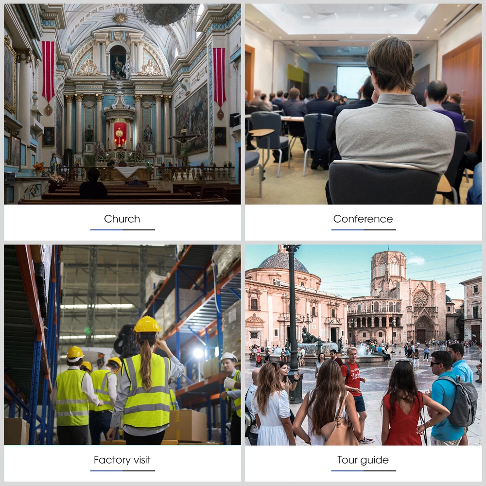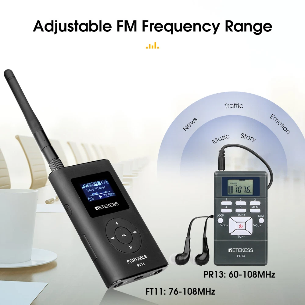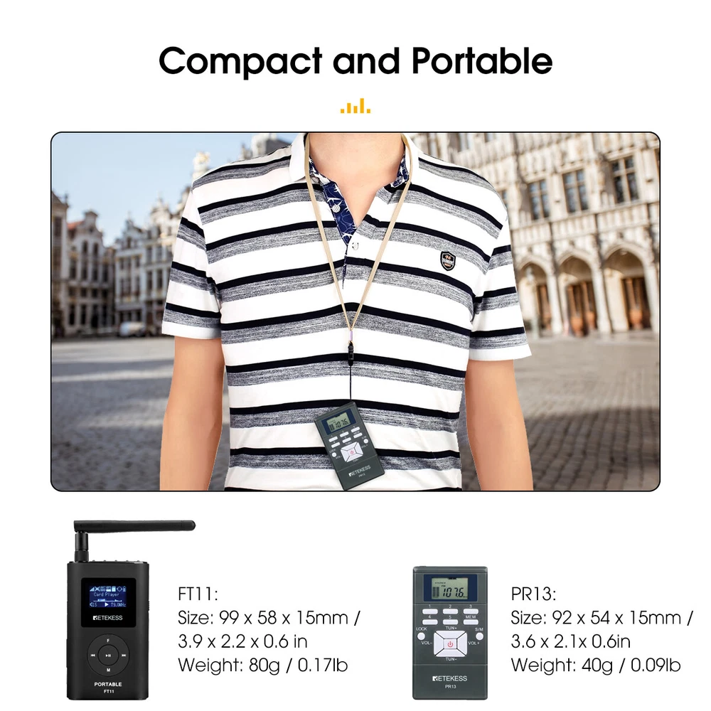 Features: Portable fashion design, good touch feelings Support transmit lossless music through the memory card and AUX input jack 3.5mm AUX input: transmit music from your smart phone, computer, MP3 or CD player Support store five commonly used transmission frequency Built-in microphone, support external condenser microphone Long press the MIC button to speak, release to end, easy to use FM frequency range 60-108MHz Automatic search and manual search the radio stations 5 station presets: you can manually store five favorite stations Press the 1-5 keys to quickly select storage station Mono / stereo selectable With 24-hour digital clock If you want to buy at more favorable price, or want to freely match the receiver, please contact customer service Shipping Service:Priority DHL Express from China to deliver item(2-7 business days) The frequency range of the transmitter is 76~108MHz. The frequency range of the receiver is 60~108MHz. You can adjust it according to your need when you listen to music or talk show. The transmission distance of the transmitter is 50-80m. You can clearly hear the introduction of the tour guide, even you fall behind the team. (Note: The actual transmission distance is affected by the environment and the battery status). With 5 stations preset, you can save stations that you like. You can easily use the TUN button to manually or automatically search stations. It is convenient to immediately reach and listen to the preset station you like with the number key. FT11 With built-in 1500mAh battery, the transmitter can continually work for 6-8 hours. No frequent charging matter, it is efficient to support a long-time conference. The battery powered receiver is convenient to use and can be easily taken with you anywhere. (Note: 2×AAA battery is not included). You can save some anecdotes of tourist attractions on your phone or TF card in advance. When travelling, you can share them with tourists through the AUX cable and TF card. (Note: The AUX cable and TF card are not included). The receiver supports mono sound and stereo sound. Mono sound offers you a louder sound. Stereo sound brings you an immersive listening experience. You can select as needed. With built-in microphone, the pastor can walk freely in the church when speaking. The external microphone can be clipped to the collar to free your hands. (Note: The wired microphone is included). The earphones are used as the antenna. Adopting DSP technology, the receiver is efficient to reduce noise and transmit clear audios, offering an enjoyable listening experience. It is efficient to prevent the receiver from changing current frequency and volume with the lock switch. You don’t need to worry about affecting worship or meetings. The volume is adjustable. In a worship or a conference, you can adjust the proper volume with button to ensure you can clearly hear the sound. FT11: Size: 99 x 58 x 15mm / 3.9 x 2.2 x 0.6 in Weight: 80g / 0.17lb PR13: Size: 92 x 54 x 15mm / 3.6 x 2.1x 0.6in Weight:40g / 0.09lb Adopting DSP technology, visitors can hear the clear sound transmission when machine are working. Prayers can easily finish a-long-time worship and don’t feel tired with lightweight and portable radio. Falling behind the team, tourists can clearly hear the sound. Wherever attenders sit, they can clearly hear the meeting contents through their earphones. Solution Introduction: This simultaneous interpretation solution is achieved as follow: the voices are transmitted via transmitter's(FT11) microphone to interpreters and corresponding listeners equipped with receiver( PR13). Then they are interpreted into different languages and transferred to receiving apparatus(PR13) by means of transmitter's microphones outfitted for relative audience's listening. Application Scene: This simultaneous interpretation solution caters for following event: forum speech, academic exchange, product launch, business celebration and so on, depending on product specifications and features. Solution Features : To recommend utilization on a small meeting Operating range: max. 100 m (indoor) Portable apparatus, making it convenient to carry and conserve very easy to set and operate Slim, making it comfortable to wear Composition of simultaneous interpretation solution: transmitter + receiver Note: If this solution cannot meet your demand, please contact our Customer Care Center and we will customize your product according to your requirements. Reminder: Please inform us of your application scene, environment, product quantity and other relative information in order to provide better service for you. Main Product Specifications : Transmitter Channel Number 5 CH Frequency increase 0.1MHz Pre-emphasis 50us/75us Output impedance 50 ohm SNR >=70dB Frequency response 30Hz~15000Hz Support mp3 format FLAC, WAV, WMA, MP3 Support memory card Max 32GB Power Built-in 2000mAh polymer lithium battery Working hours 6-8 hours Charge DC 5V 1A, Micro USB jack Size 99 x 58 x 15mm / 3.9 x 2.2 x 0.6 in Weight 80g / 0.17lb Radio Sensitivity <3.5uV Signal to noise ratio 45db Stereo separation 32dB Power supply 2 x AAA batteries (not included) Earphone jack 3.5mm Tuning increase 0.1MHz Built-in speaker No Dimension 92 x 54 x 15mm / 3.6 x 2.1x 0.6in Weight 40g / 0.09lb Package Include: 2X Transmitter 30X Receiver 30X In-ear earphone 30X Lanyard 2X USB charging cable 2X Wired microphone Hand strip English manual About Us