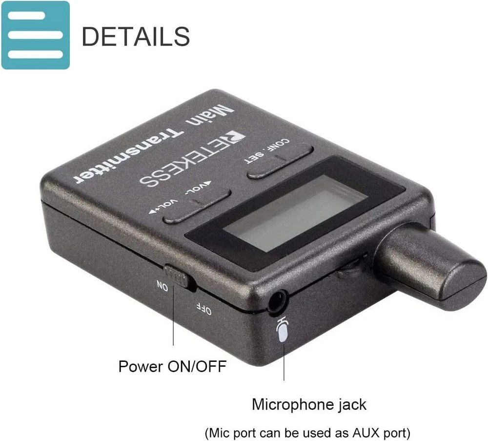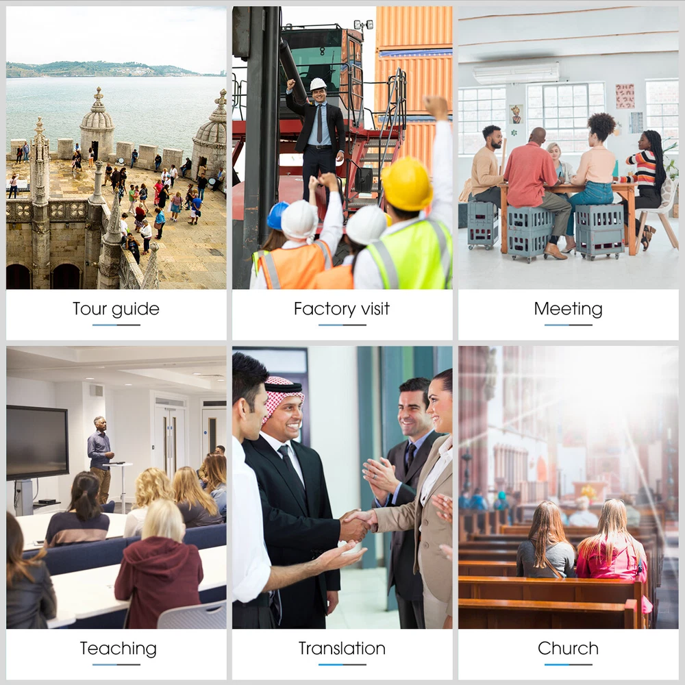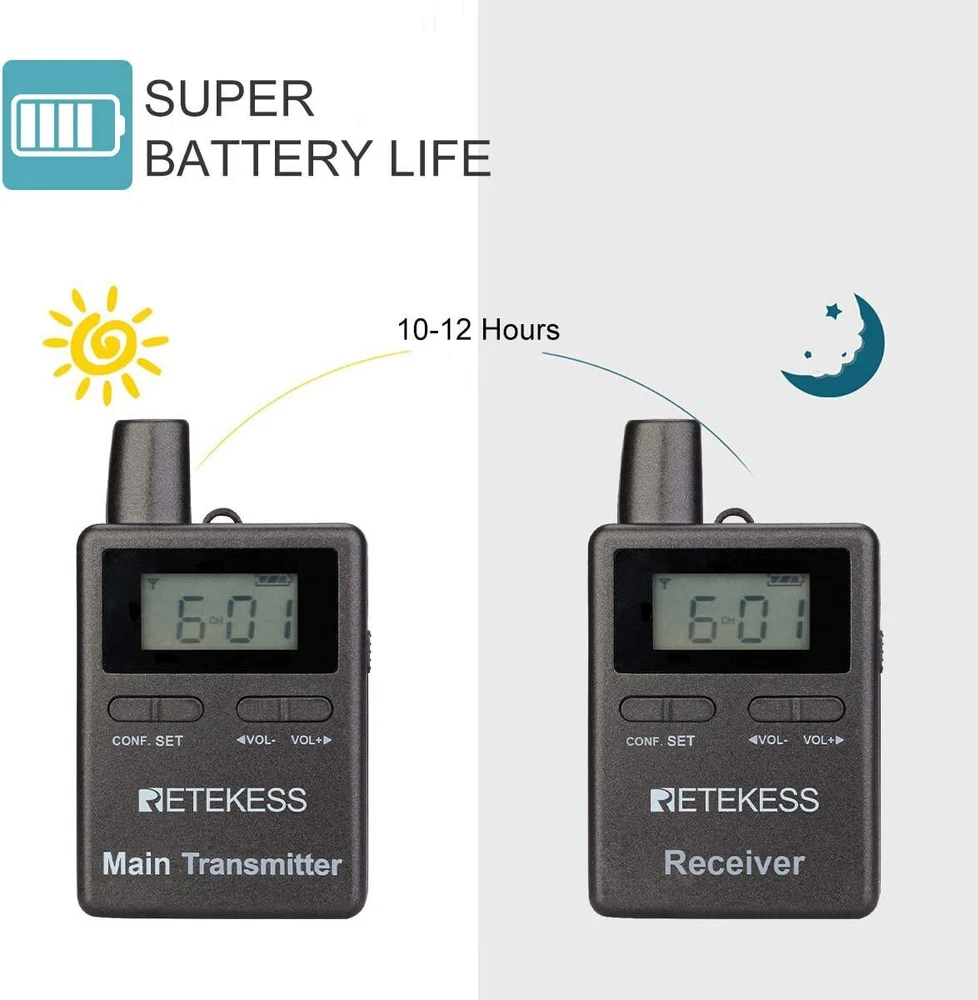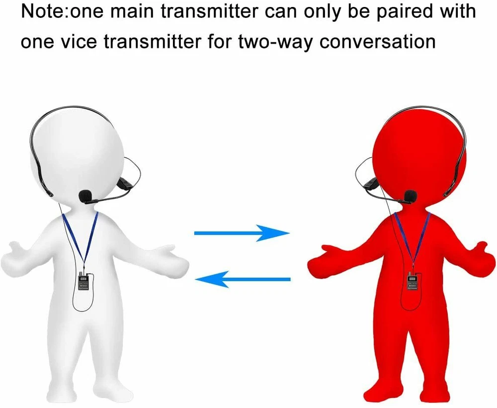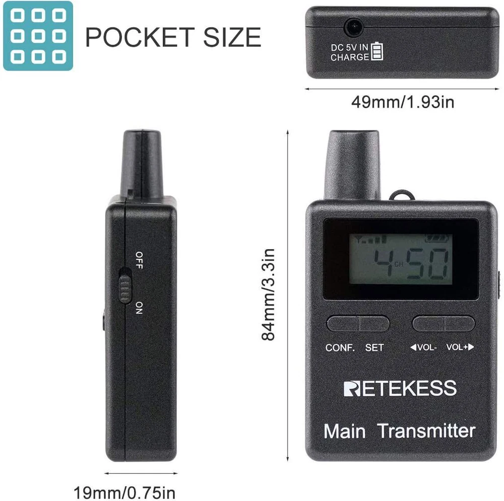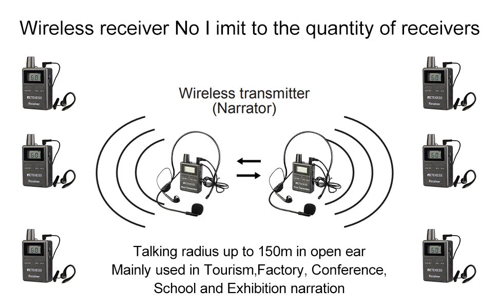 无标题文档 Shipping Service:Priority DHL Express Service when items ship from China.(2-7 business days) TT105 2.4GHz Professional Wireless Tour Guide System for Traveling Museum Visit Conference Features: 2.4GHz signal transmission with stable audio quality Two-Way communication: allowing two speaker speaking at the same time One-key Receivers channel synchronization function saves much time 150 meters communication distance in the open air 50 channels to choose, up to 50 groups tour at the same location Built-in rechargeable lithium battery, long battery life Pocket size and light weight, easy to use Description: Dual speakers TT105 tour guide 2 way receiver system supports two transmitters in a group talking to each other, at the same time, all receivers can clearly hear what the two transmitters are saying, suitable for two tour guides' trips, double-hosted meetings, or factory tours. (Note: the secondary transmitter cannot be used alone) Long-range two-to-many mode The communication distance between the two-way transmitters is 328ft/100m and between the transmitter and receiver is 492ft/150m. Two presenters can communicate in both directions 100m apart and their listeners can listen to the message clearly at a range of 150m from them. MIC input and AUX input Microphone port can be used as an AUX port, you can use a 3.5mm AUX cable to connect the transmitter and audio device for audio transmission, so your visitor or listener can hear music or other voice files from an external audio device. Long standby time TT105 dual-speaker wireless tour guide system has a built-in rechargeable lithium battery with long battery life. When fully charged, the transmitter can be used continuously for 10 hours and the receiver can be used continuously for 12 hours. You don't need to charge it frequently, and you don't have to worry about the device running out of power and affecting the tour activities. 2.4G universal frequency Tour guide 2 way receiver system uses 2.4G universal frequency, you can use it all over the world. And the 2.4G transmission signal is more stable, private, and noiseless, with crystal clear sound, so your visitors can enjoy a comfortable narration process. Volume adjustment The two transmitters have a volume level of 0-4, and the receiver has a volume level of 0-9. The listener can freely adjust the desired volume with the volume adjustment buttons. If you use it for noisy outdoor tours, or factory visits, or if you have hearing-impaired listeners, the wide range of adjustable volumes will definitely help you. Automatic channel synchronization Just one step to set all transmitters and receivers on the same channel. Easy to operate, it only takes ten seconds to complete the pairing. Save time, you don't have to adjust the receiver's channels to the same one by one. Portable dual-speaker tour guide system The main transmitter and vice transmitter weigh 60g and the wireless receiver weighs only 51g, lightweight and small size, users won't feel discomfort when wearing them because of the heavy equipment. This also makes it easy for you to carry a tour guide system anywhere you go. Add receivers As your team expands, you can add as many receivers as you need. The newly added TT105 receiver can be paired with the TT105 transmitter and work together. That means you can purchase as many transmitters and receivers as you like, and we have a variety of combinations to meet the needs of different teams, as well as 32-port and 40-port charging cases for you to choose from. If you have other quantity combination needs, contact us to get them. Comfortable accessories Main transmitter and vice transmitter with headset microphone, the host can hang it on the ear, and the microphone position from the mouth can be adjusted at will to achieve better noise reduction and clarity. Receiver with ear-mounted single-sided headphones, comfortable to wear and not easy to fall off, even if the team is on the march, the microphone and headphones will not fall off. Specification: T ransmitter Frequency range 2400-2480MHz Channel 50 channels Output power 10mW Power supply Built-in 1500mAh lithium battery Working time About 10 hours Working distance 150 meters (open air) Size 84 x 49 x 19mm Weight 60g Receiver Frequency range 2400-2480MHz Channel 50 channels Power supply Built-in 1000mAh lithium battery Working time About 12 hours Size 84 x 49 x 19mm Weight 52g Package Includes: 1 x Main transmitter 1 x Vice transmitter 20 x Receiver 2 x Microphone 20 x Single earphone 22 x Charging cable 22 x Lanyard 1 x English manua About Us