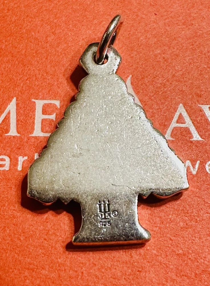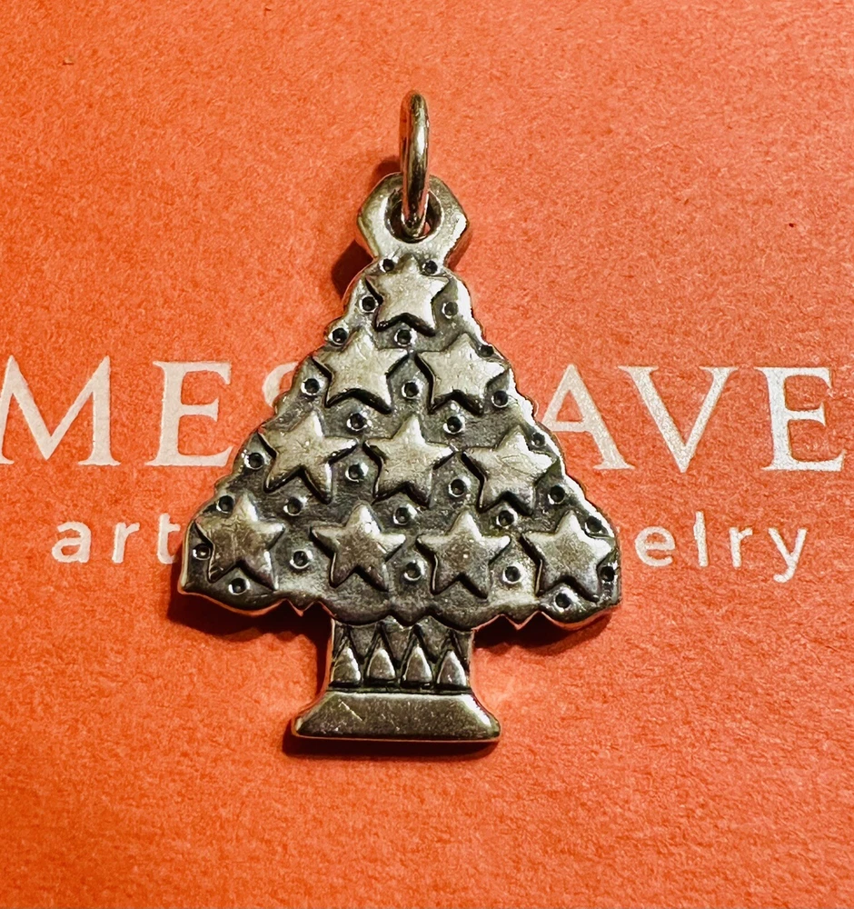 This is a retired James Avery charm in the shape of a Christmas tree with stars. It is made of 925 sterling silver and does not have any stones. The charm is perfect for adding a festive touch to a bracelet or necklace.