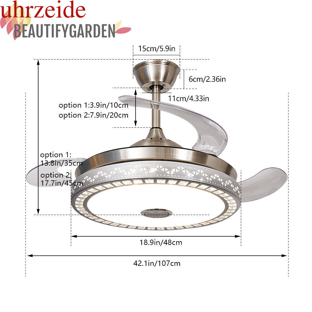 Style: Modern Type: Ceiling Fan Chandelier Light Source: Led Lighting Board(Included) Switch: Wireless Bluetooth&remote control 6 fan speed: low-high Light color:3 regular colors change by remote/colorful light change by bluetooth( Need to download APP to control it) Timing function:1/2/4 hours Voltage:110V-220V(FIT YOUR COUNTRY) Wattage:36-40w Applications:8-25㎡,Living Room, Ding Room,Bedroom, Study Room, Corridors, Foyer, Kitchen, Restaurant, bar, coffee shops etc Dimension: Diameter:42in /106 cm(blades open) Lampshade diameter:18.9in/48cm DownRods:10CM/4in +20CM/7.87in (Two rods, installed according to your ceiling height) Total height:35/45cm(depends on downrods) Lampshade:ABS+metal frame Blades: Acrylic Electronic materials: Steel+ copper wire Material: High quali Retractable Ceiling Fan w/ LED Light and Bluetooth Speaker 7 Changing Color USA Updated about this item: Fan blows forward and reversely: cooling in summer(Fan blows forward) With cold wind, strong wind can increase the flow of cold air Warm in winter(Fan blows reversely ) Cooperate with warm wind to improve indoor air circulatio About this item 【Remote Control】Integrating turn on light with 3 color changes (white, warm white, neutral white) , 6 wind speeds, you can use the remote control to choose the color you like. 【Invisible Ceiling Fan】With retractable ABS blades, the blades will stretch out and put inside automatically when turned on and off the fan, saving space for your room. 【crystal】Absolute stunning when lights turned on, make your room full of luxury sense. 【Applications】Ideal for living room, dining room, foyer, villa, bedroom, restaurant, study room, and other places to decorate lighting fixtures. 【Customer Service】If you have any issues, inquiries or need assistance, please feel free to contact us, we will try our best to help you. Style: Modern Type: Ceiling Fan Chandelier Light Source: LED Lighting Board(Included) Switch: Wireless Bluetooth&remote control 6 fan speed: Low-high Light color:3 regular colors change by remote/colorful light change by bluetooth( Need to download APP to control it) Timing function:1/2/4 hours Voltage:110V-220V(FIT YOUR COUNTRY) Wattage:36-40w Applications:8-25㎡,Living Room, Ding Room,Bedroom, Study Room, Corridors, Foyer, Kitchen, Restaurant, bar, coffee shops etc Dimension: Diameter:42in /106 cm(blades open) Lampshade diameter:18.9in/48cm DownRods:10CM/4in +20CM/7.87in (Two rods, installed according to your ceiling height) Total height:35/45cm(depends on downrods) Lampshade:ABS+metal frame Blades: Acrylic Electronic materials: Steel+ copper wire Material: High quality Acrylic lampshade, Plating metal Warm Tips: This fan needs basic assembly, professional would be highly recommended. Floor height is greater than 110", ceiling load is greater than 25kg. Payment Delivery details Terms of sales About us Contact us Payment We accept ebay payment 。 Fees such as import duties, taxes are not included in the item price or shipping costs. These charges are the buyer's responsibility. Delivery details Shipping: 2-9 working days to: USA Terms of sales We maintain high standards of excellence and strive for hundred percent customer satisfaction. Feedback is very important to us. We hope that you contact us immediately before you give neutral or negative feedback, so that we can address your concerns. It is impossible to address issues if we do not know about them! About us Your satis faction is our ultimate goal. We work hard to earn your trust and future business. Our certified technicians have tested each item before shipping. The unit comes with 1 year limited warranty on all manufacturing defects. a) If you receive a defective item, you may return it or ask for a discount. Please contact us within 14 days after you receive the package. b) What you returned must be intact and in its original packaging as re? u. Customer is responsible for shipping costs of the returned item. c) We will cover the cost of shipping back t with the shipping rate indicated in the registration page. We will send you a new unit or refund the full payment you paid. Thank you. Contact us Business Hour Business Hour: Monday To Friday: 8:30 AM to 5:00 PM (Beijing China time) Due to time zones, our reply to your questions may not be immediately. But within above working time, we will reply your email within 24 hours. If it's non-workdays, please kindly be patient and wait till Monday. Please contact us with ebay message. Please feel free to contact us if you have any questions. Monday To Friday: 8:30 AM to 5:00 PM (Beijing China time) Due to time zones, our reply to your questions may not be immediately. But within above working time, we will reply your email within 24 hours. If it's non-workdays, please kindly be patient and wait till Monday. Please contact us with ebay message. Please feel free to contact us if you have any questions. *Feature* good quality, durable Item location CA /NJ /Austell shipping notice Can not ship to Puerto Rico,Alaska/Hawaii Brand Unbranded MPN Does not apply Type Ceiling Fan Chandelier Style Modern Light Source Led Lighting Board(Included) Switch Wireless Bluetooth&remote control 6 fan speed low-high Timing function 1/2/4 hours Installation Area Indoor Lighting Technology LED Room Bedroom, Dining Room, Living Room Features With Remote Control Control Style Remote Control On Feb 10, 2025 at 23:18:06 PST, seller added the following information:
